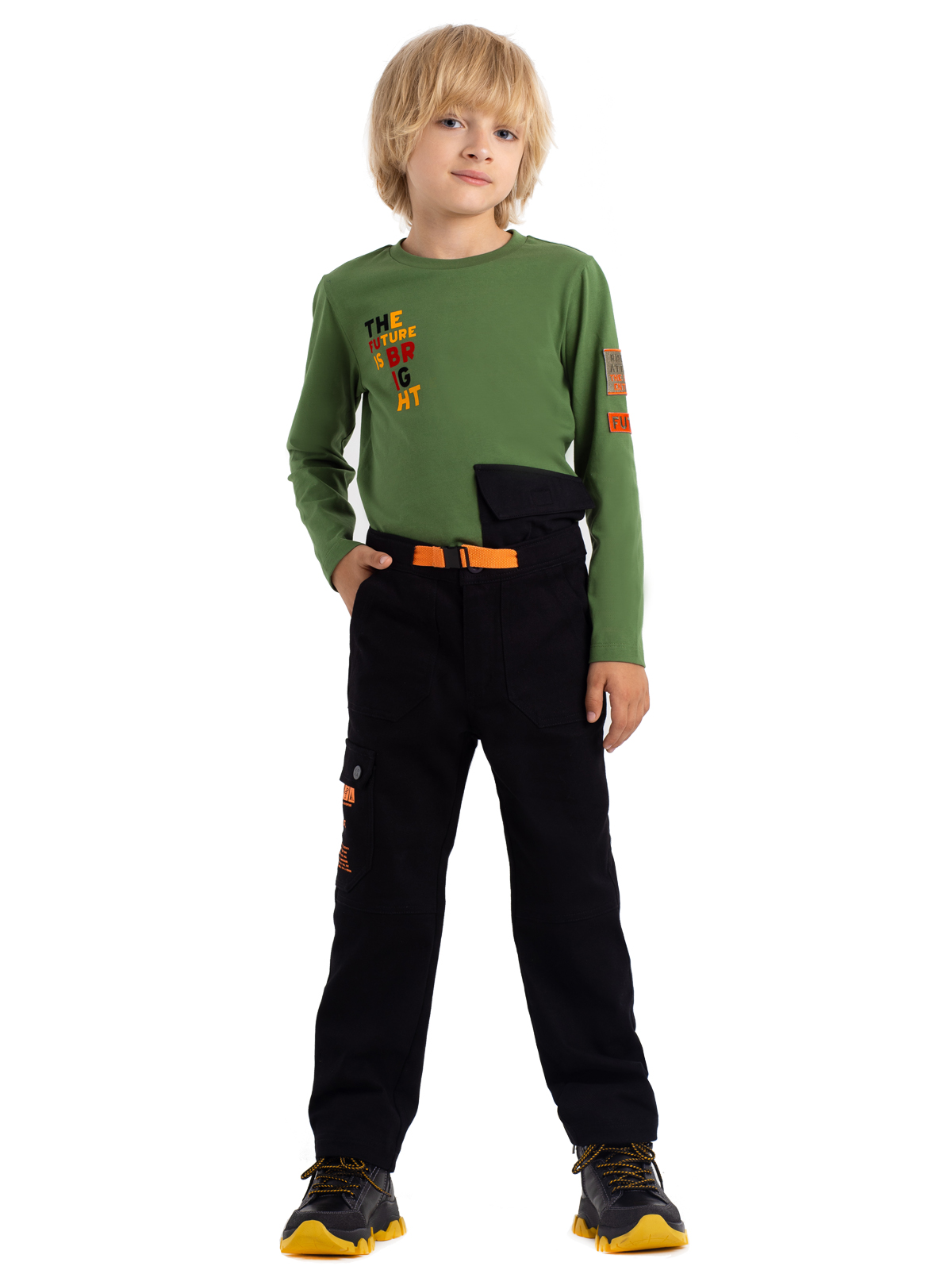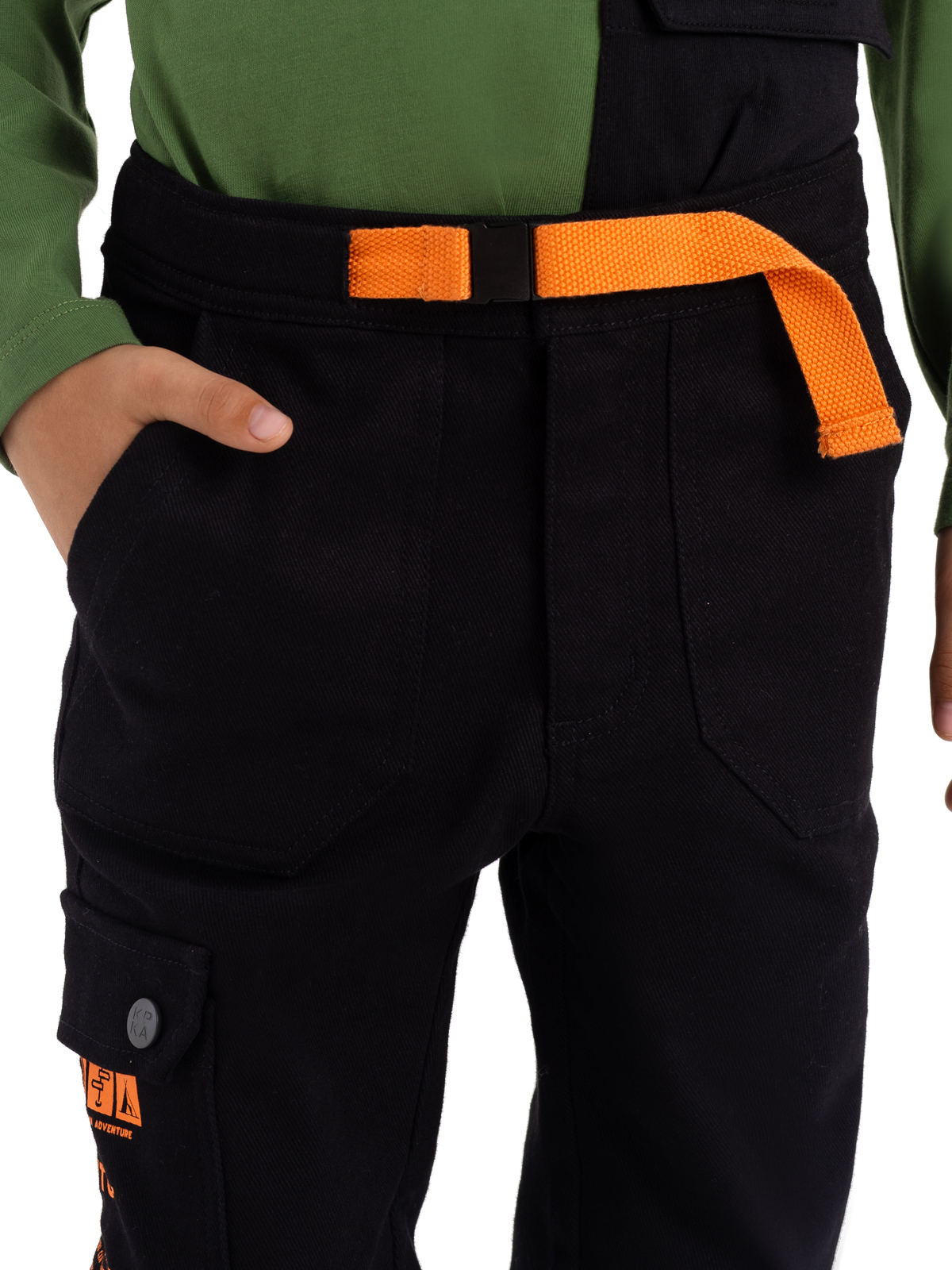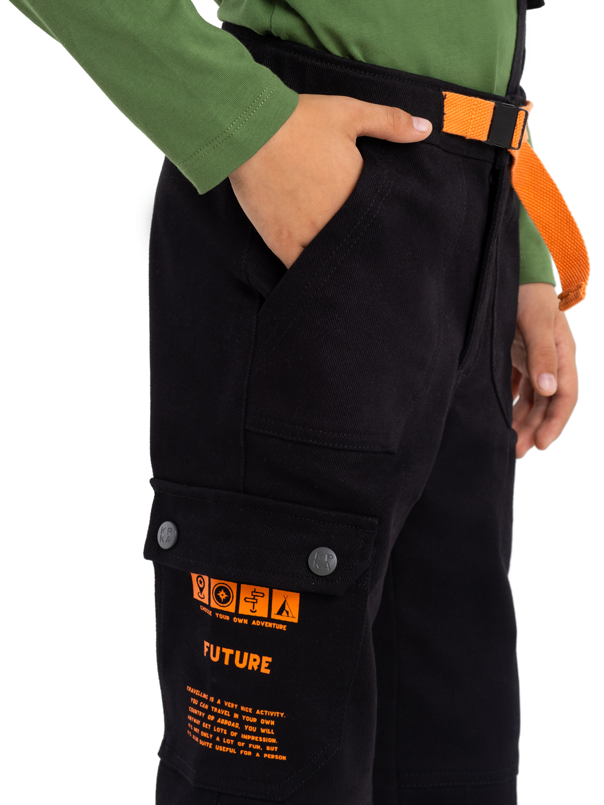 Брюки для мальчика классического кроя изготовлены из плотного хлопка темно-серого цвета. Брюки на резинке застегиваются на молнию и кнопку. Контрастный пояс с удобной пряжкой позволяет регулировать объем по талии ребенка. Дополнены тремя функциональными карманами - двумя передними и одним карго-карманом декорированным контрастным шрифтовым принтом.