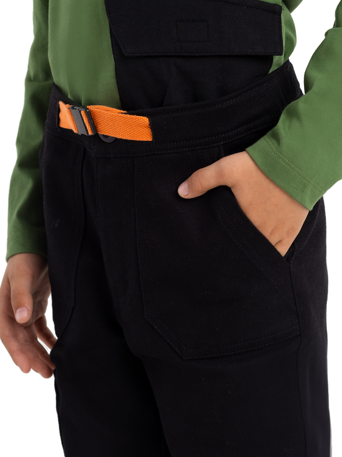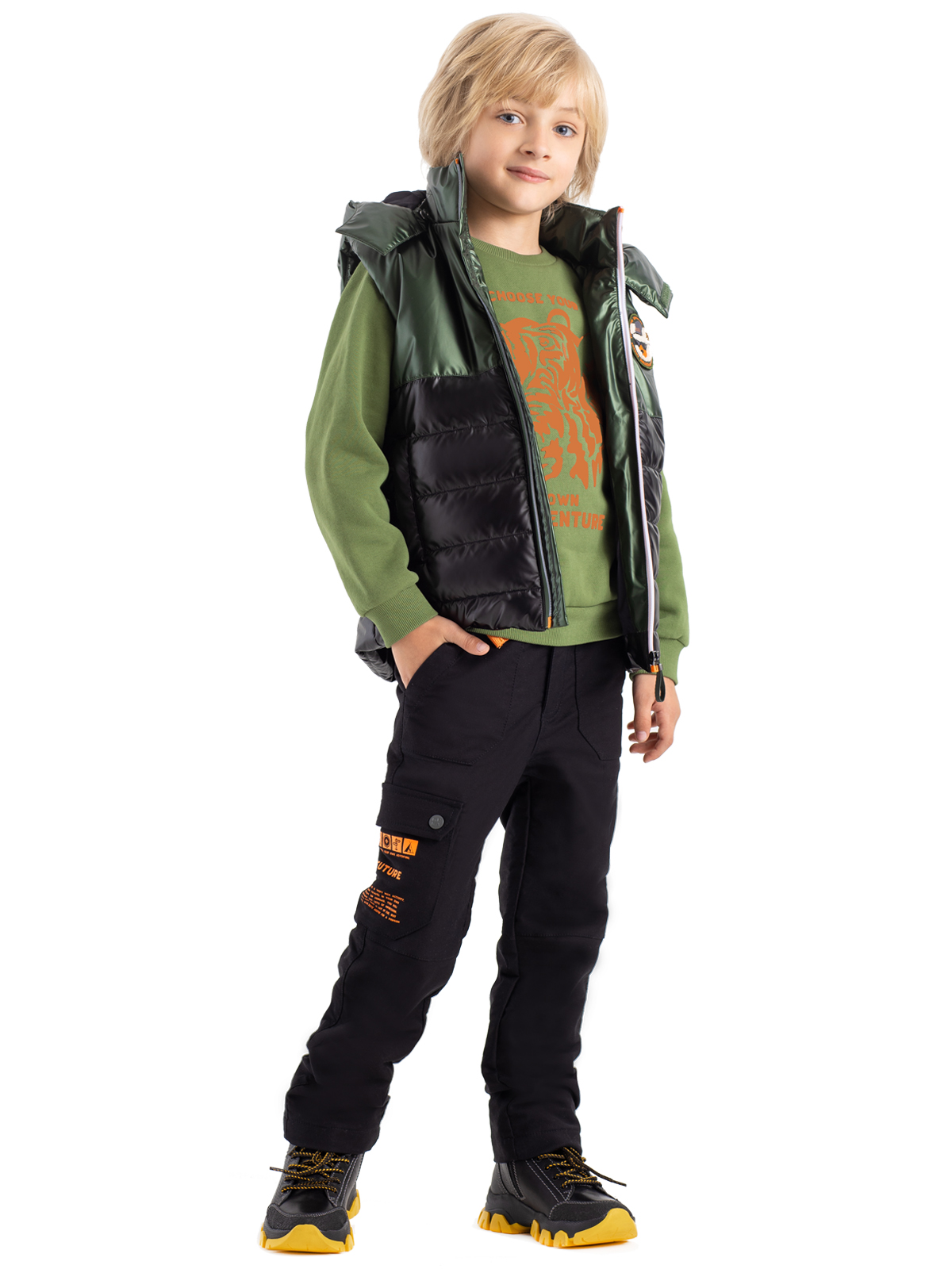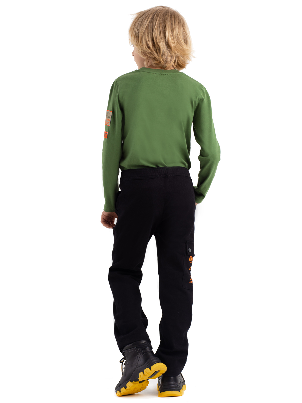 Брюки для мальчика классического кроя изготовлены из плотного хлопка темно-серого цвета. Брюки на резинке застегиваются на молнию и кнопку. Контрастный пояс с удобной пряжкой позволяет регулировать объем по талии ребенка. Дополнены тремя функциональными карманами - двумя передними и одним карго-карманом декорированным контрастным шрифтовым принтом.