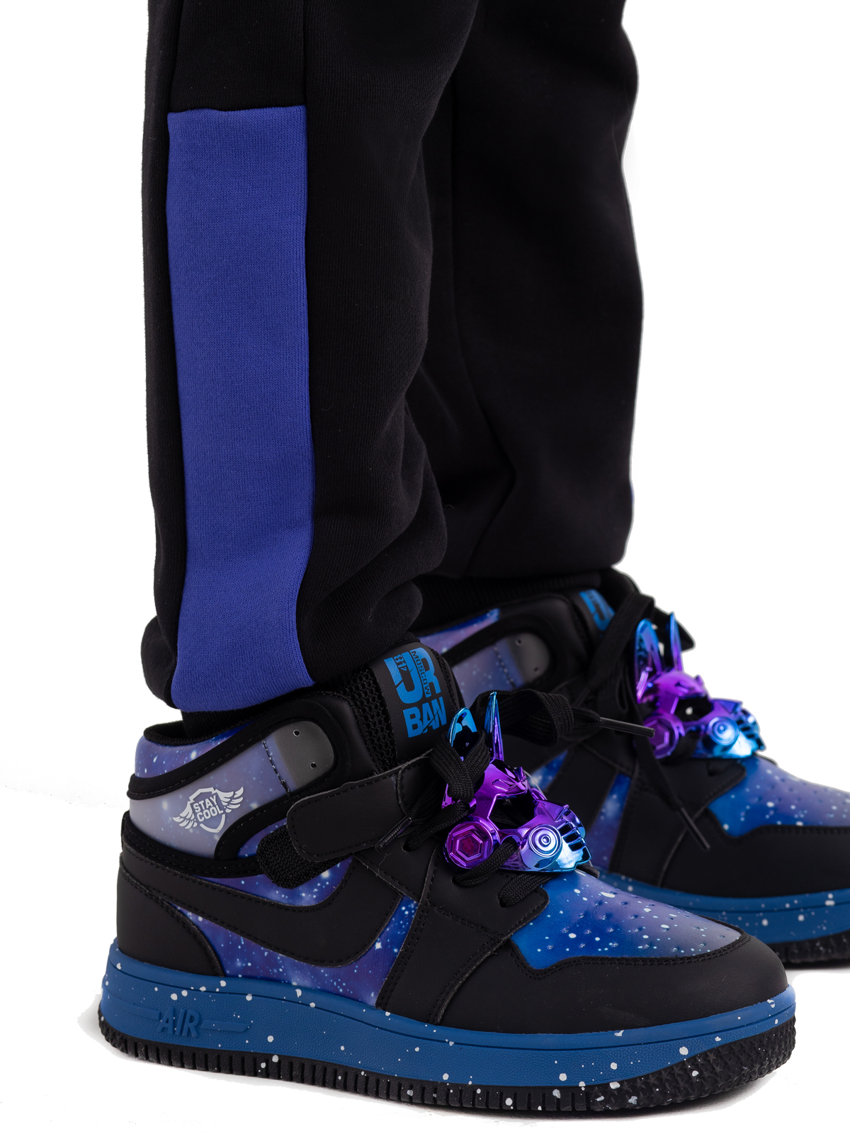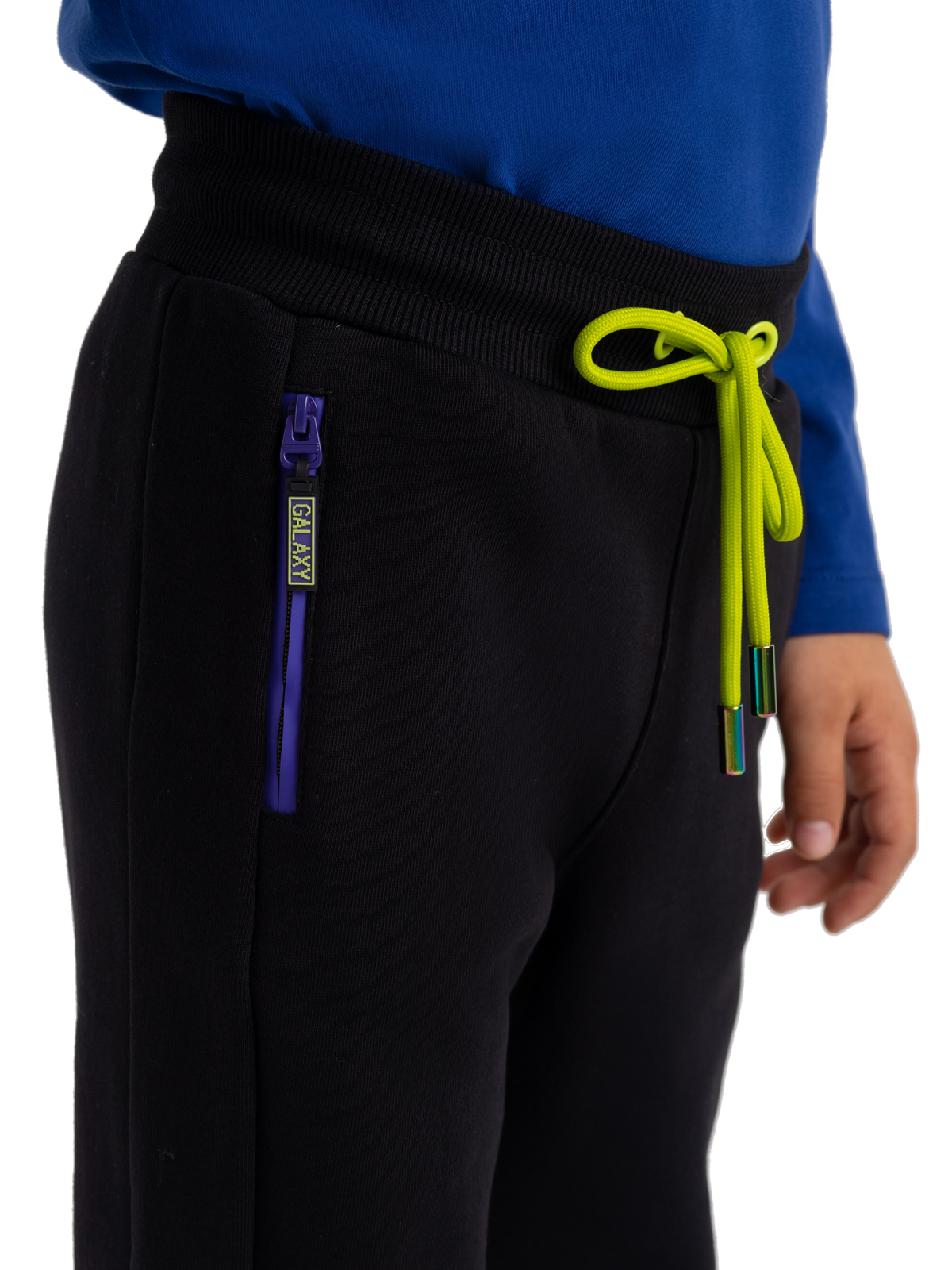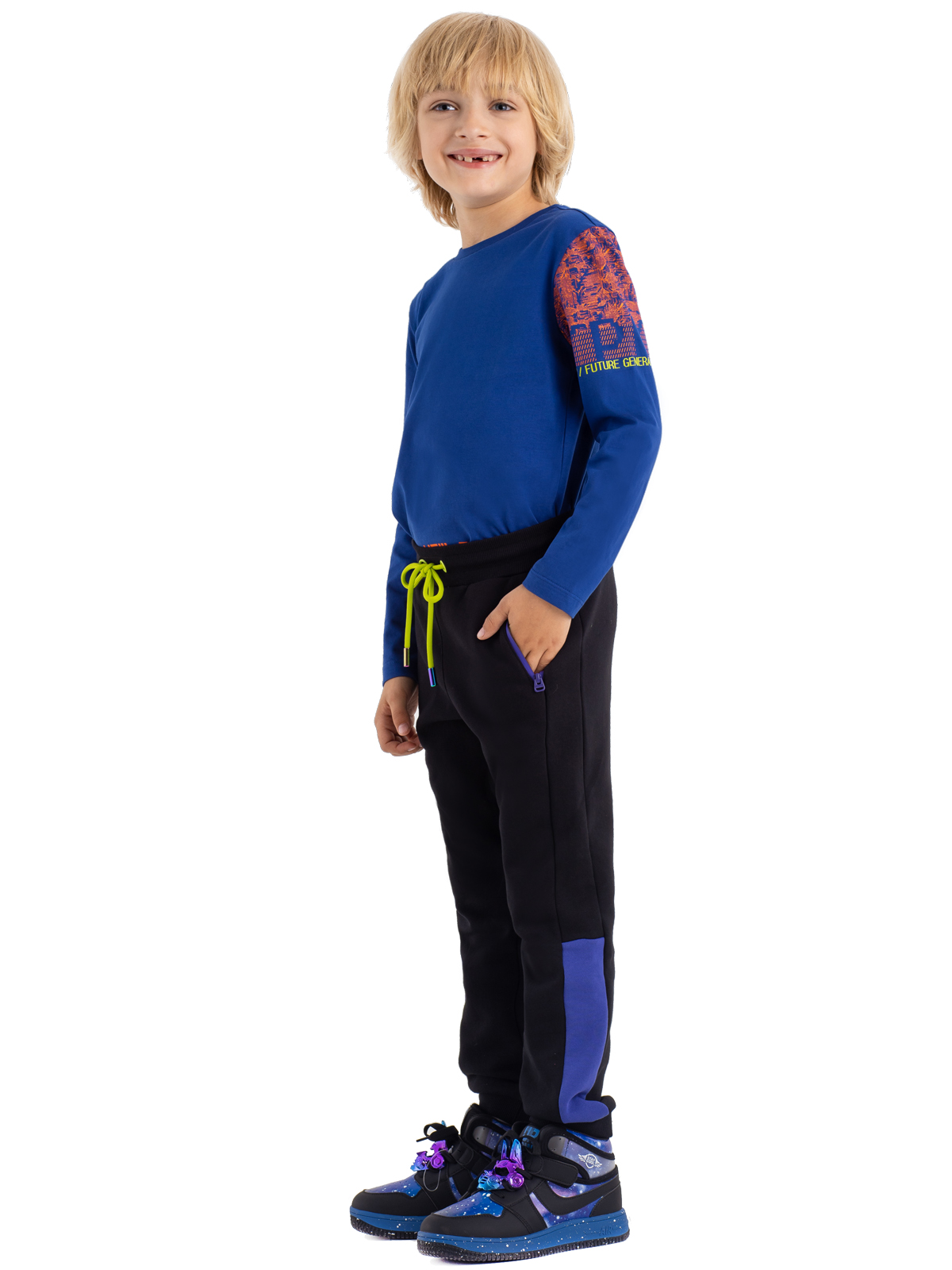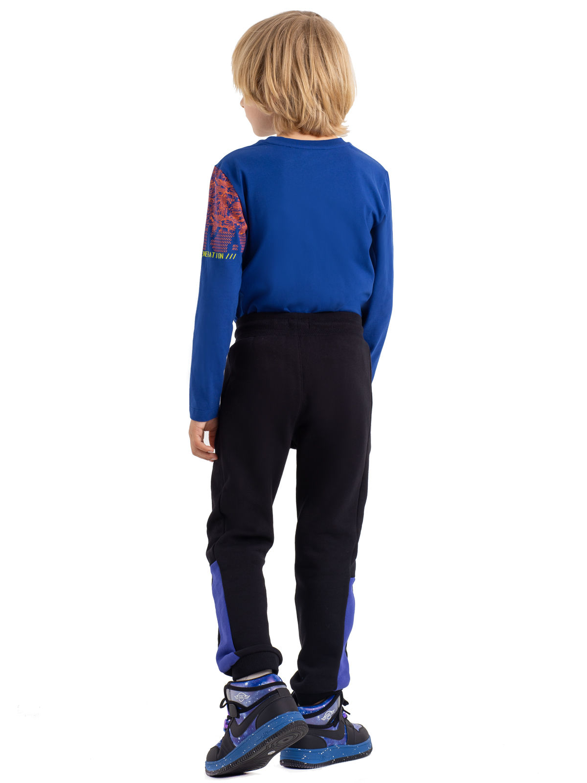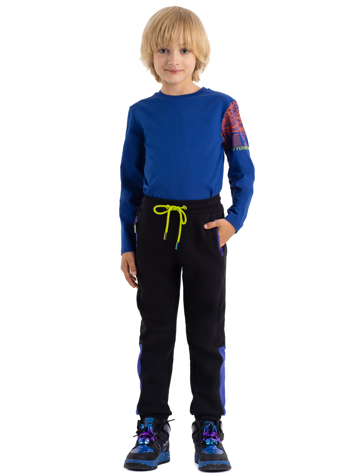 Спортивные брюки-джоггеры черного цвета для мальчика-подростка выполнены из мягкого, но прочного поликоттона. Талия брюк на резинке имеет удобный и стильный шнурок для регулировки объема. Модель имеет глубокие боковые карманы на молнии. Низ брюк выполнен на мягкой резинке и дополнен цветными вставками по бокам.