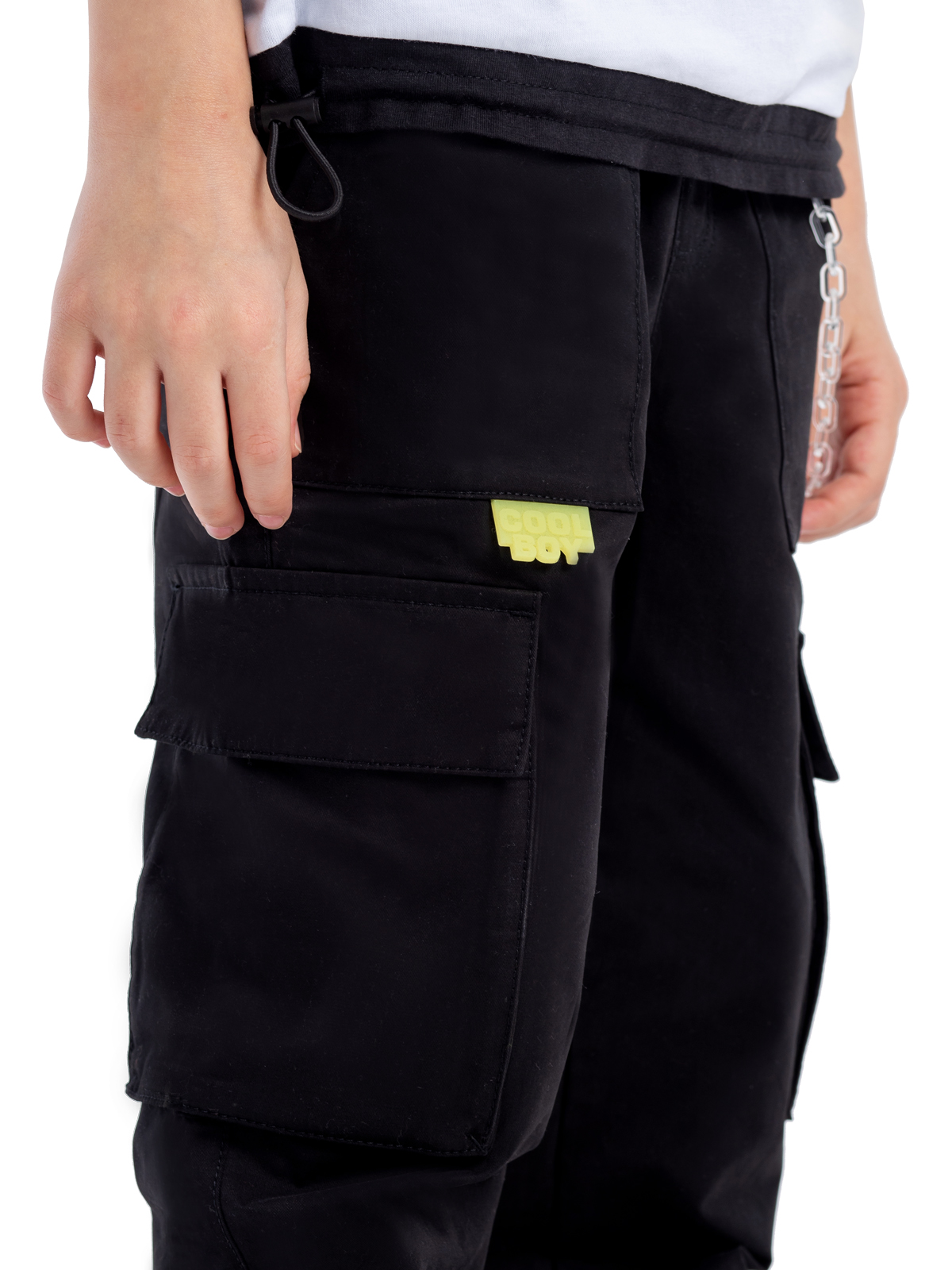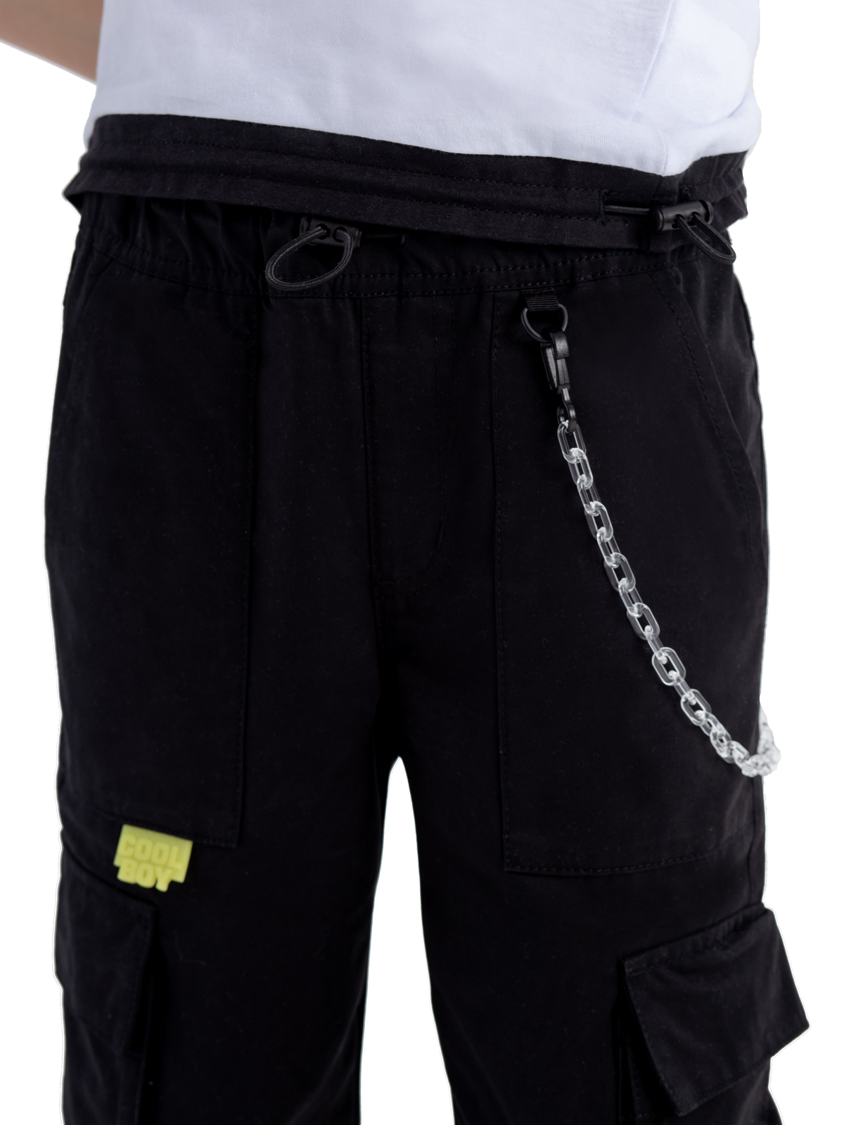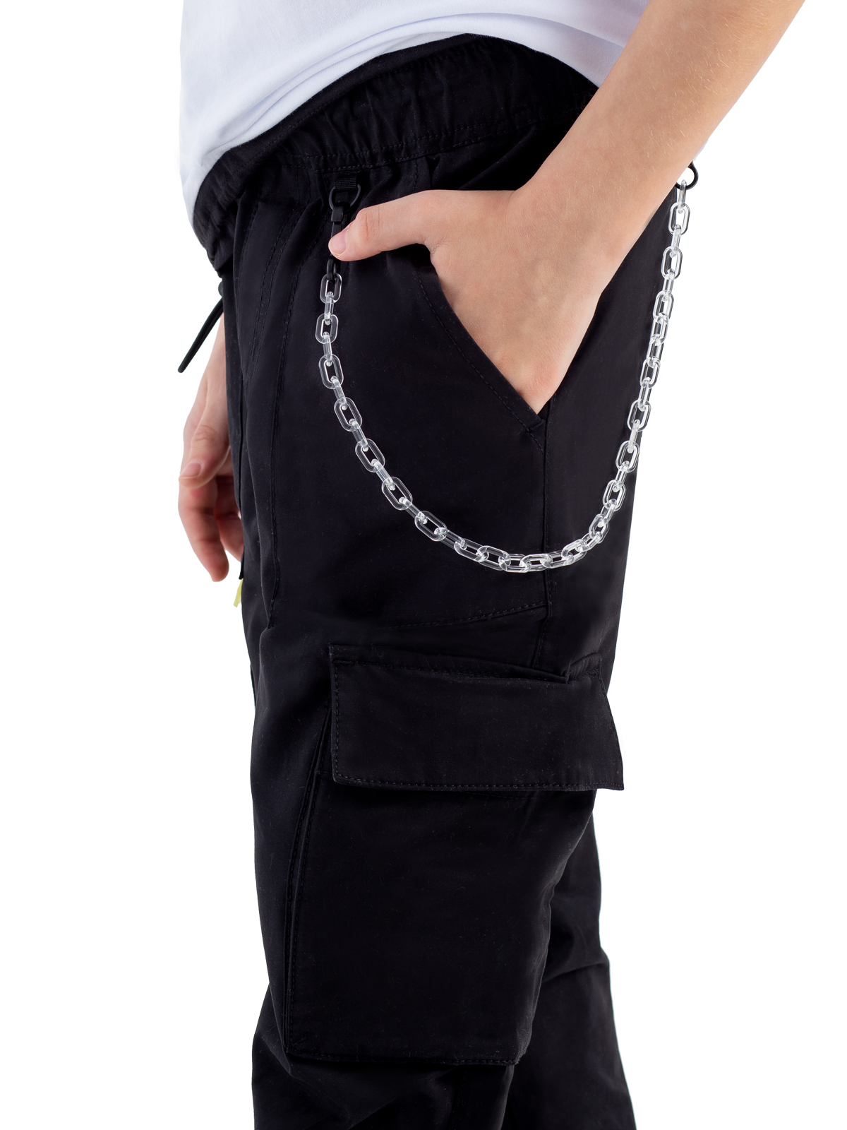 Практичные чёрные брюки из натурального 100% хлопка станут незаменимой вещью в гардеробе мальчика. Модель отличается продуманным дизайном и высоким качеством исполнения. Функциональные элементы включают удобные боковые карманы и два накладных кармана карго с практичными клапанами для безопасного хранения вещей. Особую изюминку модели придаёт контрастный ярко-жёлтый патч, а отстёгивающаяся цепь добавляет современный акцент. Натуральный хлопок обеспечивает отличную воздухопроницаемость и комфорт при носке. Универсальный чёрный цвет позволяет легко комбинировать брюки с любой одеждой. Модель прекрасно подойдёт как для активного отдыха, так и для повседневной носки, сочетая в себе практичность и стильный внешний вид.
