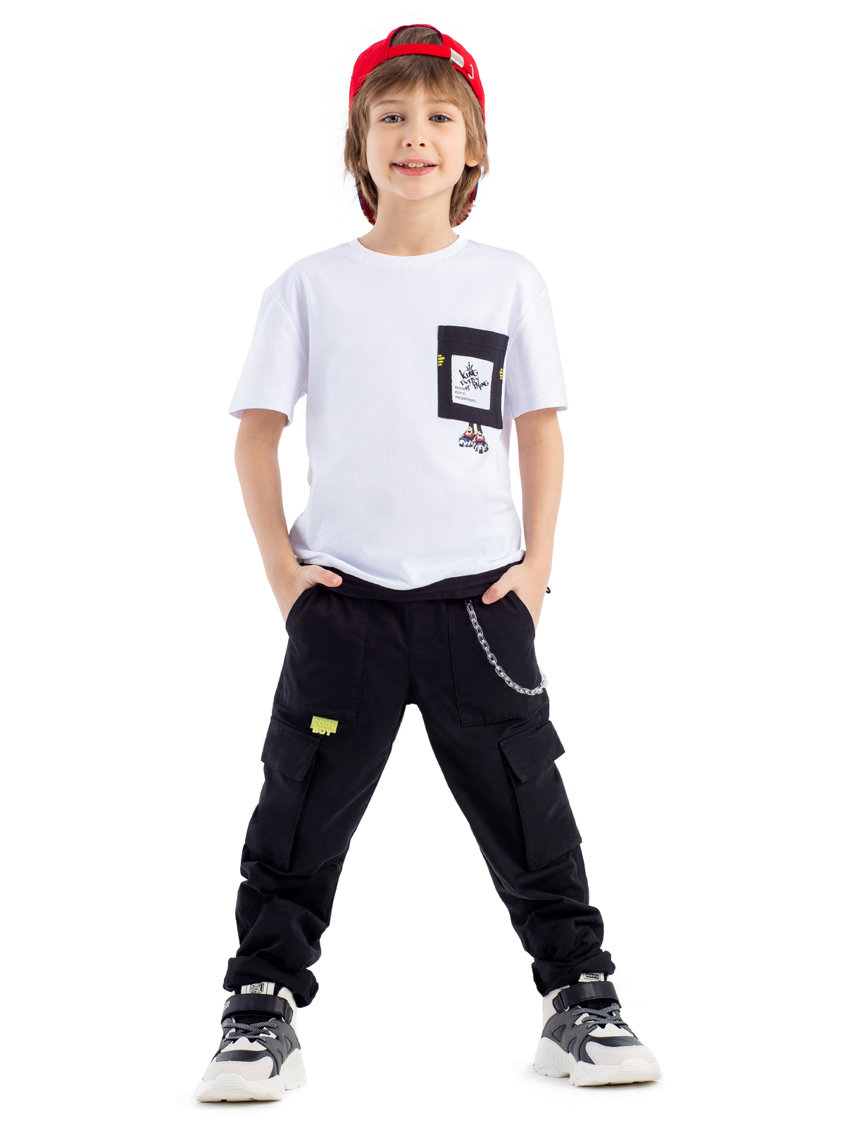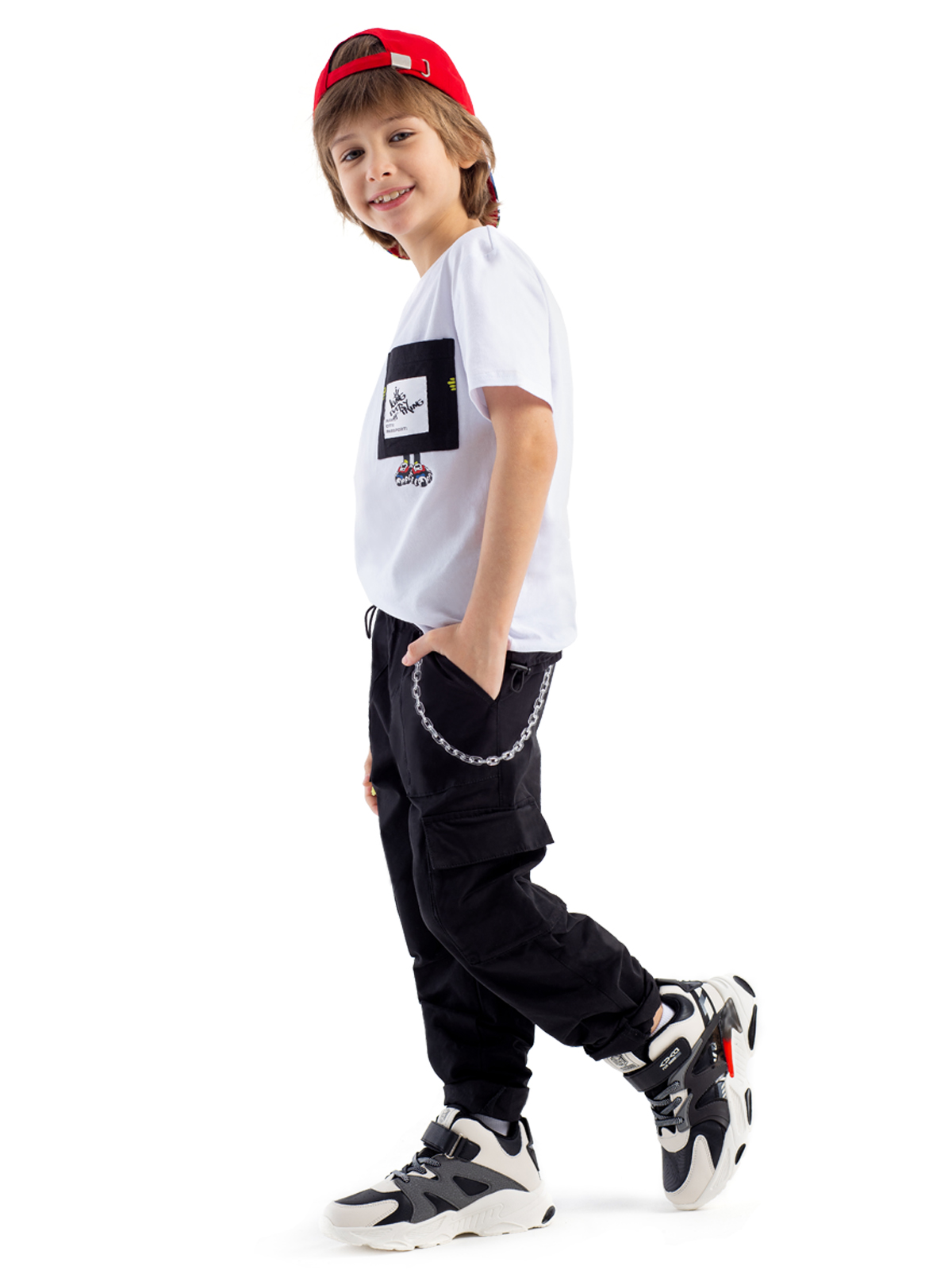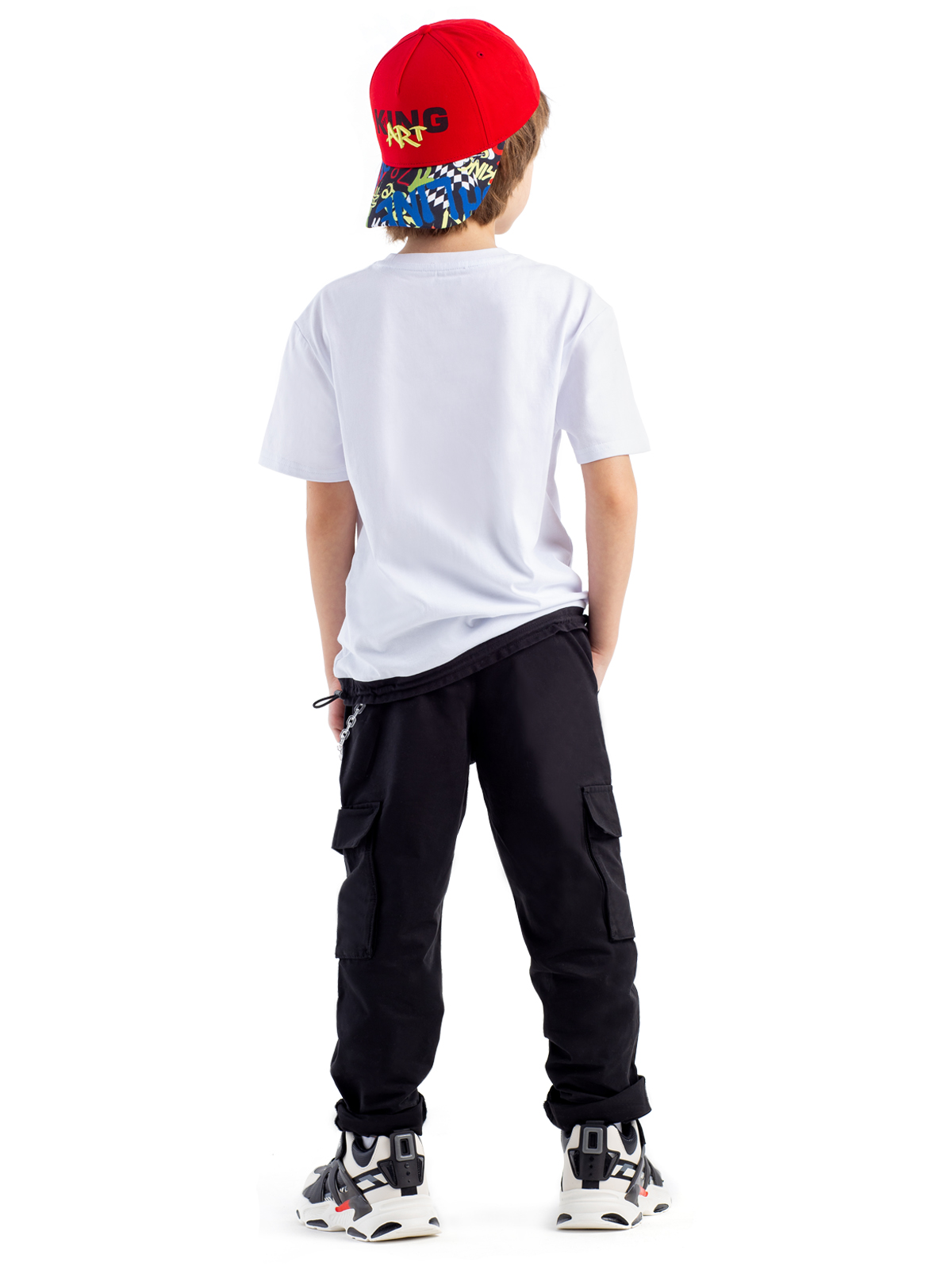 Практичные чёрные брюки из натурального 100% хлопка станут незаменимой вещью в гардеробе мальчика. Модель отличается продуманным дизайном и высоким качеством исполнения. Функциональные элементы включают удобные боковые карманы и два накладных кармана карго с практичными клапанами для безопасного хранения вещей. Особую изюминку модели придаёт контрастный ярко-жёлтый патч, а отстёгивающаяся цепь добавляет современный акцент. Натуральный хлопок обеспечивает отличную воздухопроницаемость и комфорт при носке. Универсальный чёрный цвет позволяет легко комбинировать брюки с любой одеждой. Модель прекрасно подойдёт как для активного отдыха, так и для повседневной носки, сочетая в себе практичность и стильный внешний вид.