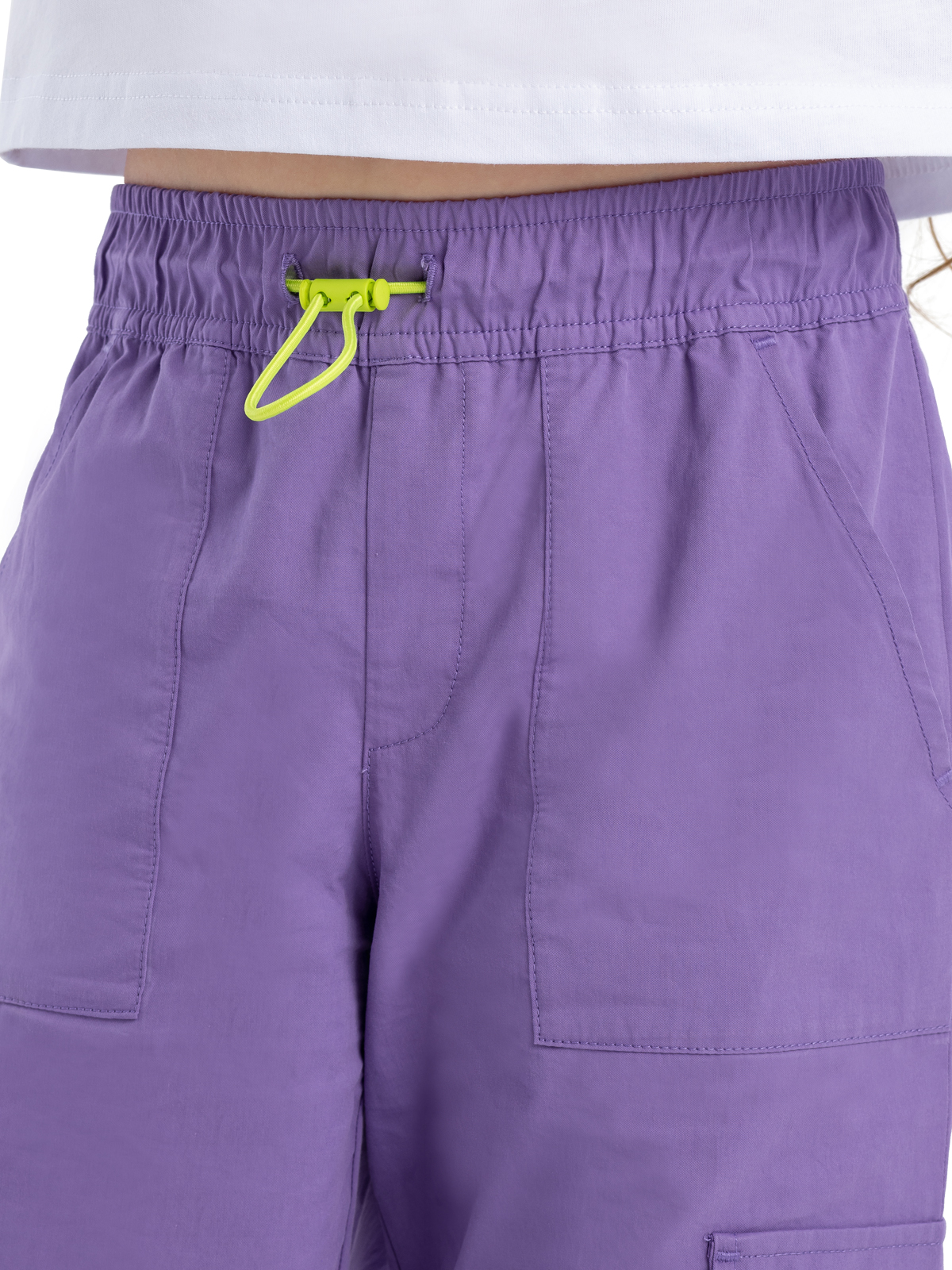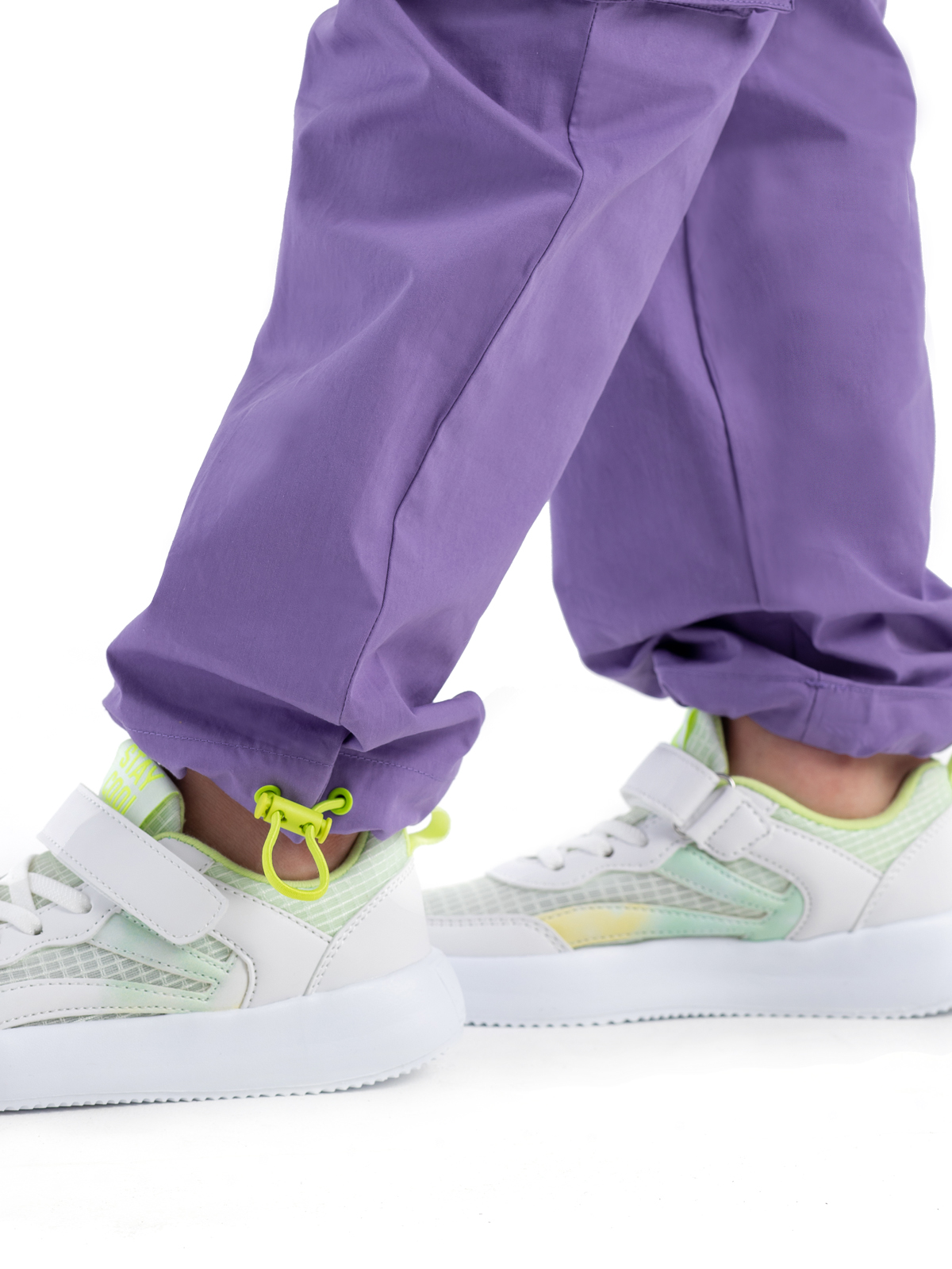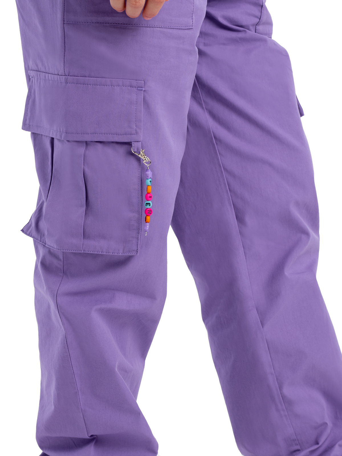 Модные и удобные брюки-джоггеры выполненны в красивом фиолетовом цвете, станут отличным выбором для летних дней. Карго-карманы и глубокие боковые карманы обеспечивают достаточно места для хранения различных мелочей. Стильный съемный брелок с яркими бусинами делает образ еще более индивидуальным, а яркая фурнитура подчеркивает стиль. Без застежки и с талией на резинке, эти джоггеры легко надеваются и обеспечивают комфортную посадку. Регулирующий шнурок на талии и в манжетах позволяет регулировать размер и подойдет на любую фигуру. Созданные специально для активных и стильных девочек, эти брюки станут незаменимым элементом гардероба.