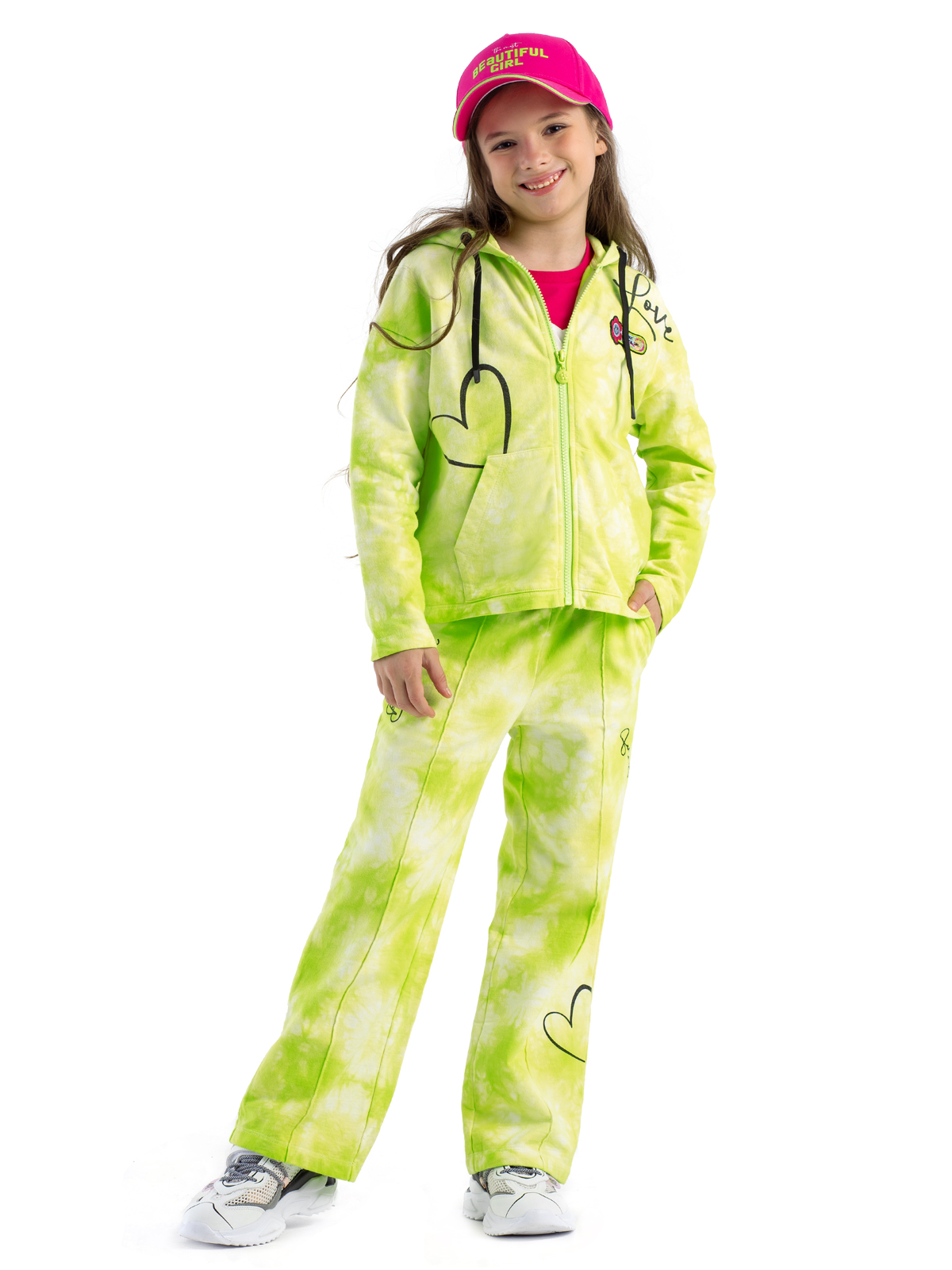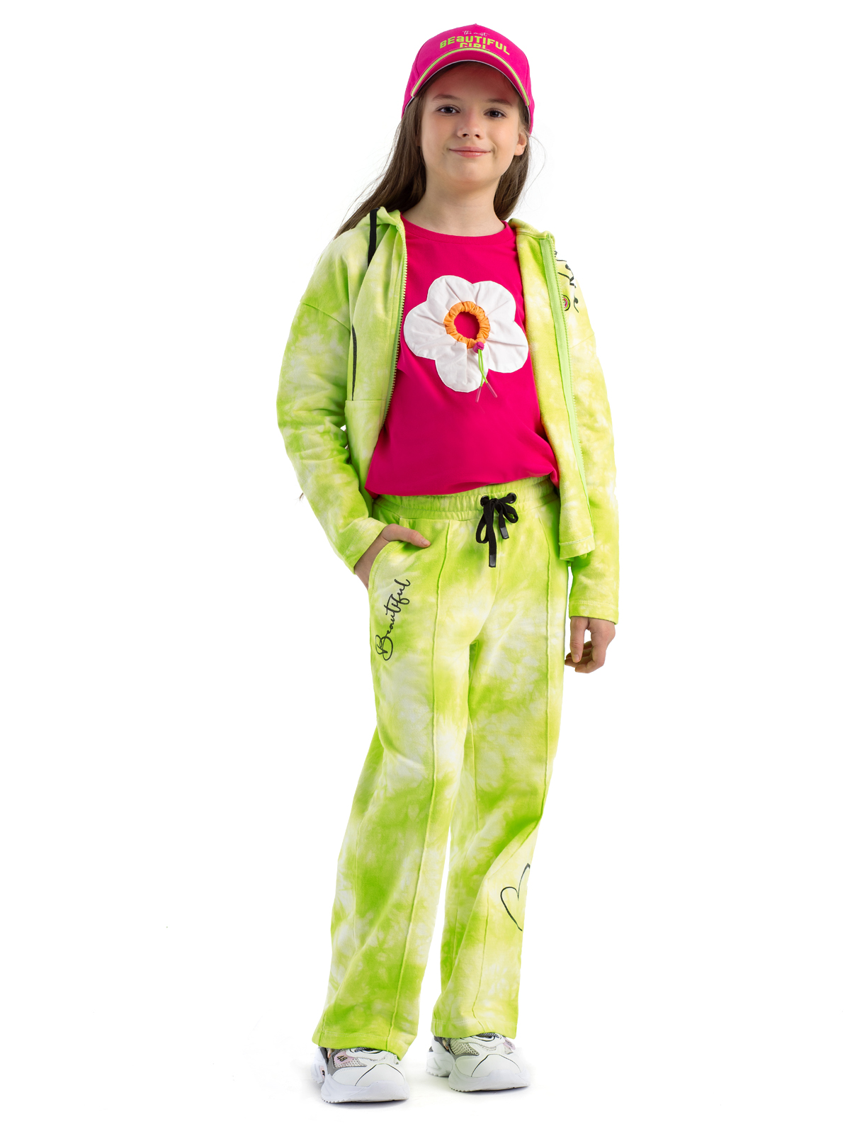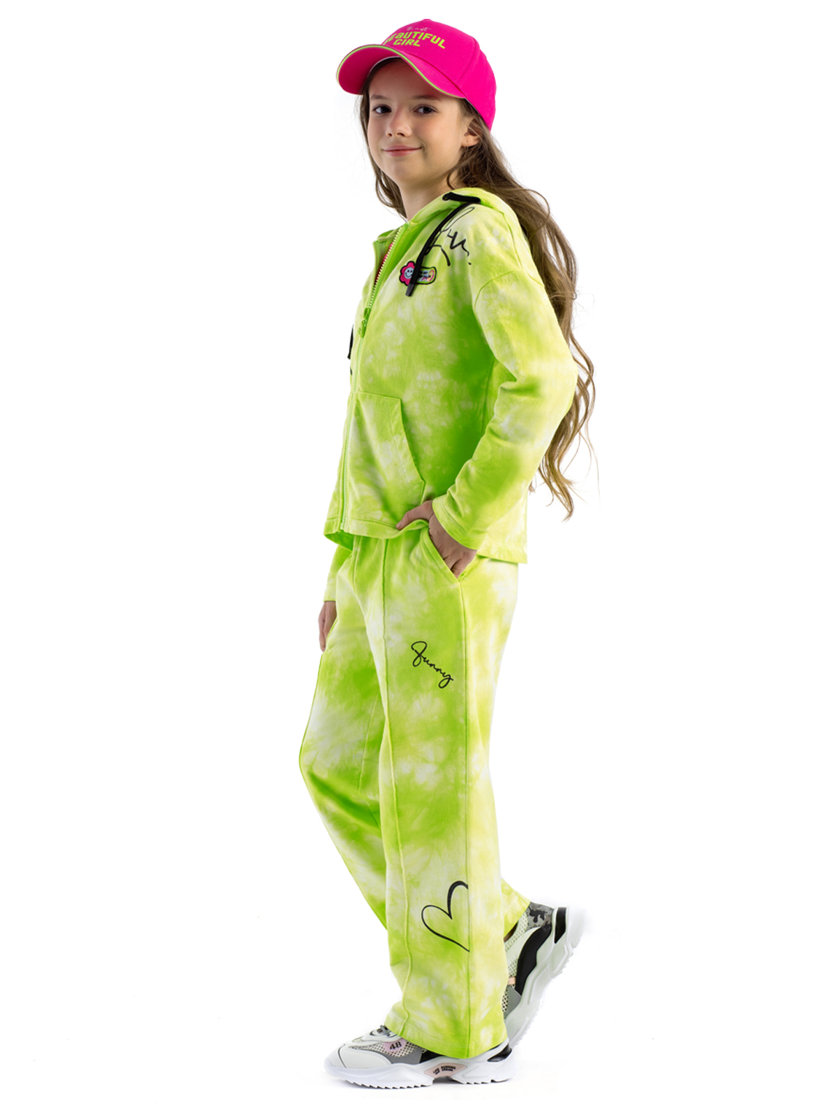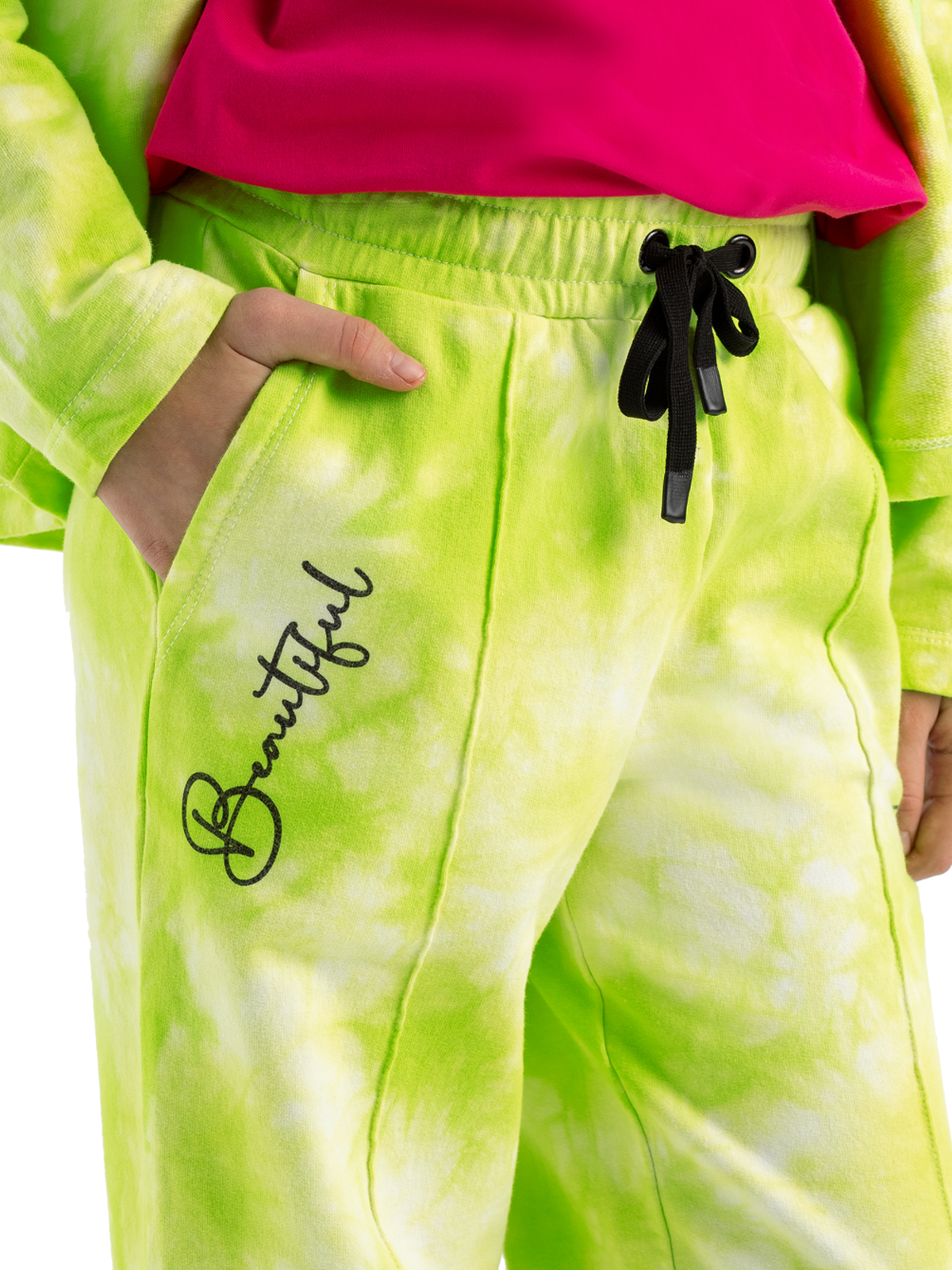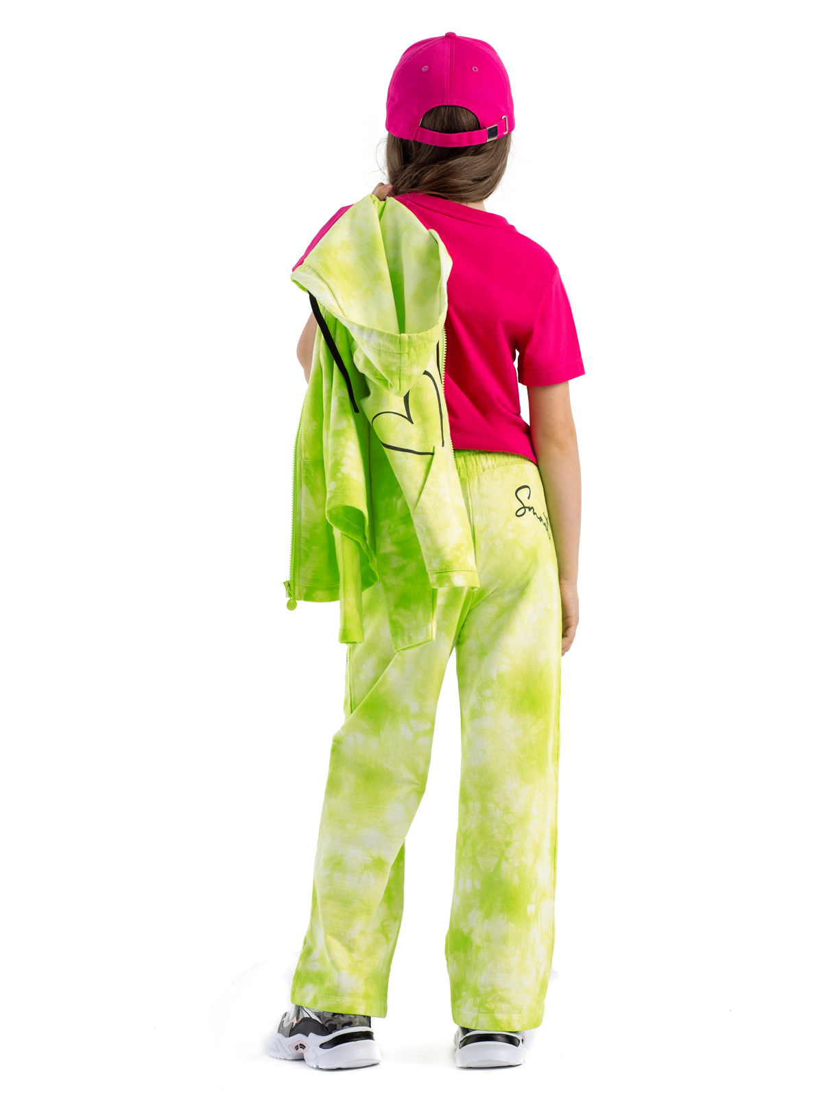 Трендовые трикотажные брюки из высококачественного хлопка выполнены в технике "tie dye", что делает каждую пару уникальной и неповторимой. Брюки на резинке имеют функциональные карманы, дополнены контрастным шнурком для регулировки по талии. Акцентированы контрастным принтом, а также застроченными "стрелками" по переду брючин.