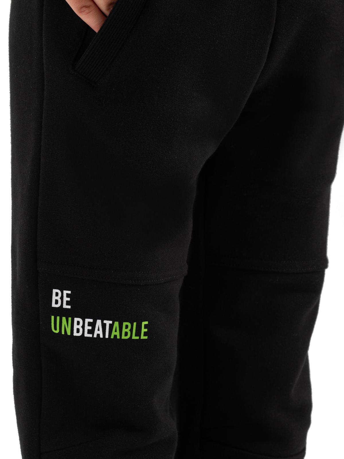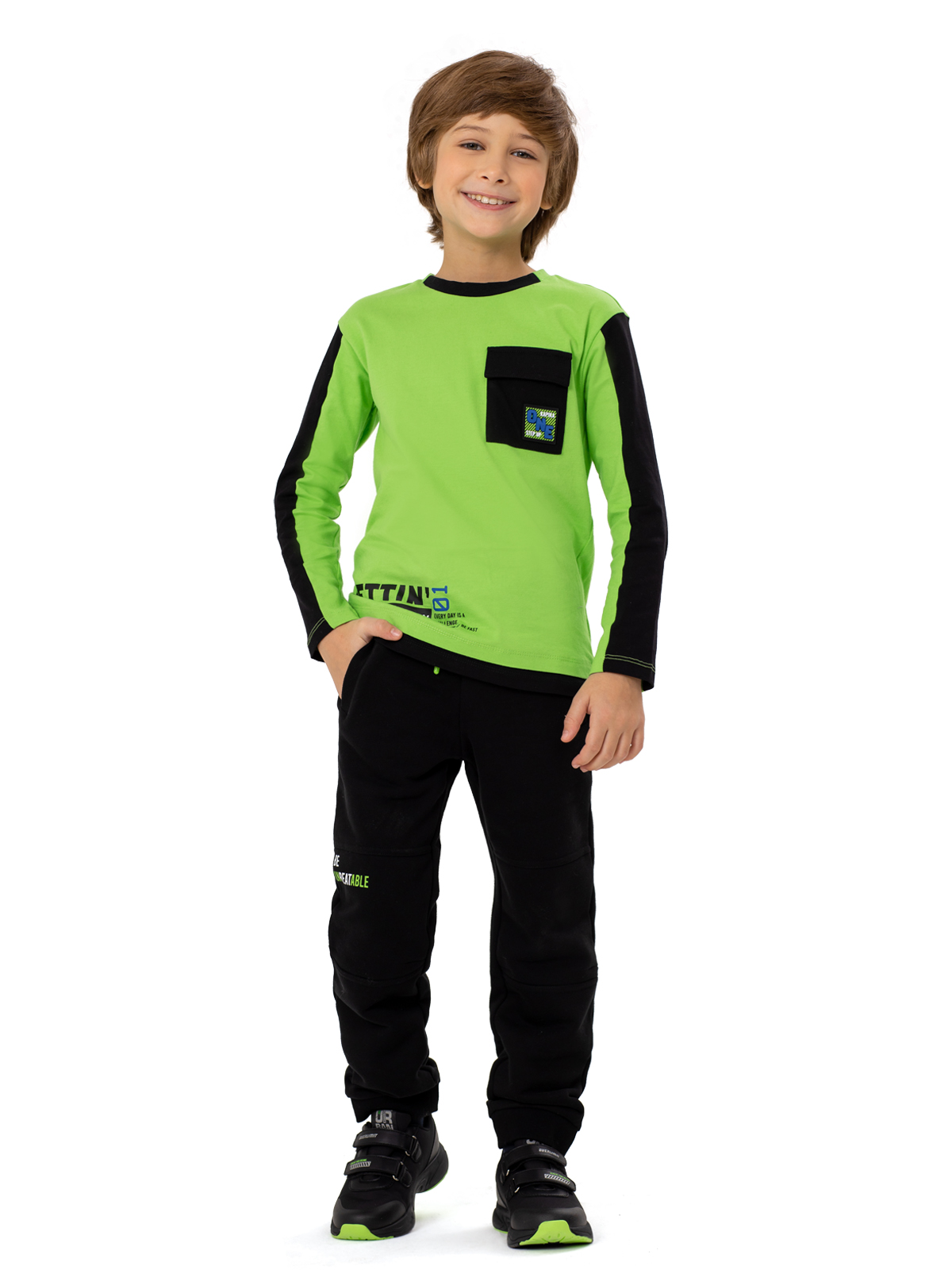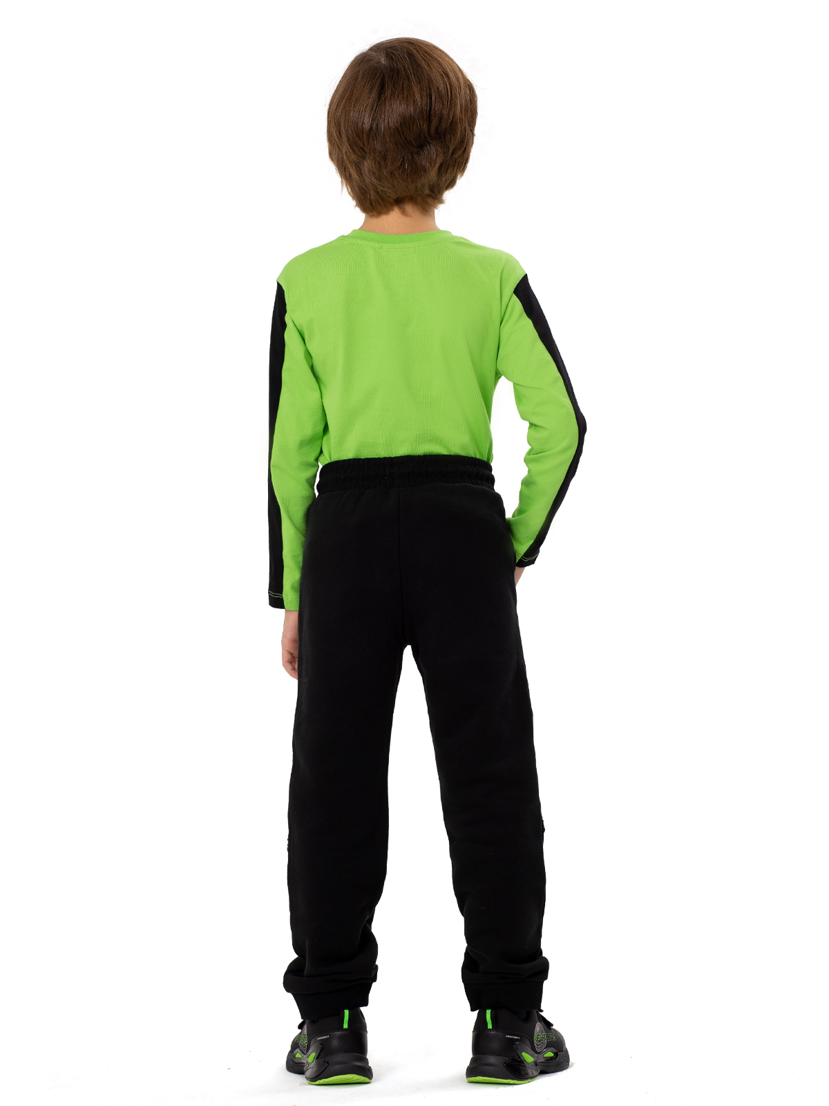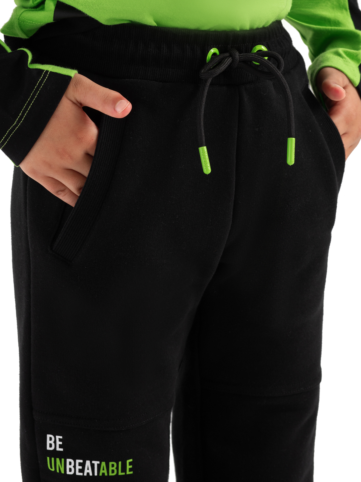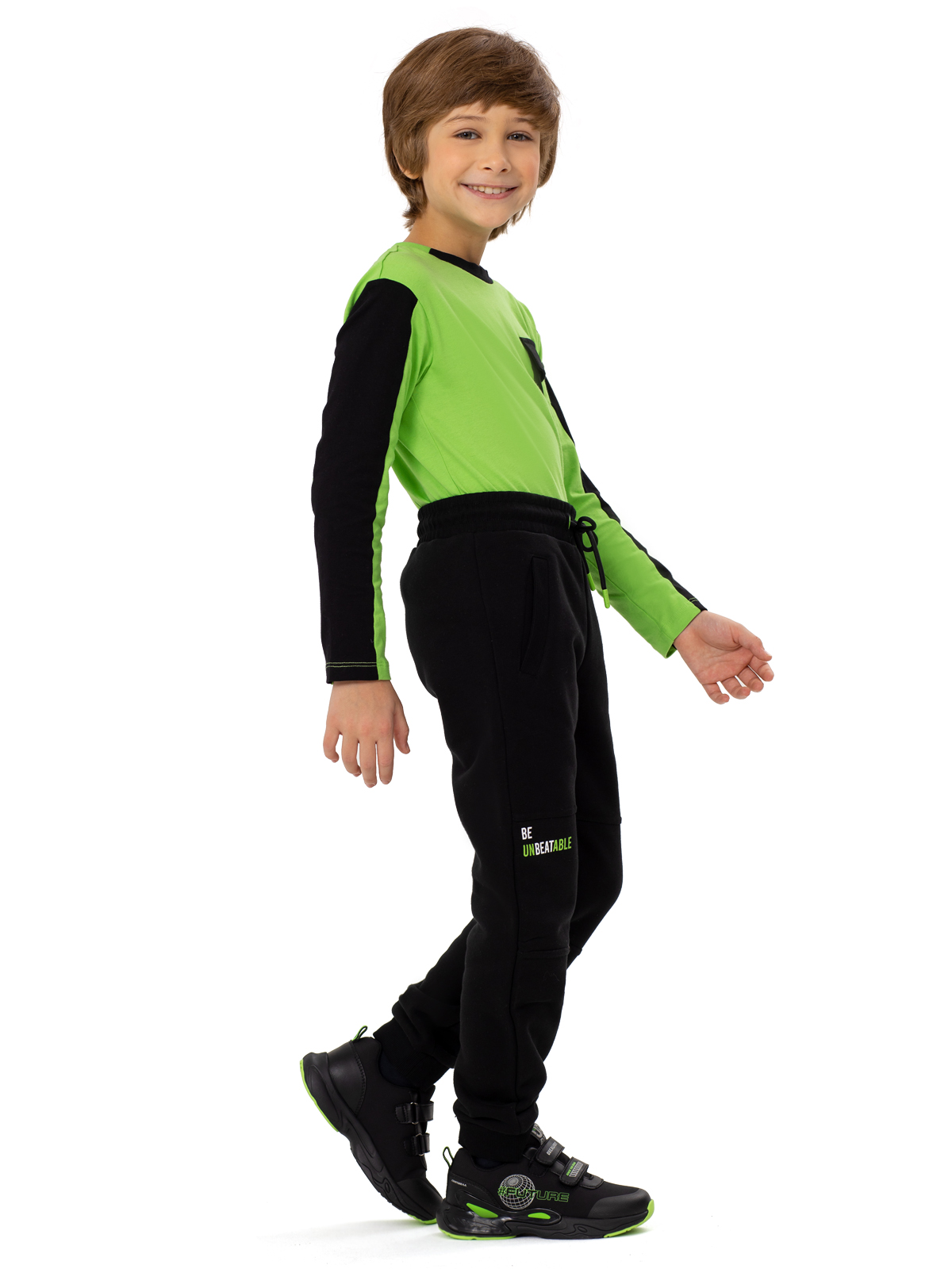 Универсальные спортивные брюки для мальчика в чёрном цвете с яркими акцентами станут отличным дополнением гардероба. Модель выполнена из комфортного материала — смеси хлопка с полиэстером, что обеспечивает отличную посадку и свободу движений. Дизайн дополняют контрастная жёлтая фурнитура и стильный принт на колене, создающие современный спортивный образ. Два удобных боковых кармана позволяют хранить необходимые мелочи. Практичная конструкция включает пояс на резинке с завязывающимся шнурком для комфортной посадки и эластичные рибы по низу брючин, которые защищают от попадания пыли и сохраняют тепло. Модель идеально подходит как для занятий спортом, так и для повседневной носки.