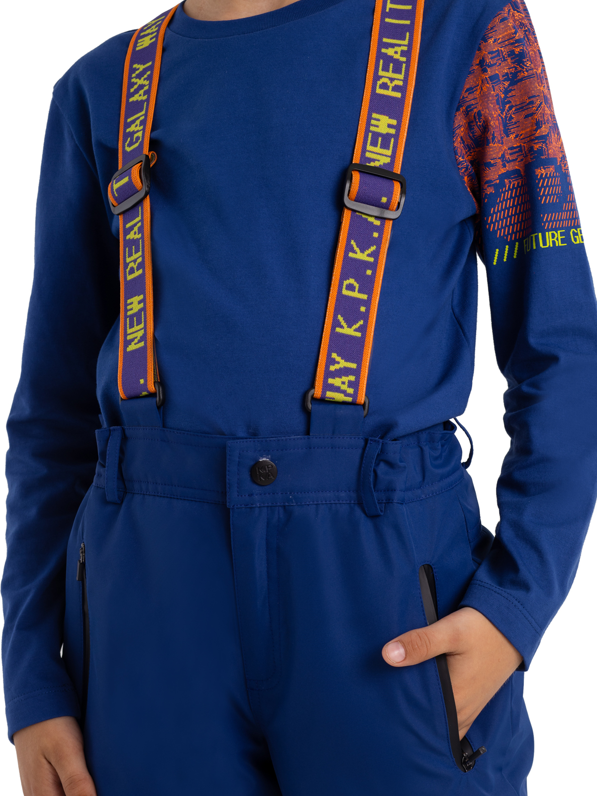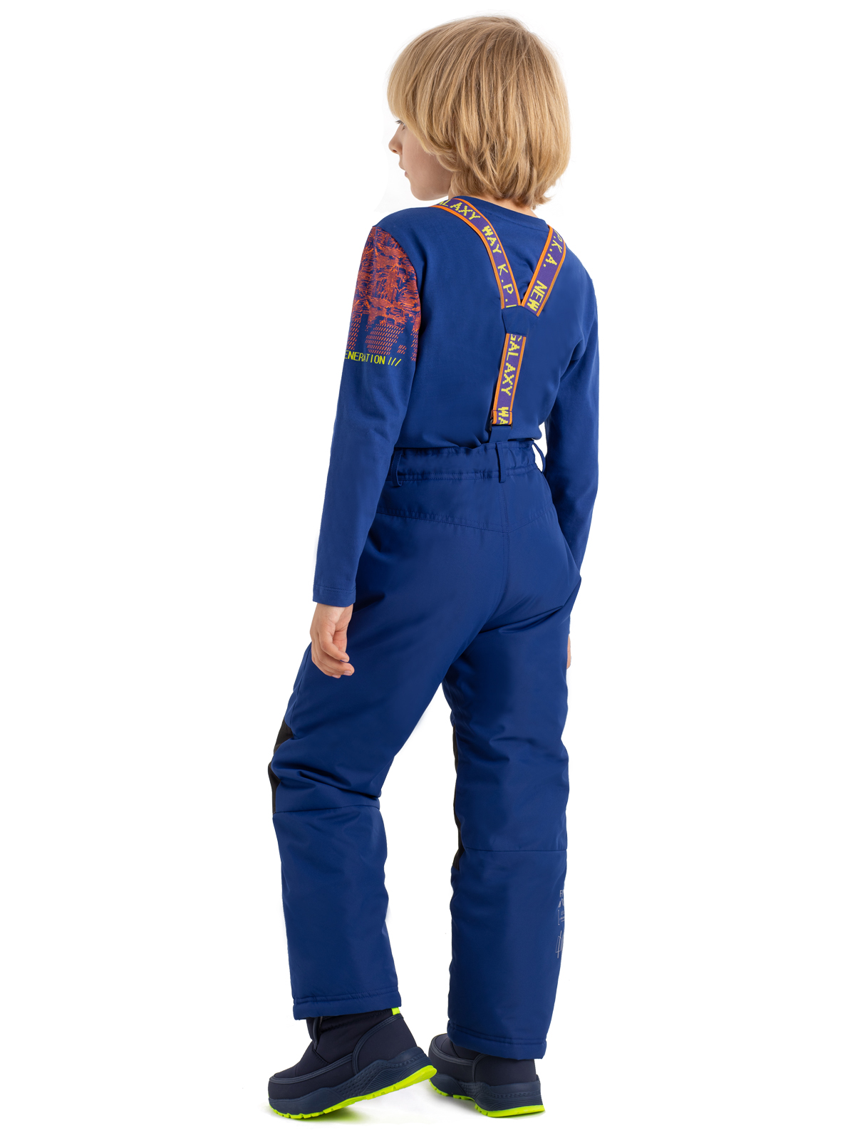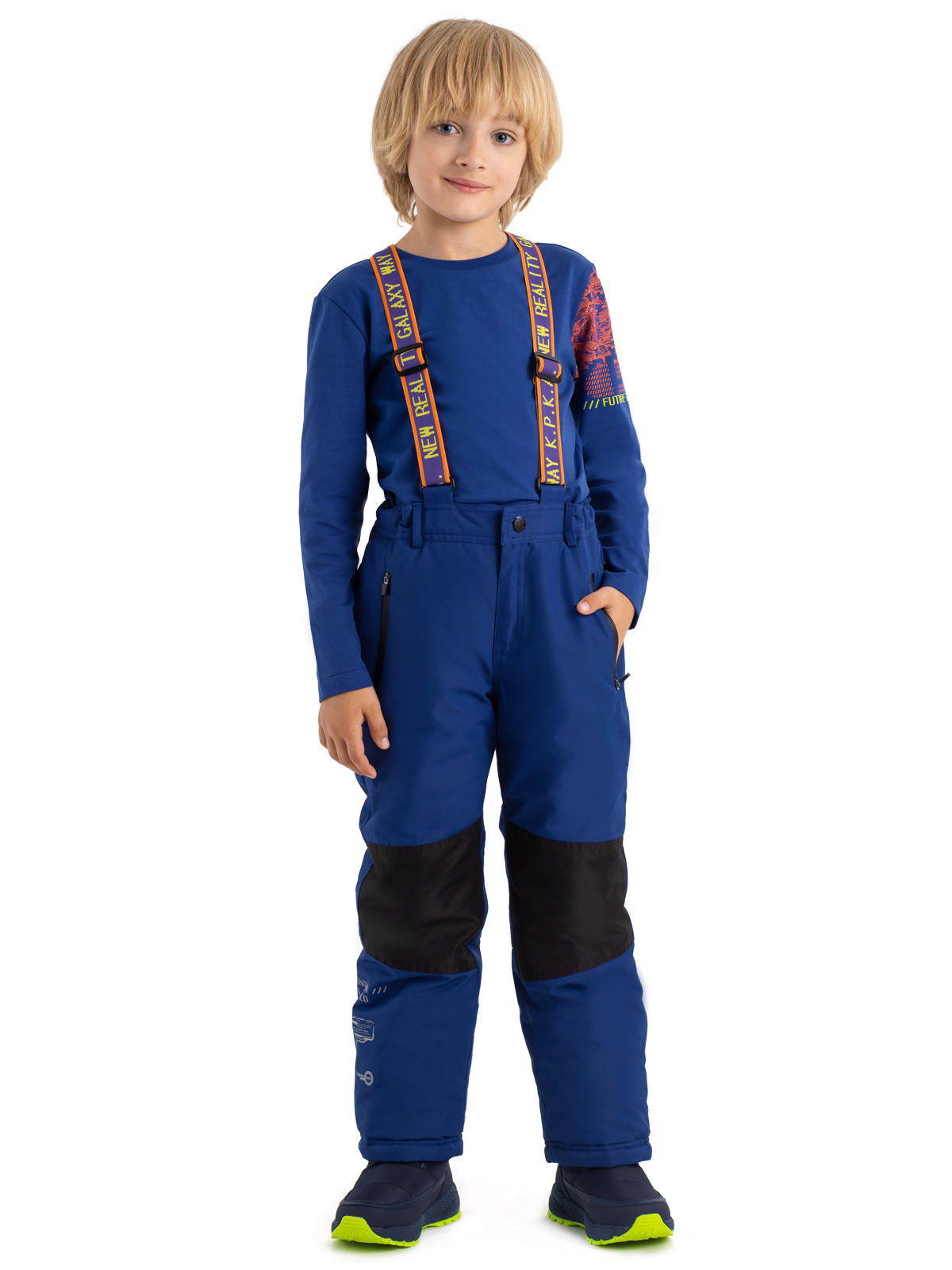 Утепленные брюки с синтепоном 200г/м2 прямого силуэта надежно защищают от мороза. Мембранная ткань 5000мм/5000г/м2/24ч не дает ребенку промокнуть. Модель с регулируемыми яркими бретелями из эластичной жаккардовой тесьмы. Водостойкие контрастные молнии. Вставки из прочной ткани «Оксфорд» на коленях. Регулируемый пояс на резинке. Штаны оснащены специальной подкладкой и ветрозащитной манжетой на резинке с латексом, защищающей кожу от низких температур, ветра и попадания снега. Светоотражающий декоративный принт по низу изделия обеспечивают защиту ребенка в темное время суток.