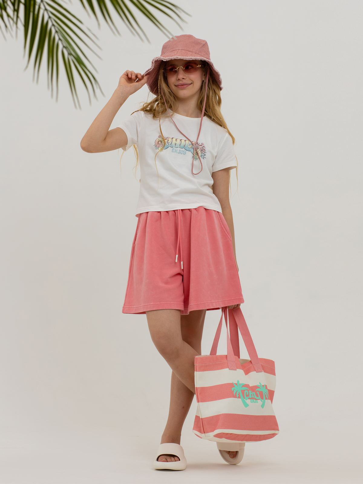 Футболка с принтом для девочек - универсальная вещь в гардеробе. Свободный прямой крой со спущенной линией плеча обеспечивает легкость движений и естественный силуэт. Круглый вырез горловины и короткие рукава добавляют изделию практичности.