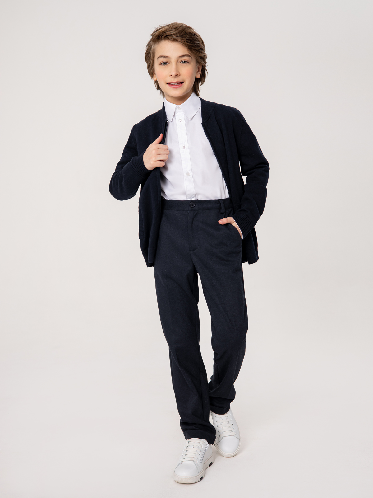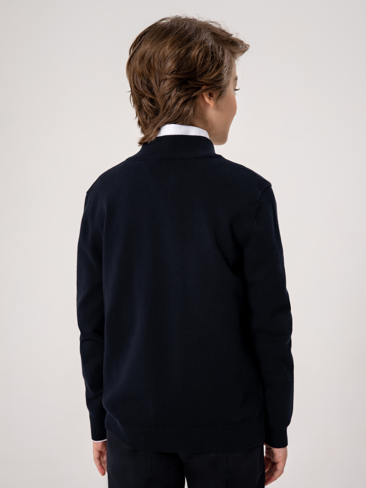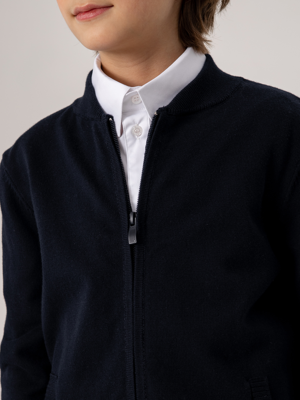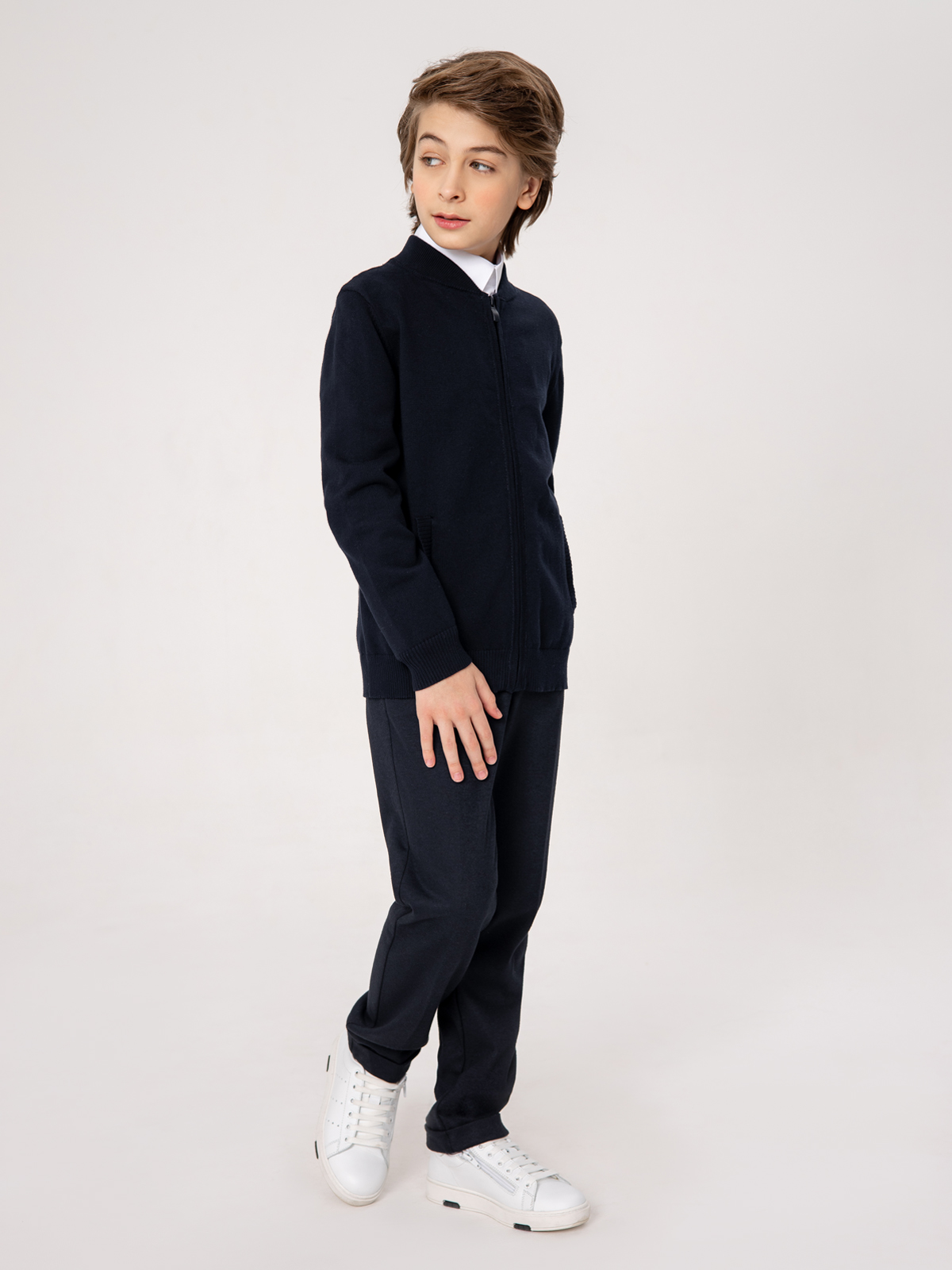 Синий вязаный кардиган – стильная комфортная классика школьного гардероба мальчика. Кардиган связан гладью из мягкой пряжи хлопка с нейлоном. Добавление нейлона придает мягкость и износостойкость изделию. Пряжа приятна тактильно, не скатывается. Кардиган для школы имет 2 боковых кармана, застегивается на молнию.