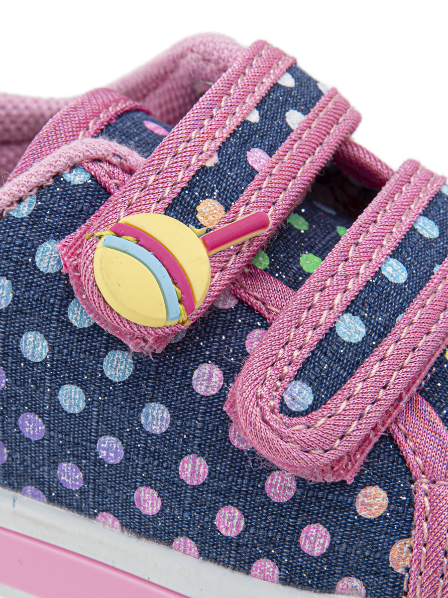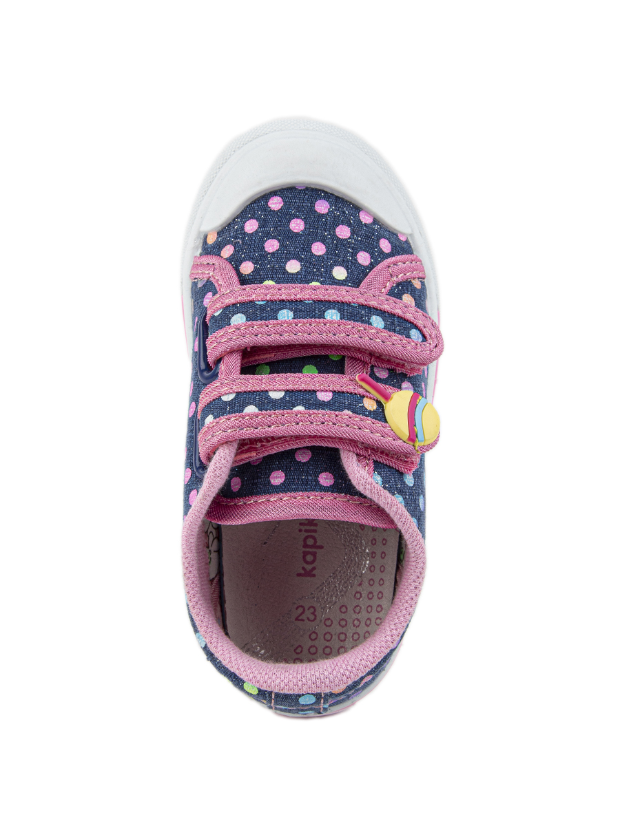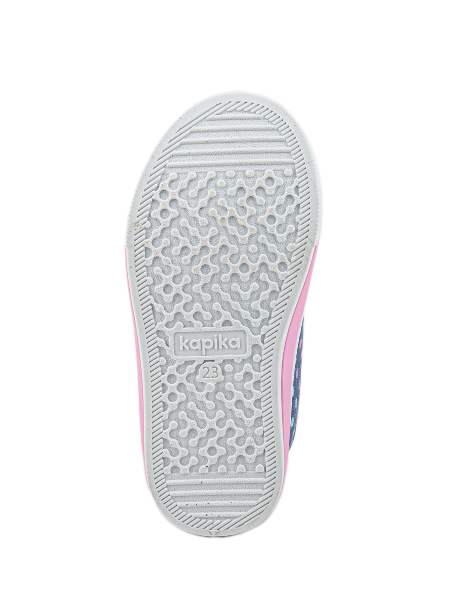 Кеды из плотного хлопка с ярким принтом и разноцветными застежками-липучками понравятся каждой девочке. Хлопковая подкладка, резиновая гибкая подошва с защищенным носом и кожаная стелька обеспечат комфорт и удобство при носке.