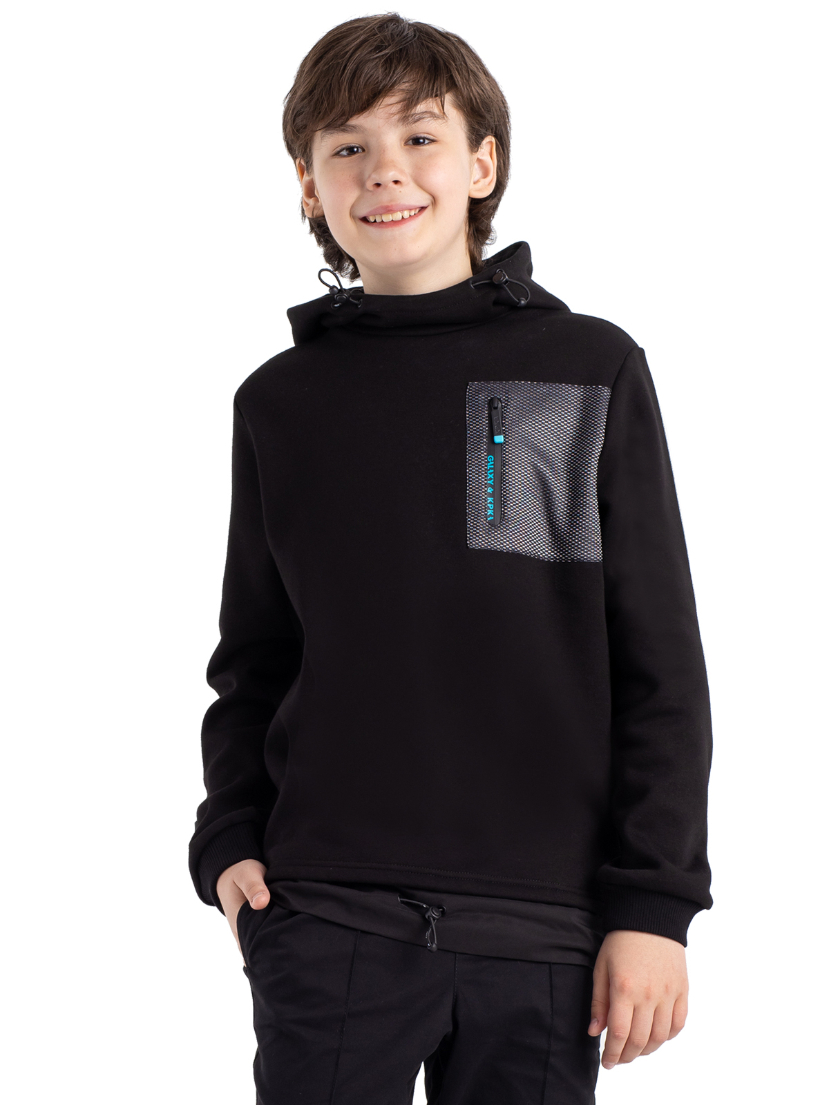 Толстовка для мальчика-подростка классического черного цвета выполнена из высококачественного хлопкового микрофлиса, который дарит ощущение комфорта и тепла. Актуальный свободный крой не сковывает движения, а капюшон с регулирующими шнурками и вставка по низу изделия также с регулировкой - защищают от ветра. Оригинальный непромокаемый карман на груди добавляет модный и функциональный акцент.