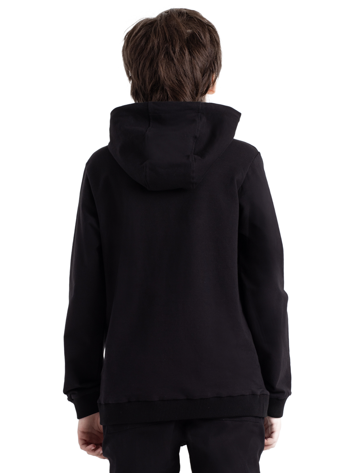 Черная трикотажная толстовка из школьной коллекции выполнена из мягкого хлопка. Толстовка для школы имеет капюшон с регулируемой кулисой, функциональный карман по переду. Трендовые акценты толстовке для школы придают масштабный принт, силиконовый патч, стильная пряжка и подходящие шнурки для регулировки капюшона. Трикотаж мало мнется, удобен в носке, сохраняет цвет и форму после многих стирок.
