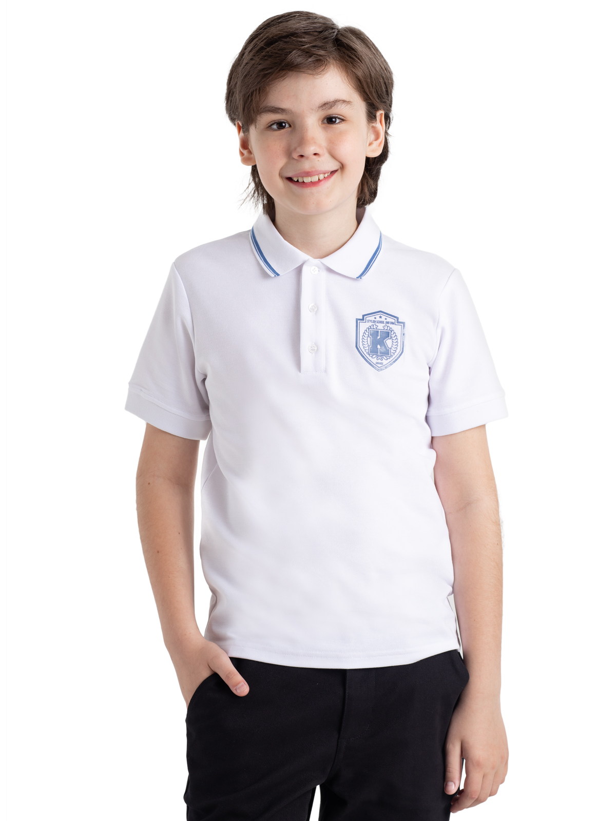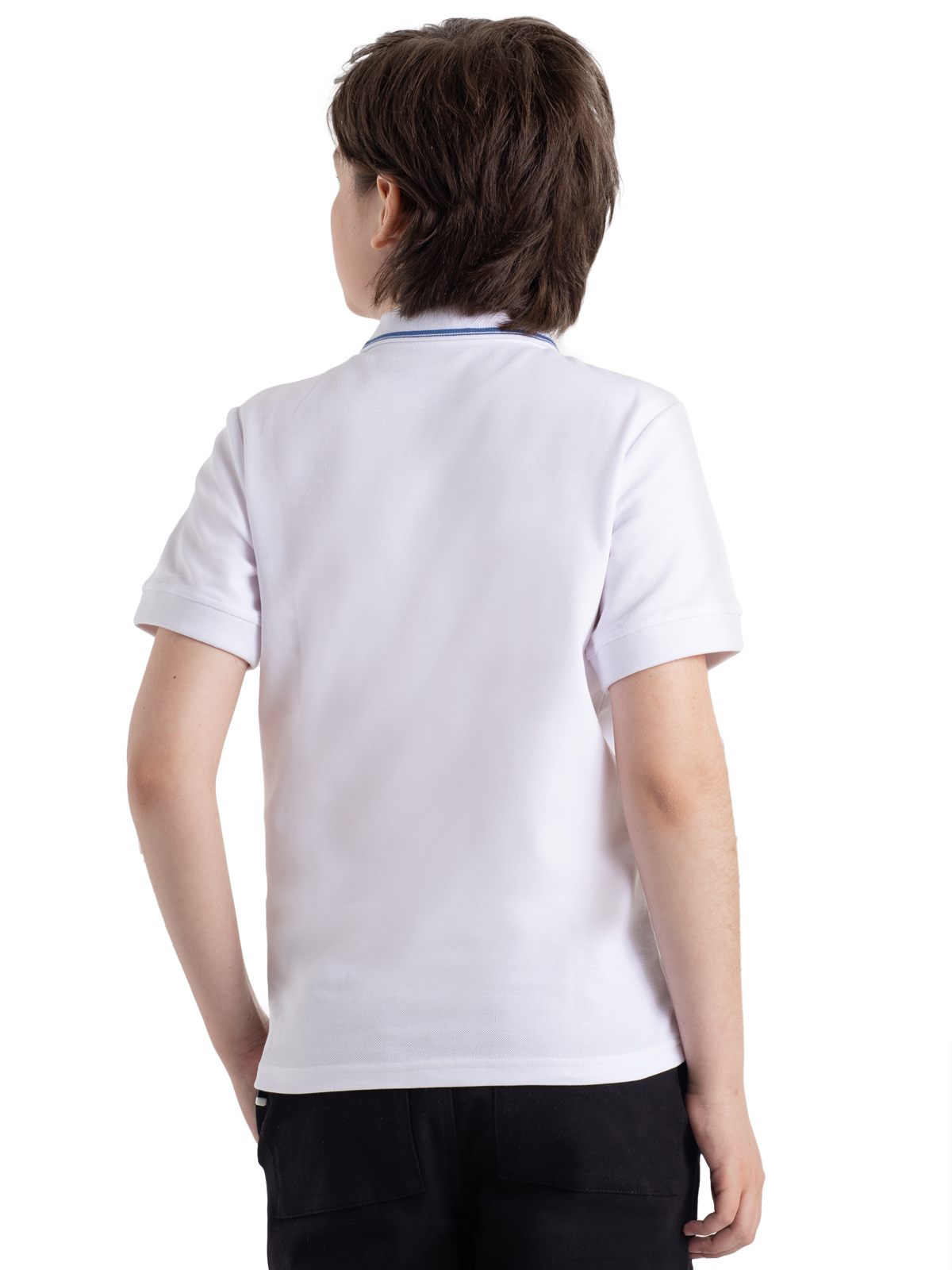 Футболка-поло для школы с коротким рукавом, отложным воротничком и застежками на три пуговицы выполнена из высококачественного хлопка классического белого цвета. Воротник и манжеты футболки-поло выполнены из риба. Дополнена цветовыми акцентами и контрастным принтом на груди. Воротник школьного поло не теряет форму после стирки. Все швы аккуратно обработаны и не раздражают кожу ребенка.
