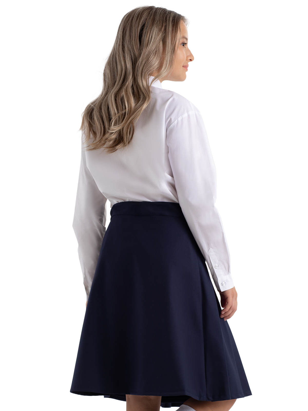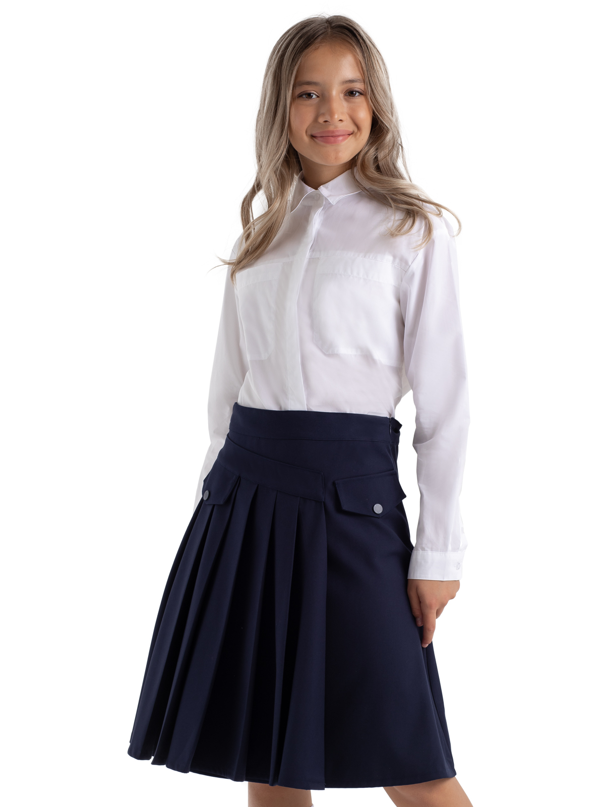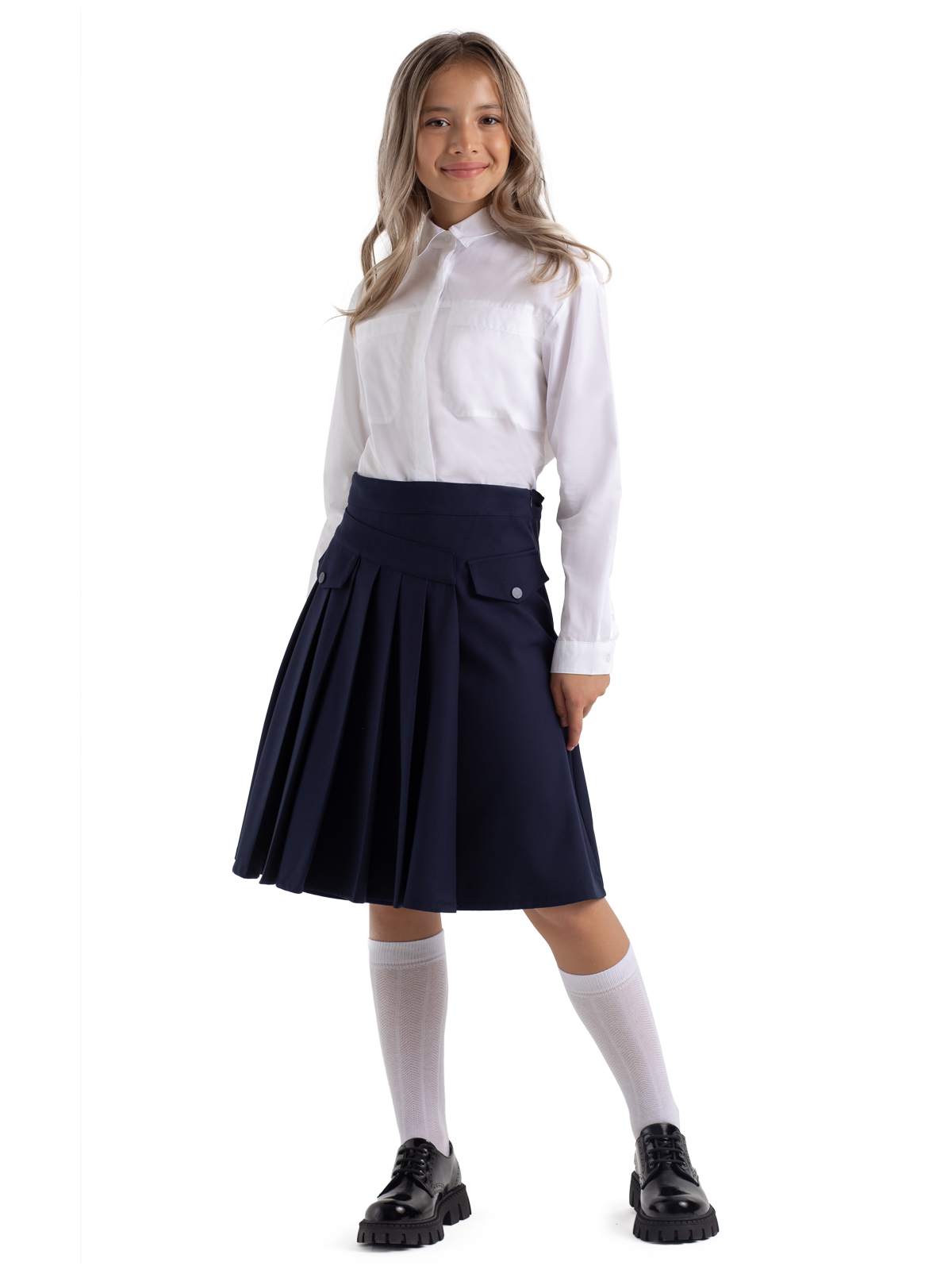 Оригинальная школьная юбка из костюмной поливискозы. Одна сторона низа переда юбки для школы оформлена складками. По бокам имитация карманов с декоративными клапанами и брендовыми кнопками. Модель без подкладки. Школьная юбка застегивается на скрытую в боку молнию и имеет утяжку по талии за счет, вставленной внутрь резинки с перфорационными отверстиями. Поливискоза приятна к телу, ткань не скатывается, мало мнется, легка в уходе, сохраняет форму и цвет после многих стирок.