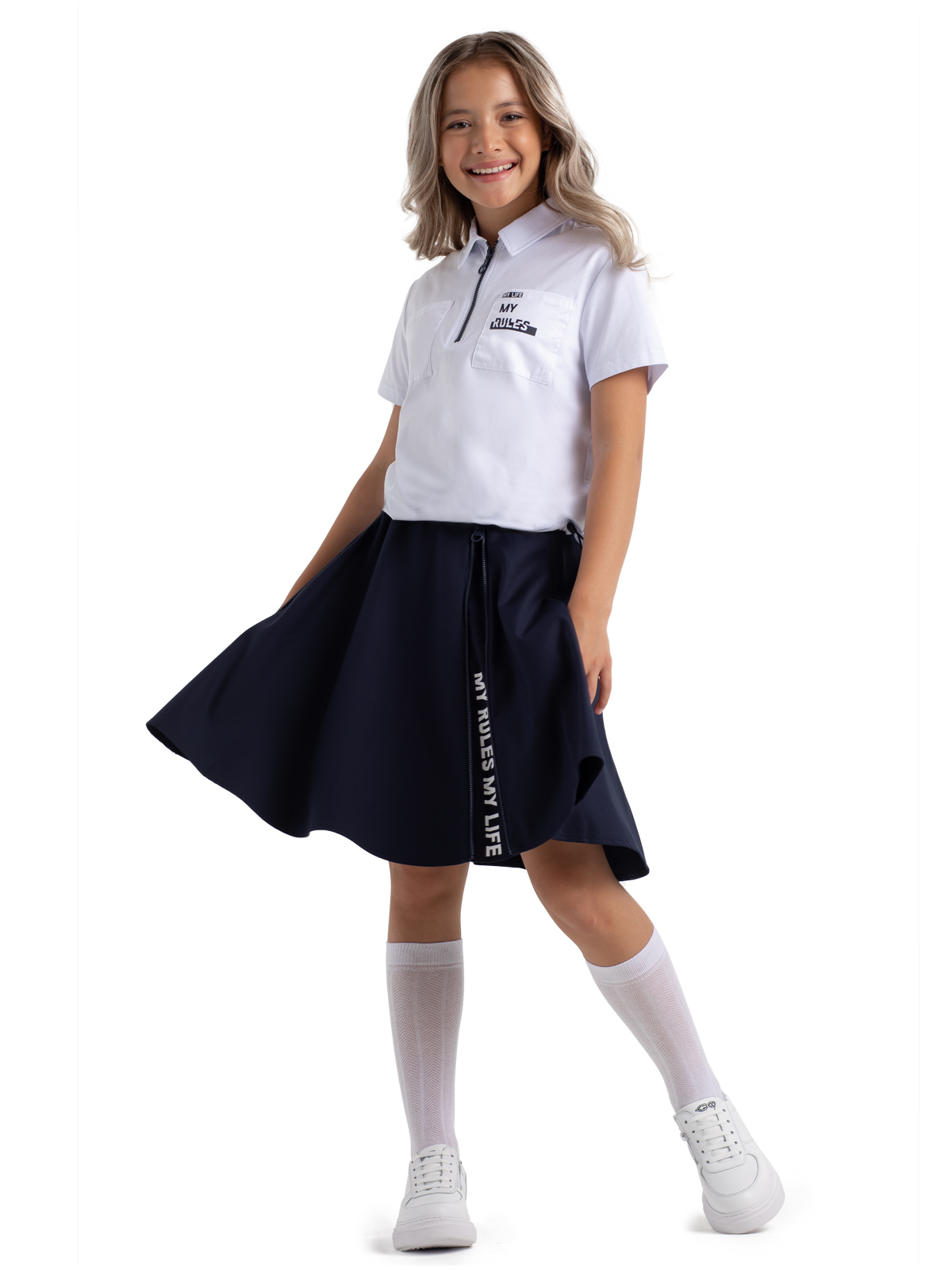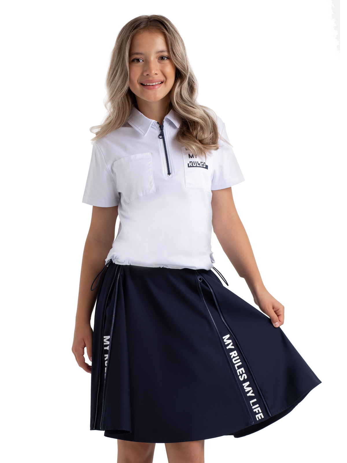 Оригинальная школьная юбка из трикотажа темно-синего цвета выполнена из поливискозы и не имеет подкладки. Модель юбки для школы имеет две функциональные молнии по переду увеличивающие диаметр передней части и скрывающие мотивирующие принты. Школьная юбка застегивается на скрытую в боку молнию и имеет утяжку по талии за счет, вставленной внутрь резинки с перфорационными отверстиями. Трикотажная ткань тянется, легка в уходе, не пилингуется и сохраняет цвет после множества стирок.