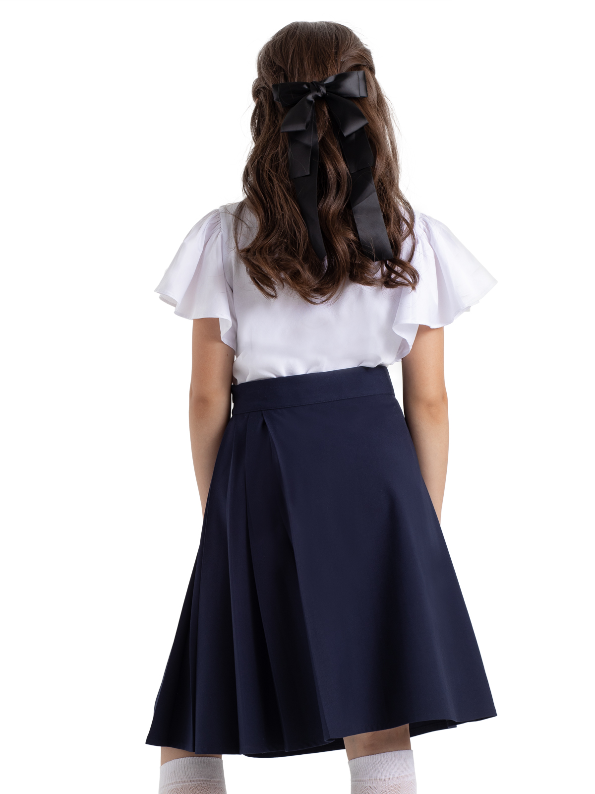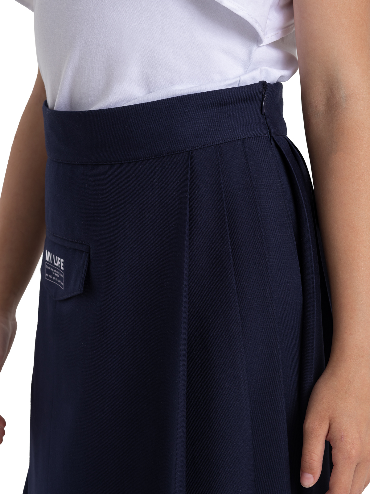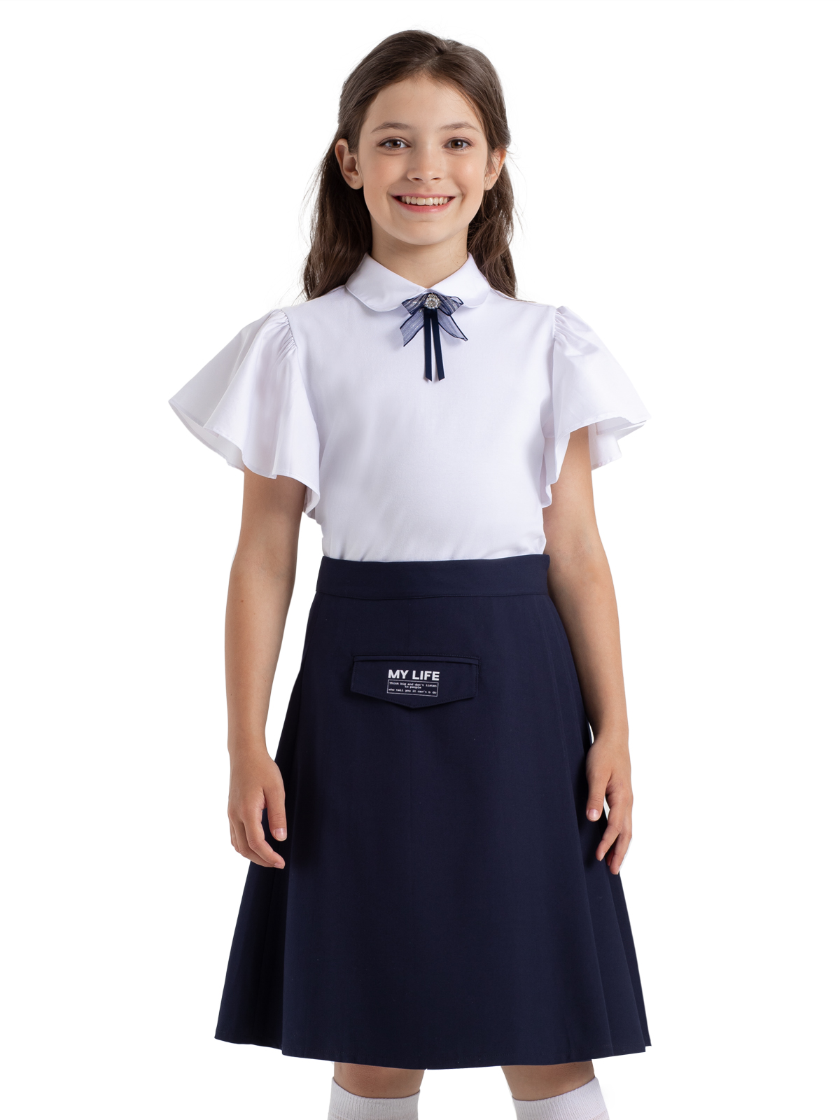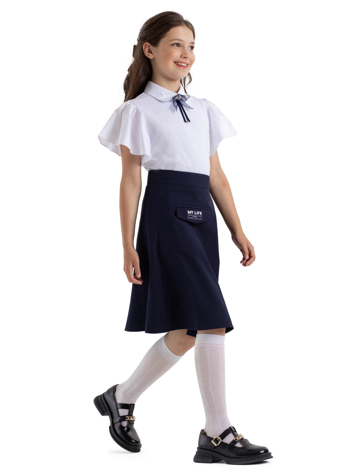 Школьная юбка классического темно-синего цвета из костюмной поливискозы. Функциональный карман украшен мотивирующим принтом. Модель юбки для школы дополнена декоративными складками по боку изделия, отрезной пояс выполнен из основной ткани. Школьная юбка застегивается на молнию в боку и имеет утяжку по талии за счет, вставленной внутрь резинки с перфорационными отверстиями. Поливискоза приятна к телу, ткань не скатывается, мало мнется, легка в уходе, сохраняет форму и цвет после многих стирок.
