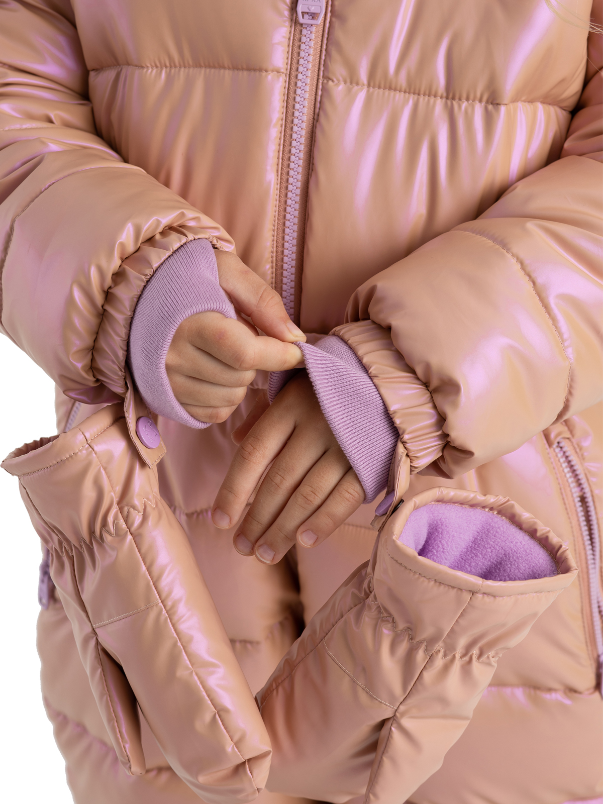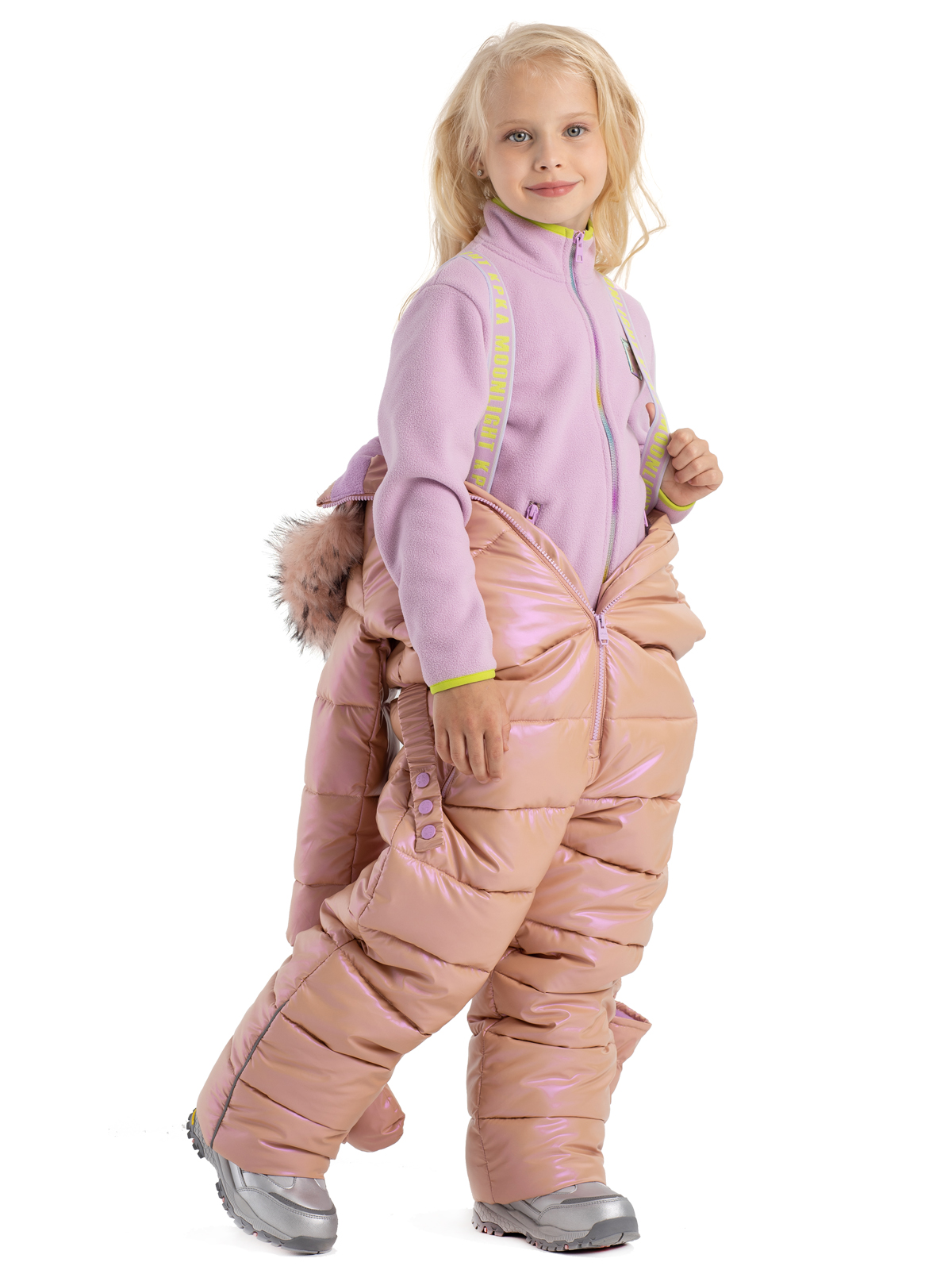 Зимний стильный комбинезон для девочки из ткани с водостойким PU-покрытием. От холодов защитит утеплитель - искуственный пух 300 г/м2 и дополнительное утепление синтепоном. Комбинезон дополнен подкладкой из мягкого микрофлиса в воротнике и верхней части изделия. Съемный капюшон имеет регулируемую кулису по краю и декорирован искуственным съемным мехом. Высокий воротник, манжеты из риба и центральная молния с внутренней планкой надежно защищают от ветра. Изделие также имеет съемный регулируемый пояс на кнопках и съемные варежки, которые пристегиваются на кнопки к специальной ленте в рукавах. Комбинезон имеет два боковых кармана. Брючины комбинезона оснащены специальной подкладкой и ветрозащитной манжетой на резинке с латексом - защищающей кожу от низких температур, ветра и попадания снега. На комбинезоне имеются светоотражающий принт на рукавк, и нашивные светоотражающие элементы по низу брючин для защиты ребенка в темное время суток.