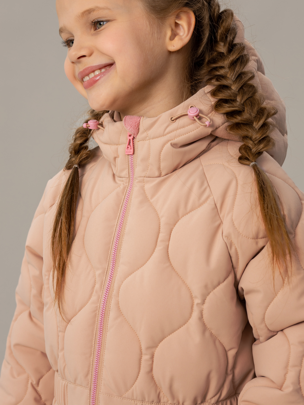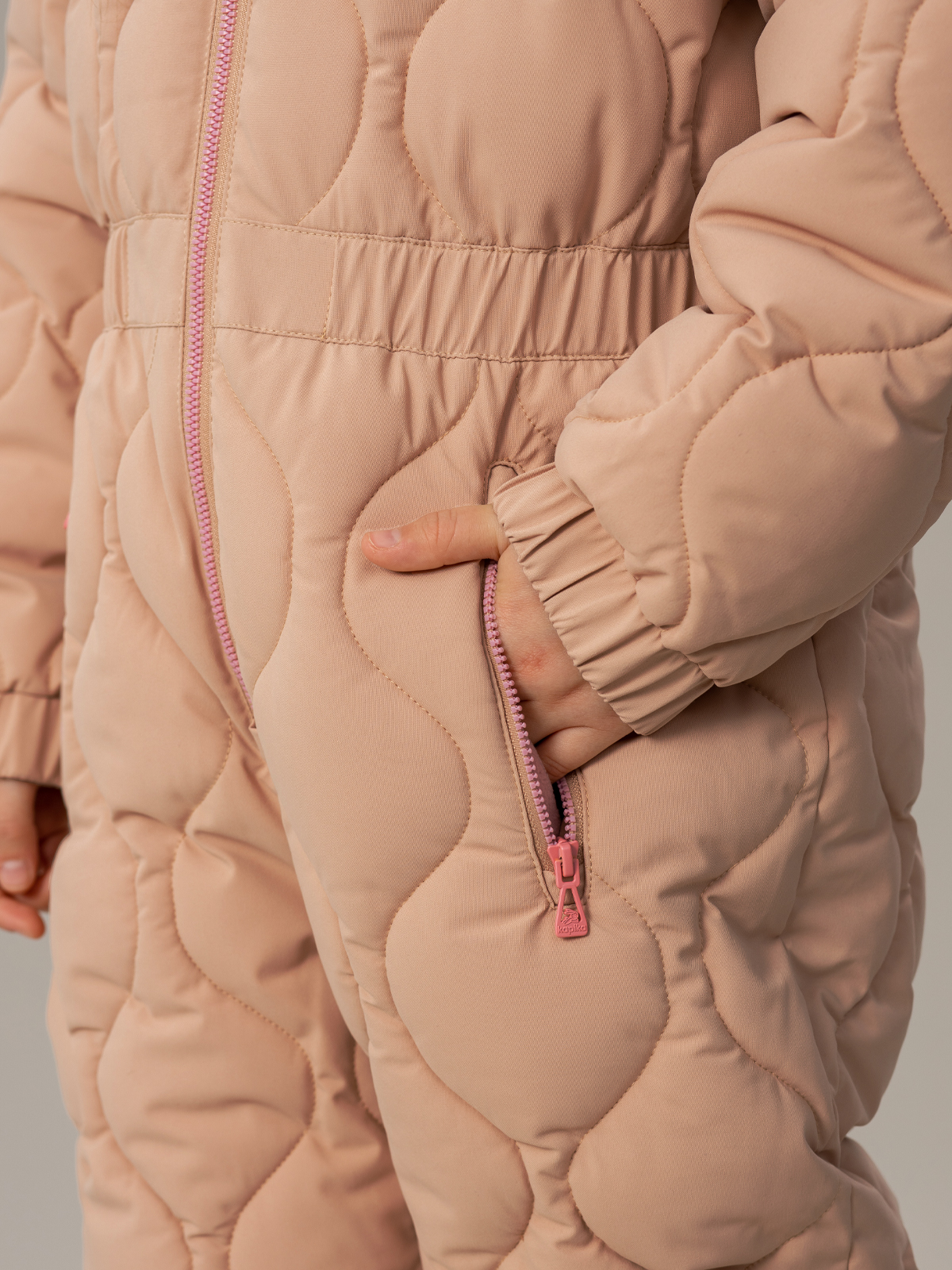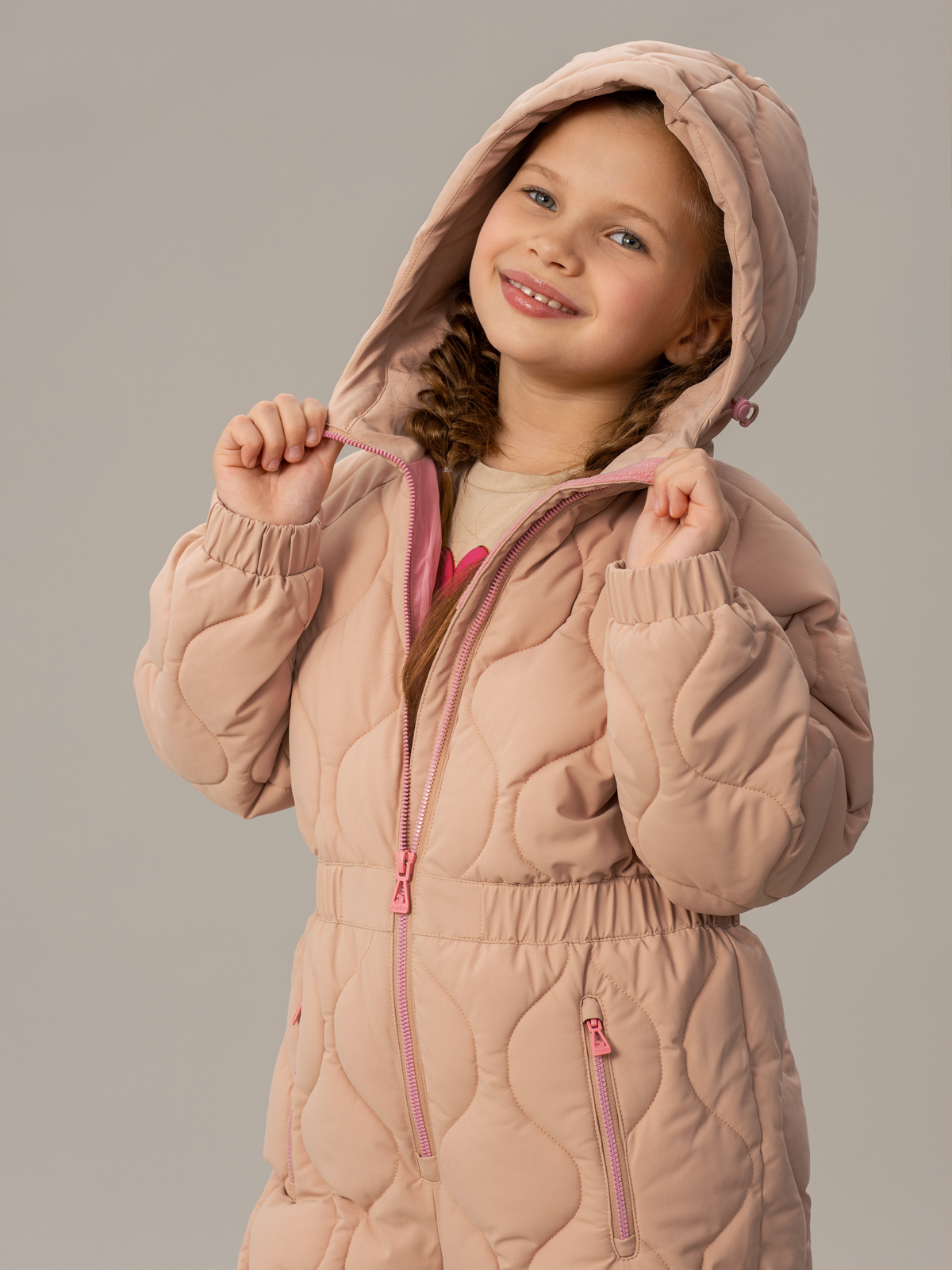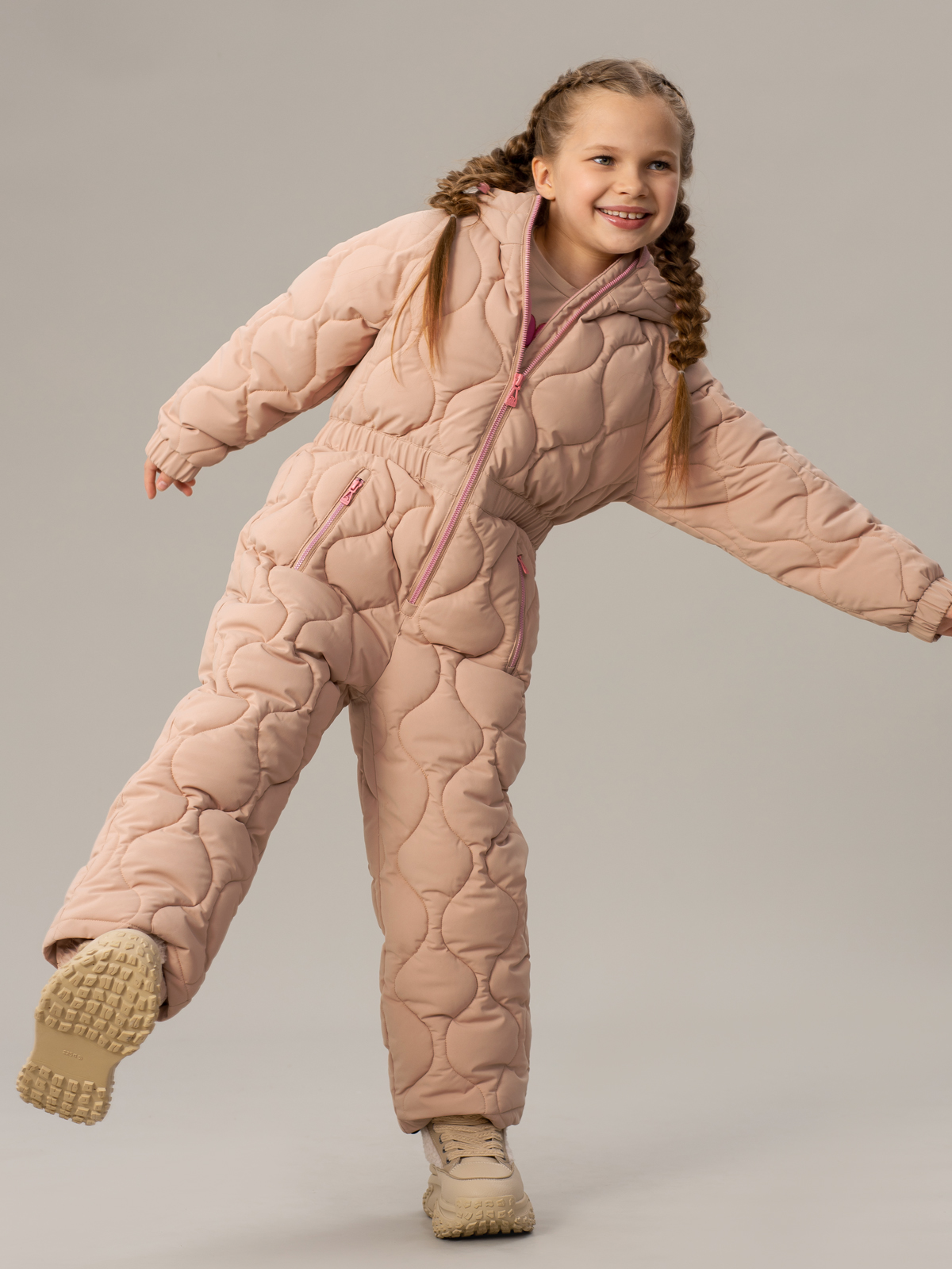 Эффектный зимний комбинезон для девочки с фигурной стёжкой привлекает внимание оригинальным дизайном и практичностью. Изготовлен из мембранной ткани 5000/5000, надёжно защищающей от ветра и осадков. Утеплён искусственным пухом плотностью 300 г/м², что обеспечивает сохранение тепла даже в сильные морозы.Особенности модели: регулируемый капюшон для дополнительной защиты от непогоды, ветрозащитные манжеты на резинке на рукавах и брючинах, предотвращающие проникновение холодного воздуха и снега, Центральная молния с внутренней планкой, надёжно защищающая от ветра. Этот комбинезон идеально подходит для активных зимних прогулок, обеспечивая комфорт и защиту от холода.