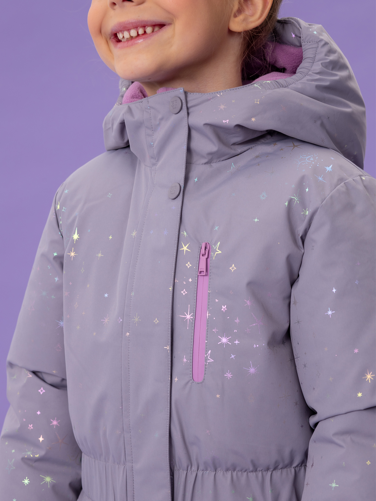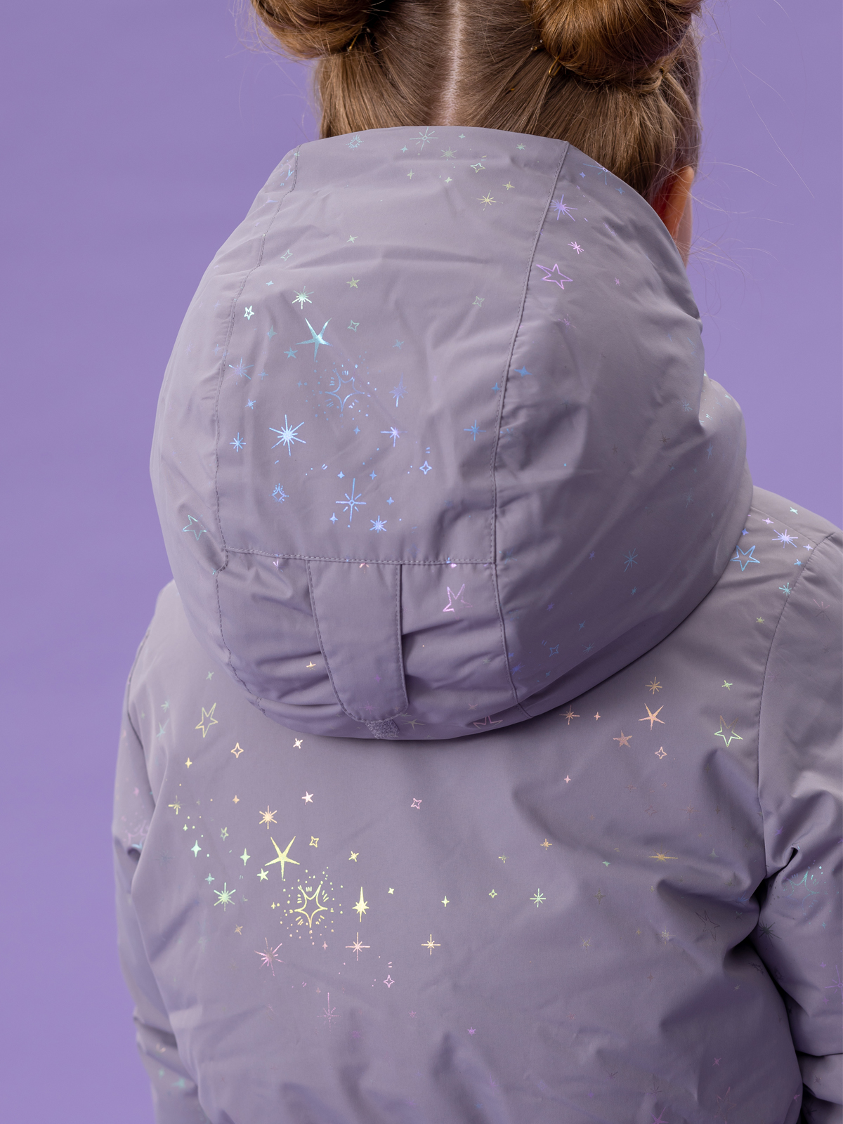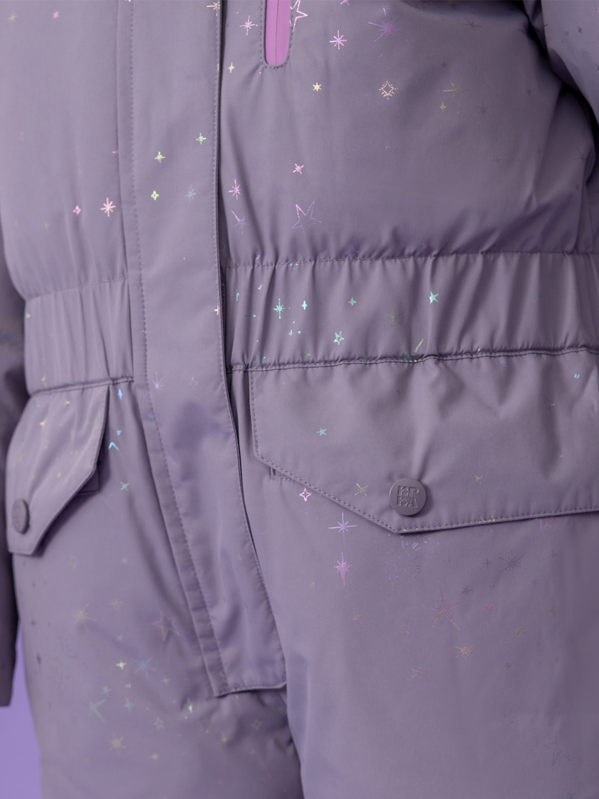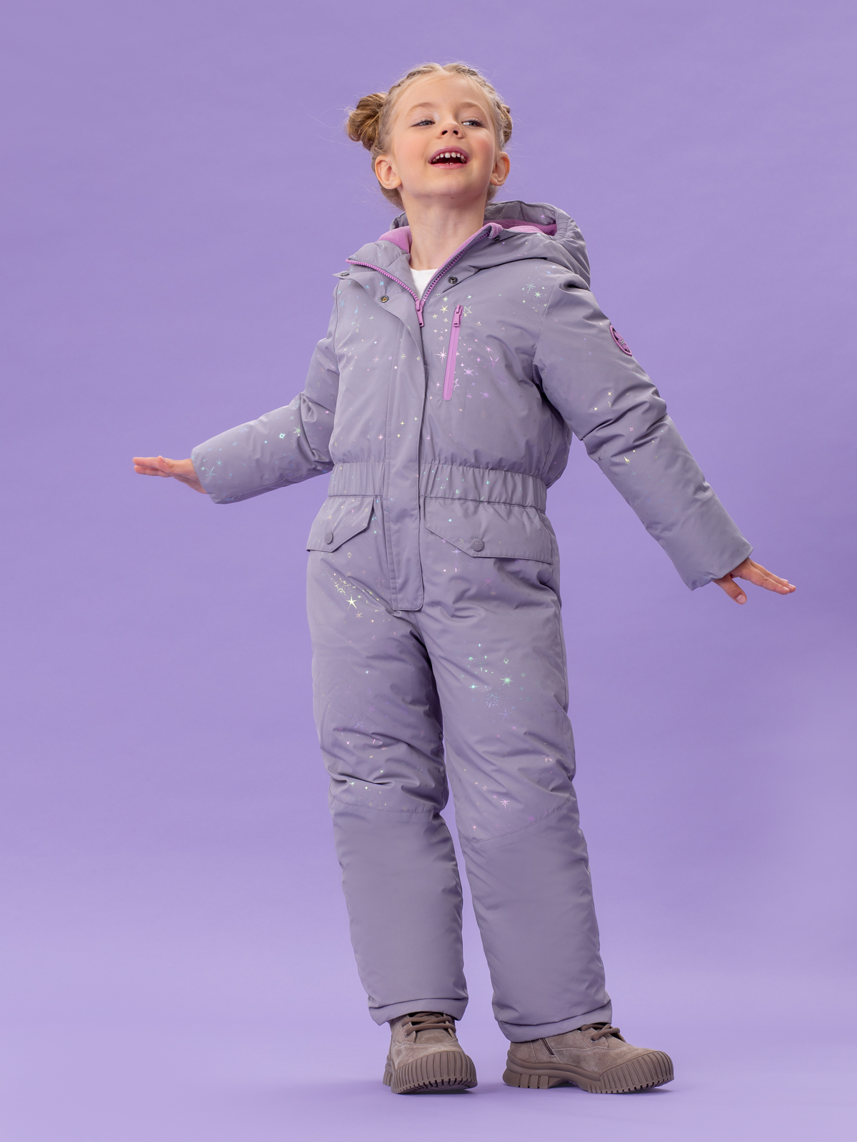 Практичный утеплённый комбинезон в сером цвете с эффектным голографическим принтом. Прочная мембранная ткань с показателями 5000/5000 надёжно защищает от влаги и ветра, обеспечивая комфортный микроклимат. Современный утеплитель из искусственного пуха плотностью 350 г/м² гарантирует сохранение тепла в прохладную погоду. Удобная молния в сочетании с ветрозащитной планкой обеспечивает простоту использования. Функциональные карманы с клапанами на кнопках позволяют хранить необходимые вещи. Эластичная резинка на талии обеспечивает комфортную посадку по фигуре. Регулируемый капюшон позволяет настроить оптимальную защиту от непогоды. Светоотражающие элементы повышают безопасность в тёмное время суток.