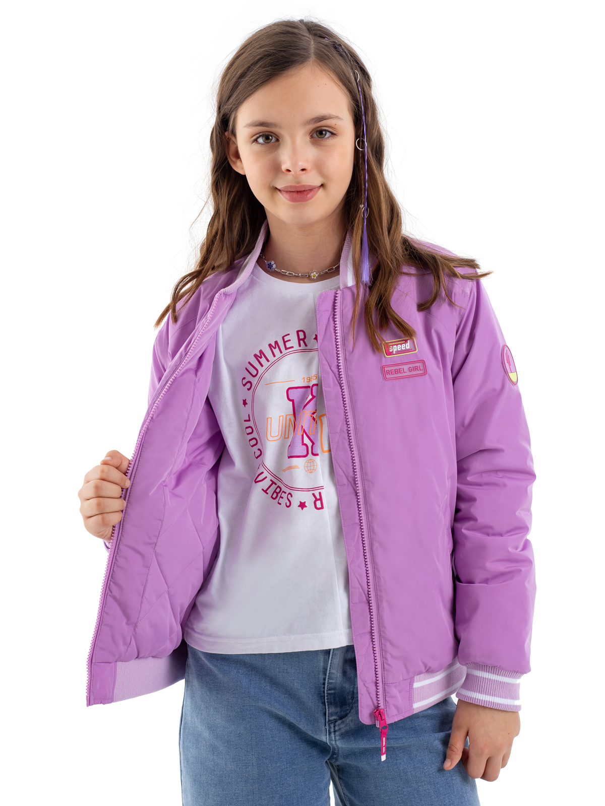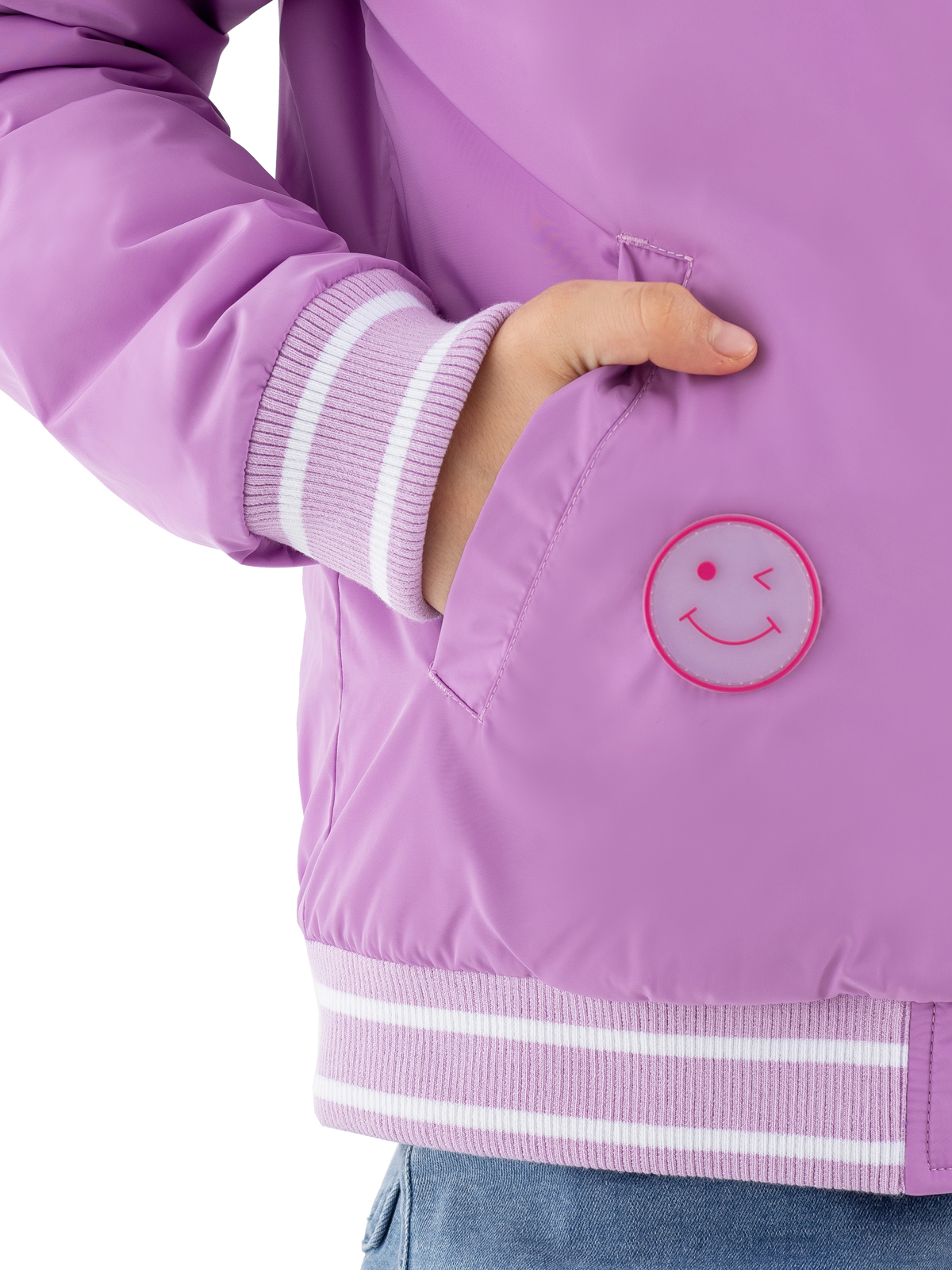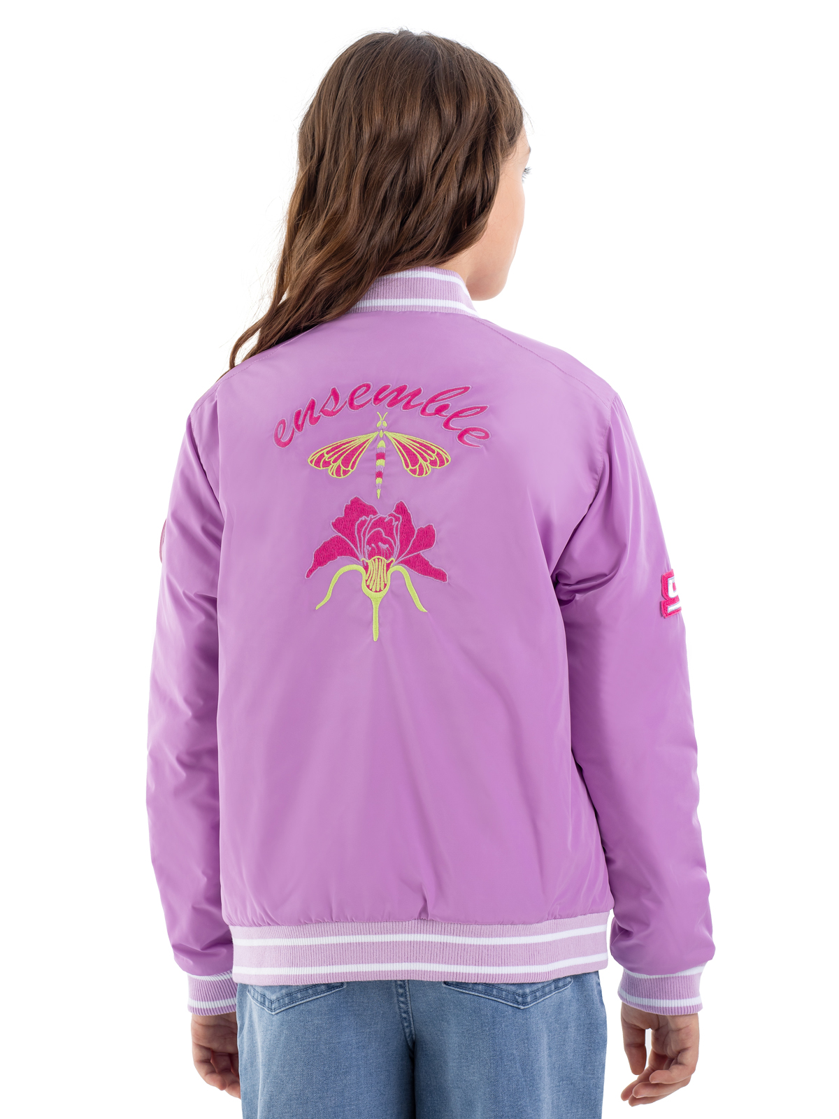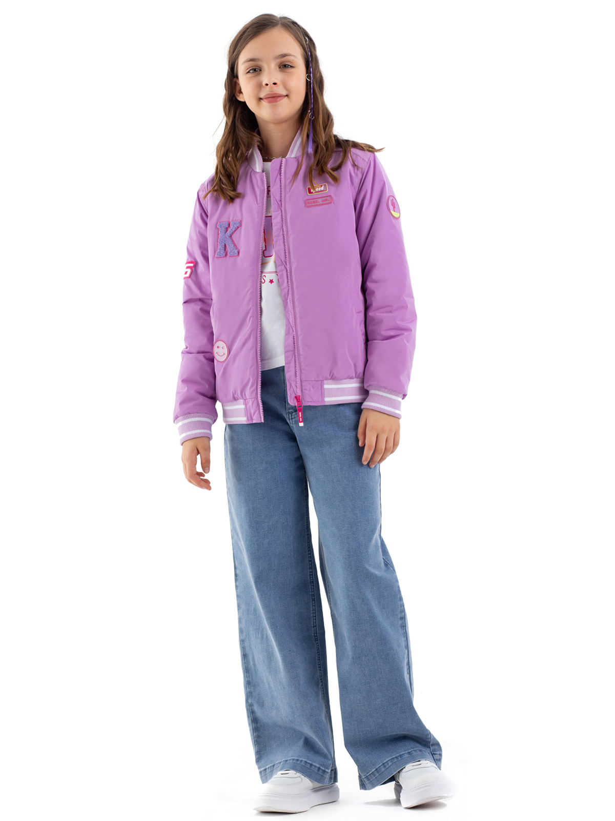 Стильный бомбер в розовом цвете — модная модель для девочек-подростков. Простёганная подкладка с утеплителем синтепоном плотностью 160 г/м² обеспечивает комфортную температуру. Особую элегантность модели придают мягкие рибы в полоску, расположенные по низу изделия, манжетам рукавов и горловине. Удобная застёжка-молния позволяет легко надевать и снимать бомбер. Функциональность модели подчёркивают два практичных прорезных кармана с листочками. Декоративные элементы — яркие патчи и выразительная вышивка на спинке — делают образ современным и запоминающимся.