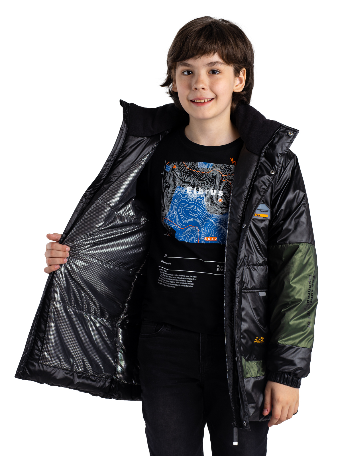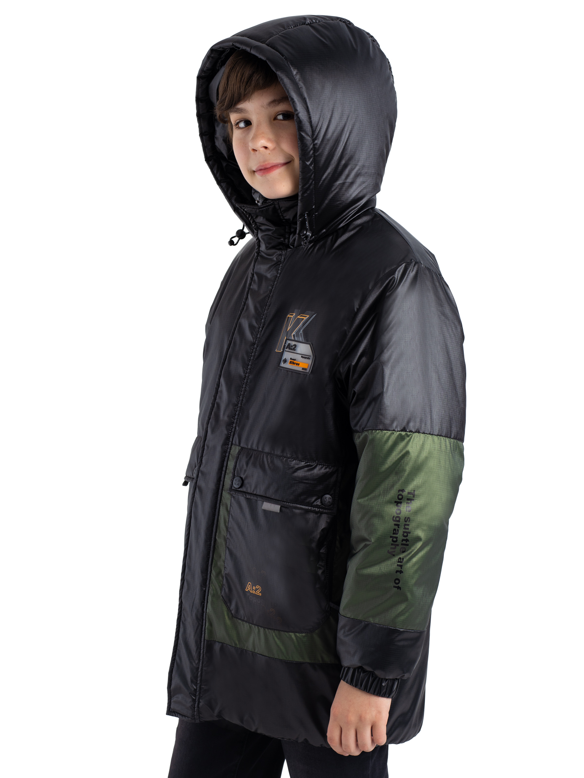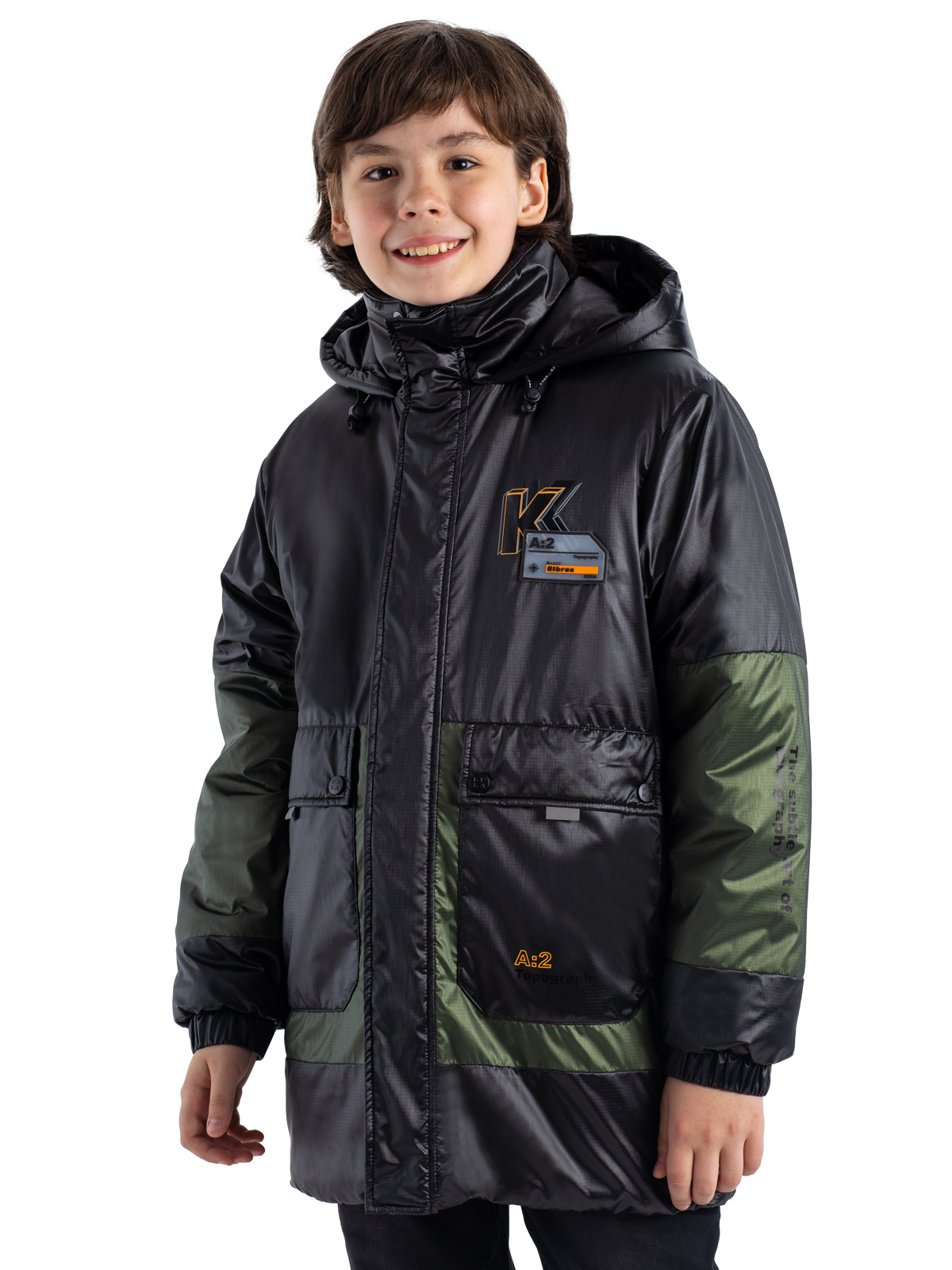 Демисезонная куртка прямого силуэта с вставками темно-зеленого цвета в ткани рипстоп имеет утеплитель 240г/м2. Капюшон несъемный, по краю капюшона регулируемая кулиса, воротник изнутри утеплен флисом. Ветрозащитная планка на кнопках и манжеты на резинках обеспечивает дополнительную защиту от ветра. Рефлективная подкладка с фольгированным принтом (OMNI-HEAT) эффективно удерживает тепло внутри. Куртка дополнена тематическими принтами на рукавах, груди и накладных карманах, также имеются светоотражающие элементы и стильный силиконовый патч.