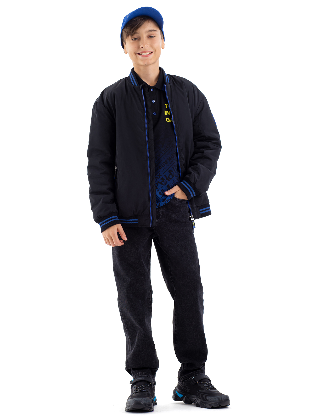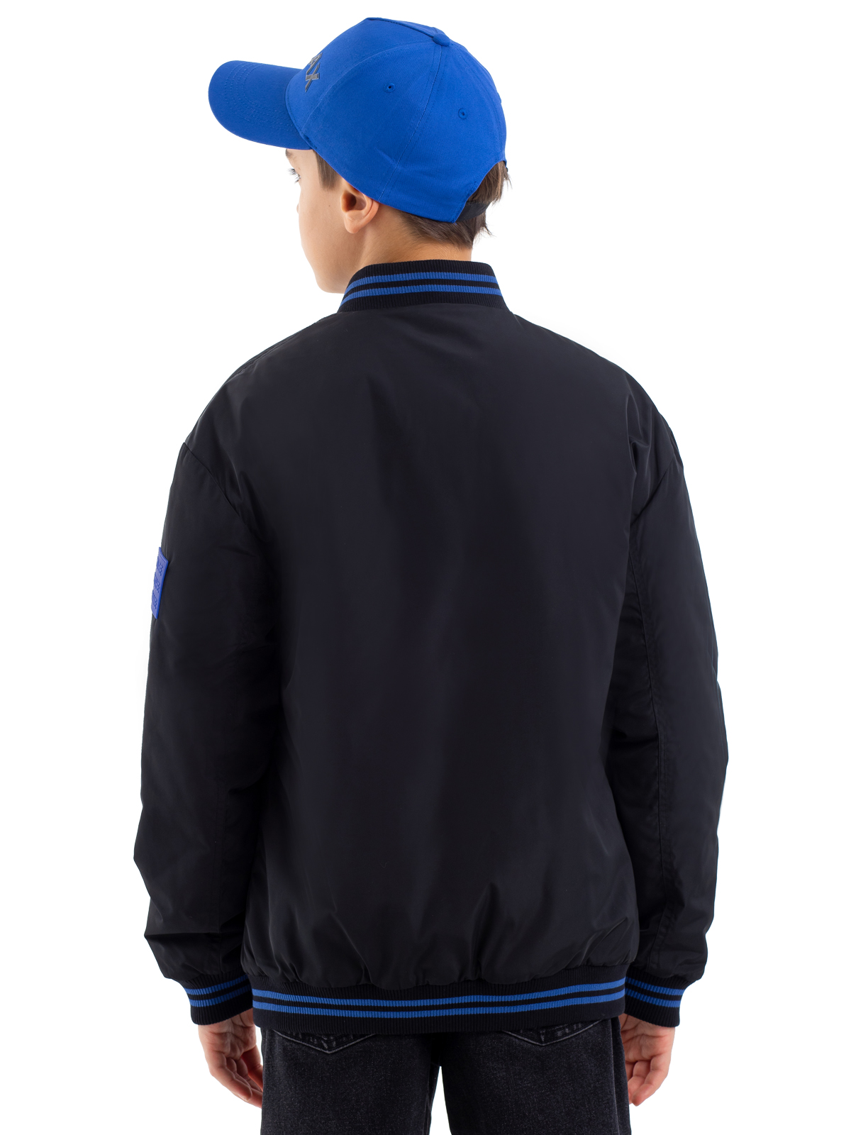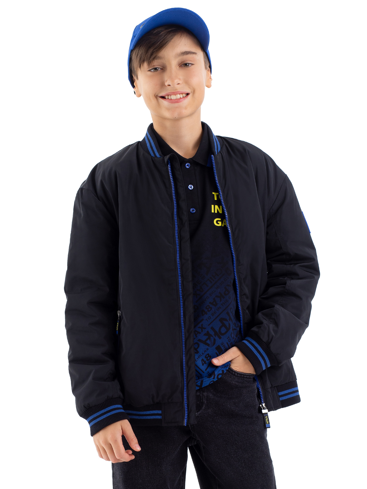 Стильный бомбер в классическом чёрном цвете — отличный выбор для активного подростка. Модель выполнена из качественного 100% полиэстера с гармоничным принтом, который идеально сочетается с основным цветом изделия. Специальное AC-покрытие на основной ткани обеспечивает надёжную защиту от влаги и повышает износостойкость материала. Утеплитель синтепон плотностью 160 г/м² обеспечивает комфортную температуру в прохладную погоду. Контрастные синие молнии на центральной застёжке и в карманах добавляют модели современный акцент и практичность. Особую комфортность бомберу придают мягкие полосатые рибы по низу изделия, рукавам и воротнику, которые обеспечивают плотное прилегание и защиту от ветра. Практичная и стильная модель станет незаменимой вещью в гардеробе подростка.