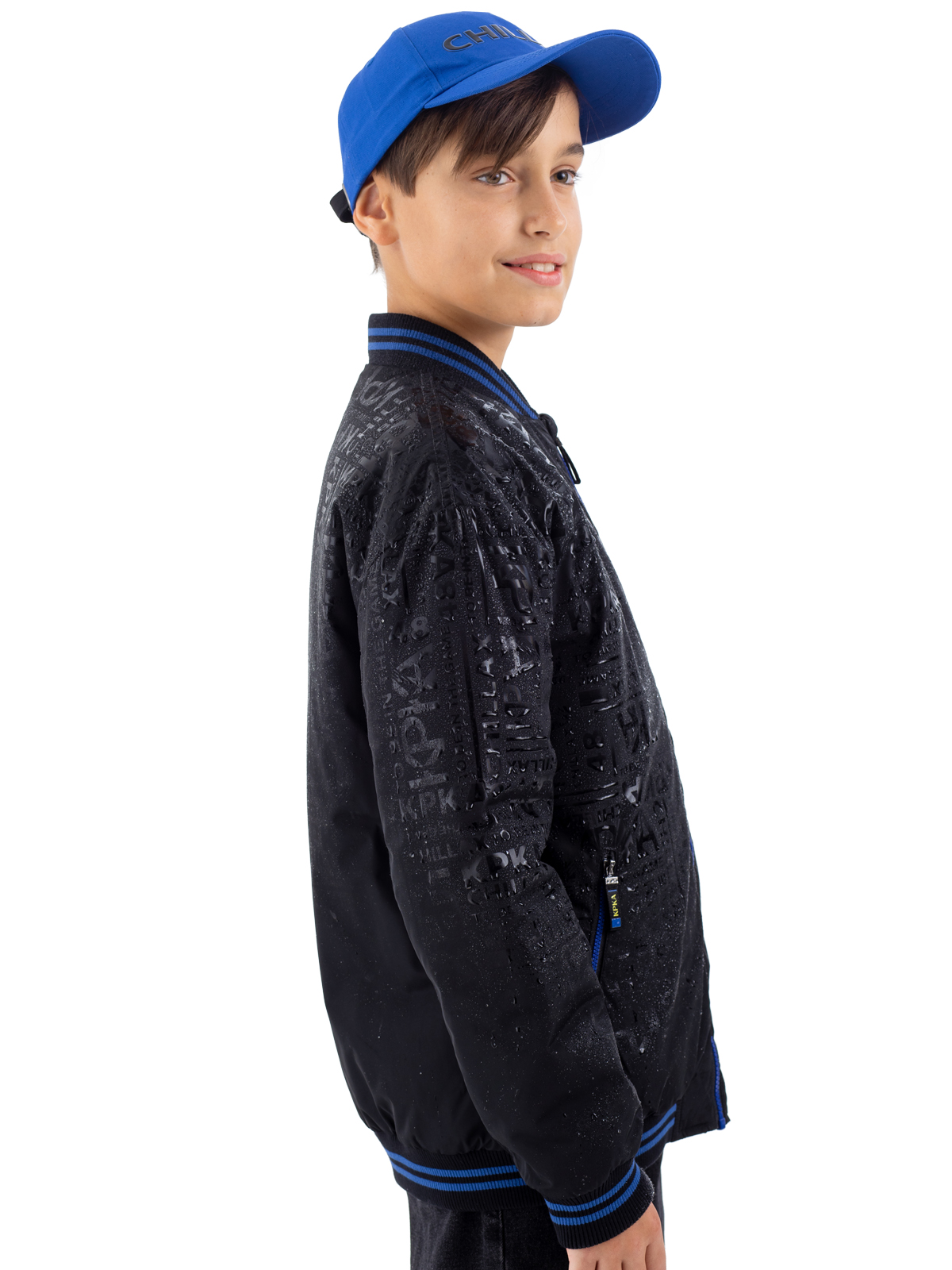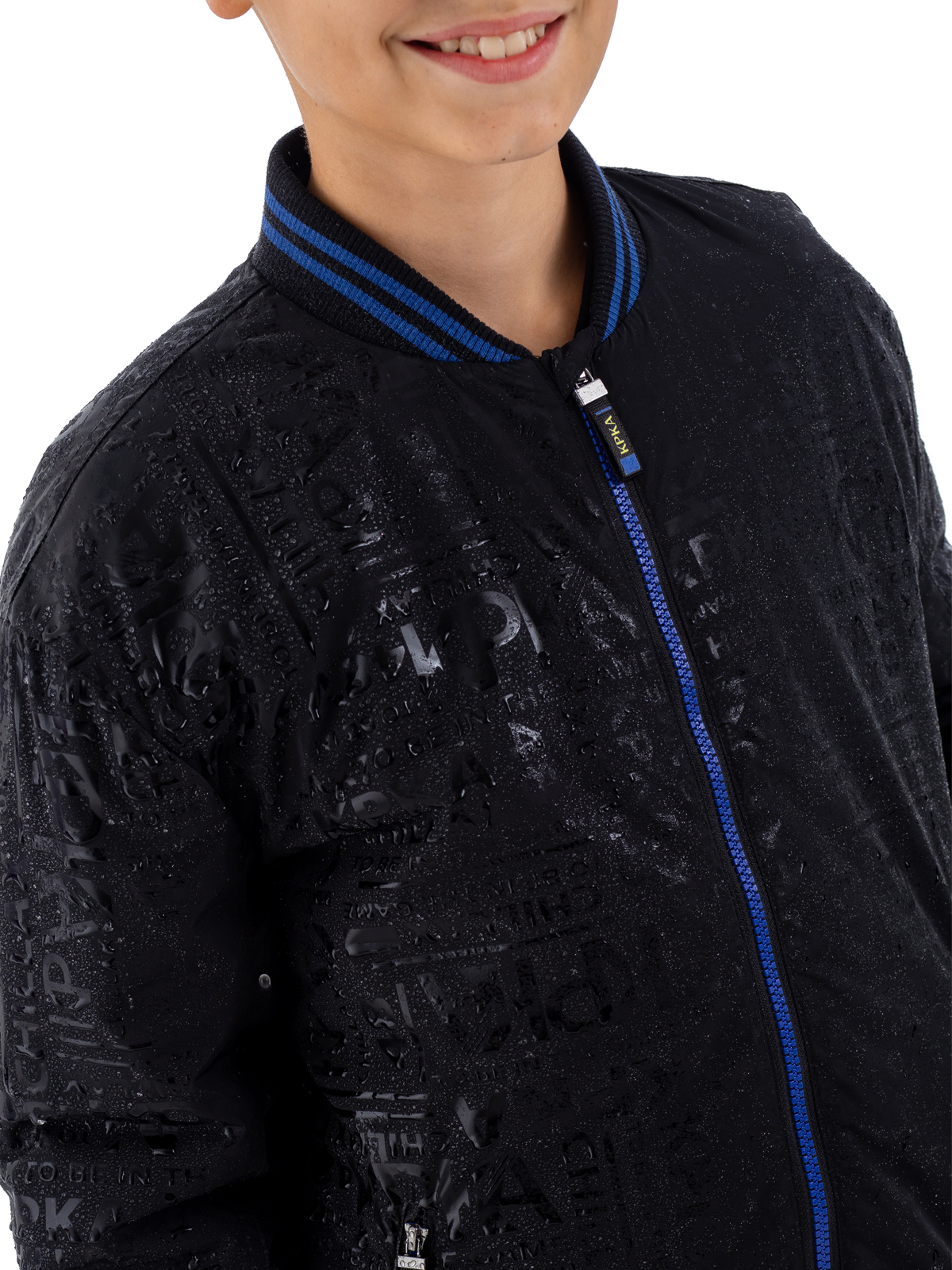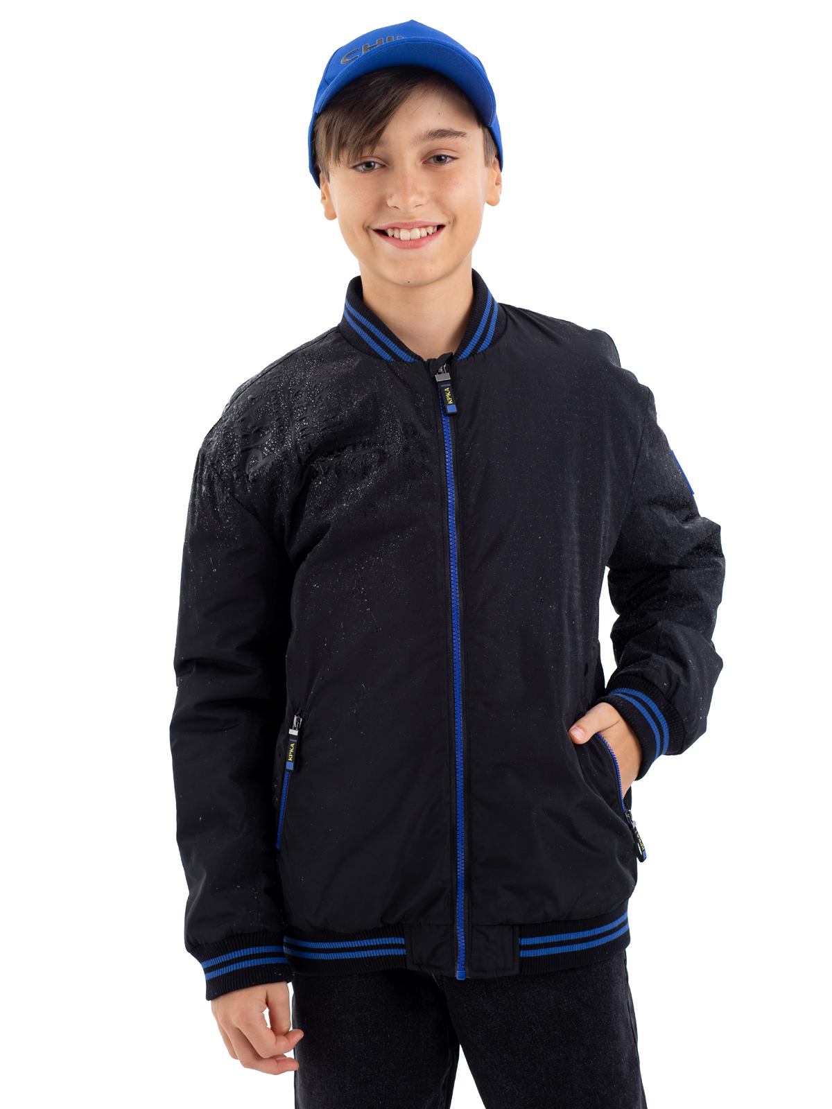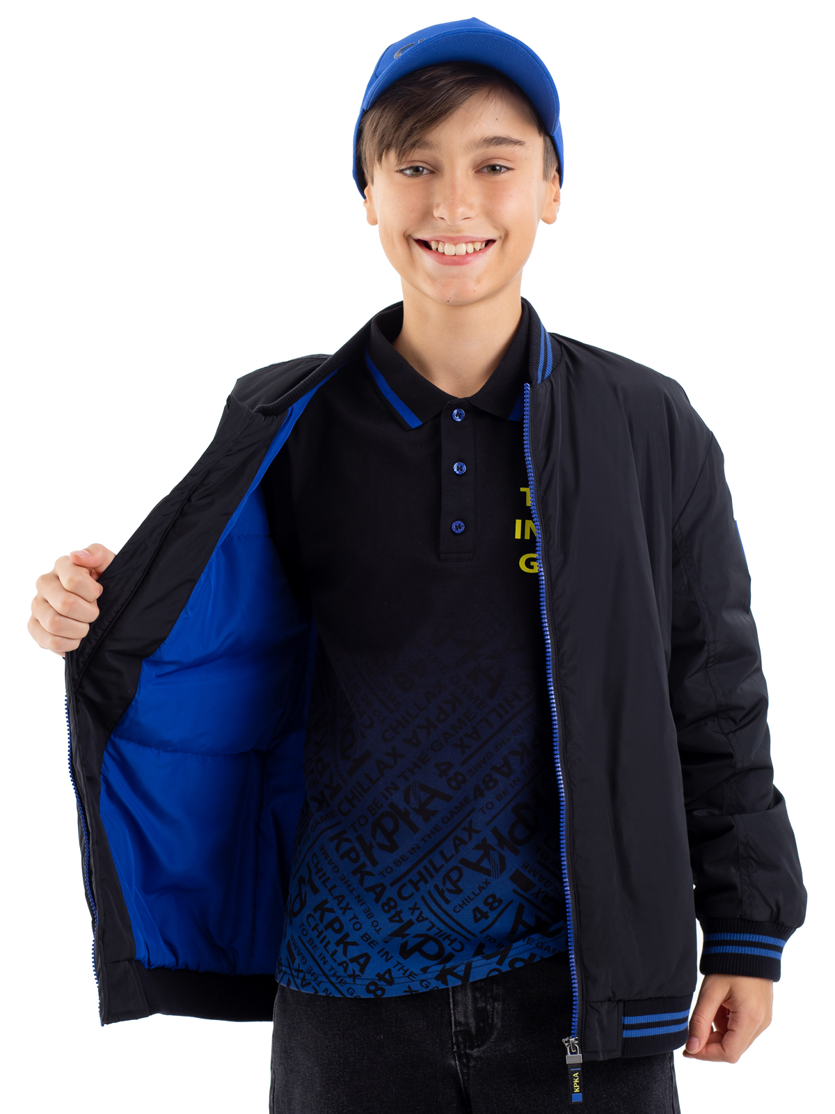 Стильный бомбер в классическом чёрном цвете — отличный выбор для активного подростка. Модель выполнена из качественного 100% полиэстера с гармоничным принтом, который идеально сочетается с основным цветом изделия. Специальное AC-покрытие на основной ткани обеспечивает надёжную защиту от влаги и повышает износостойкость материала. Утеплитель синтепон плотностью 160 г/м² обеспечивает комфортную температуру в прохладную погоду. Контрастные синие молнии на центральной застёжке и в карманах добавляют модели современный акцент и практичность. Особую комфортность бомберу придают мягкие полосатые рибы по низу изделия, рукавам и воротнику, которые обеспечивают плотное прилегание и защиту от ветра. Практичная и стильная модель станет незаменимой вещью в гардеробе подростка.