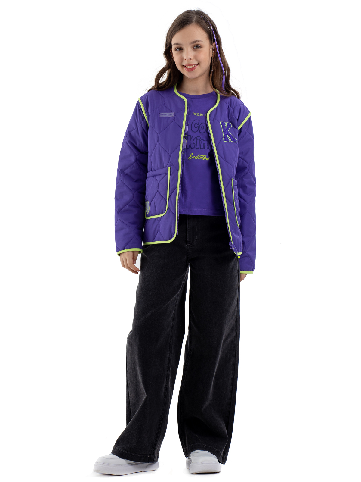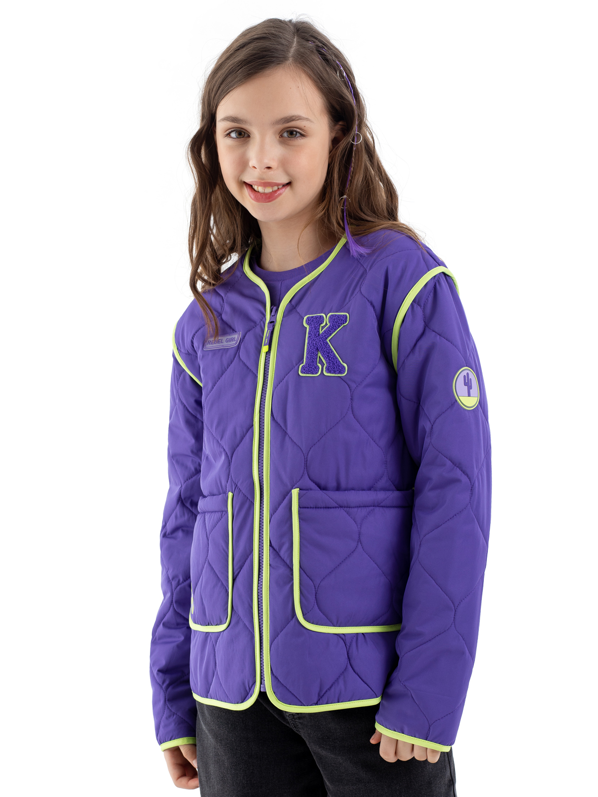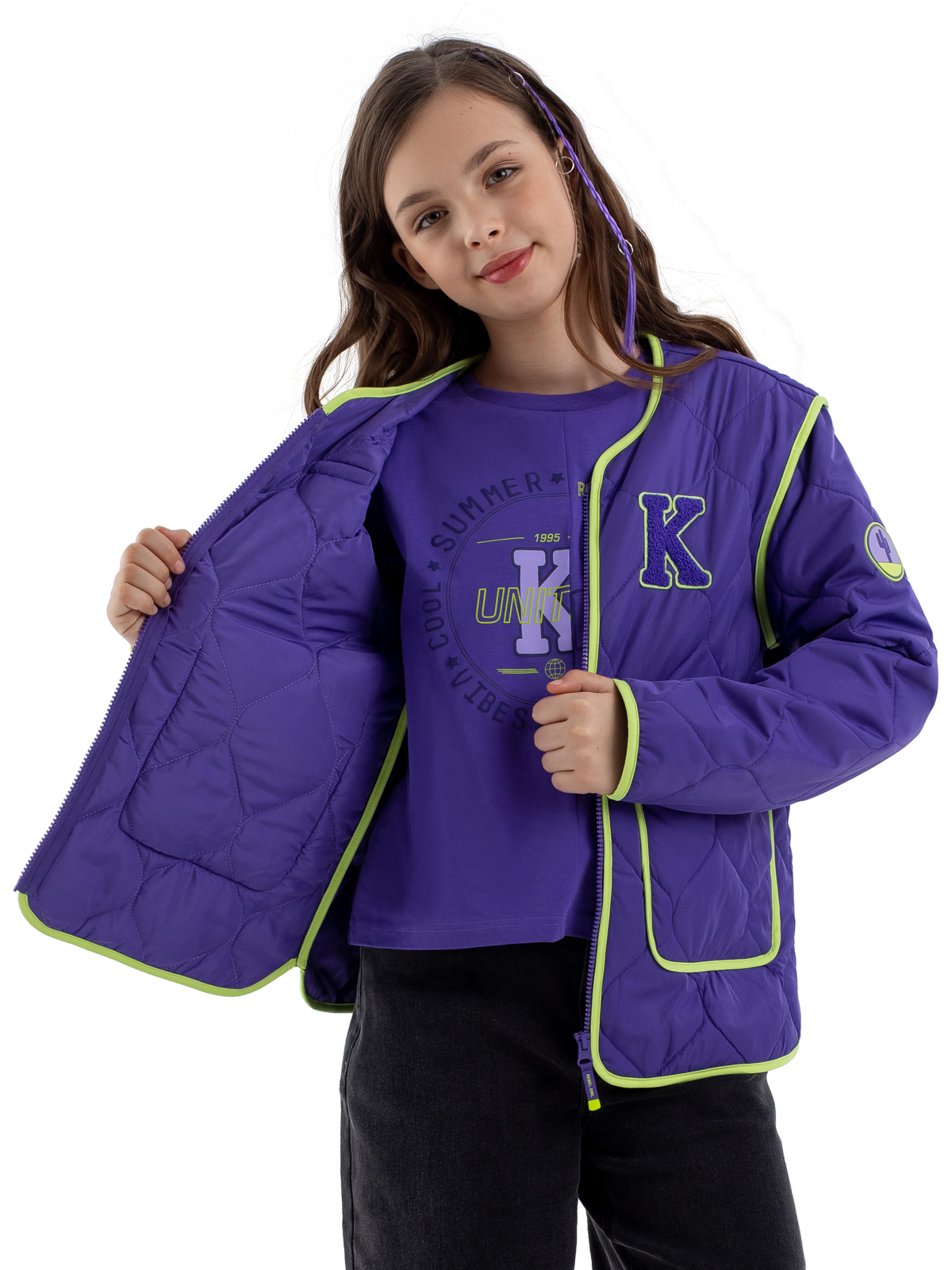 Стёганая куртка в насыщенном фиолетовом цвете — идеальный выбор для стильной девочки-подростка. Благодаря современной мембране с показателями 5000мм/5000г/м2/24ч модель надёжно защищает от влаги и ветра, а синтепоновый утеплитель плотностью 160 г/м² обеспечивает комфорт в прохладную погоду. Практичная конструкция включает удобную застёжку-молнию и два функциональных накладных кармана. Особую изюминку образу придают выразительные контрастные окантовки салатового цвета, которые украшают края изделия и карманов. Стильный дизайн дополняют яркие нашивные патчи, которые делают куртку современной и модной. Продуманная конструкция гарантирует комфорт при носке в демисезонный период.