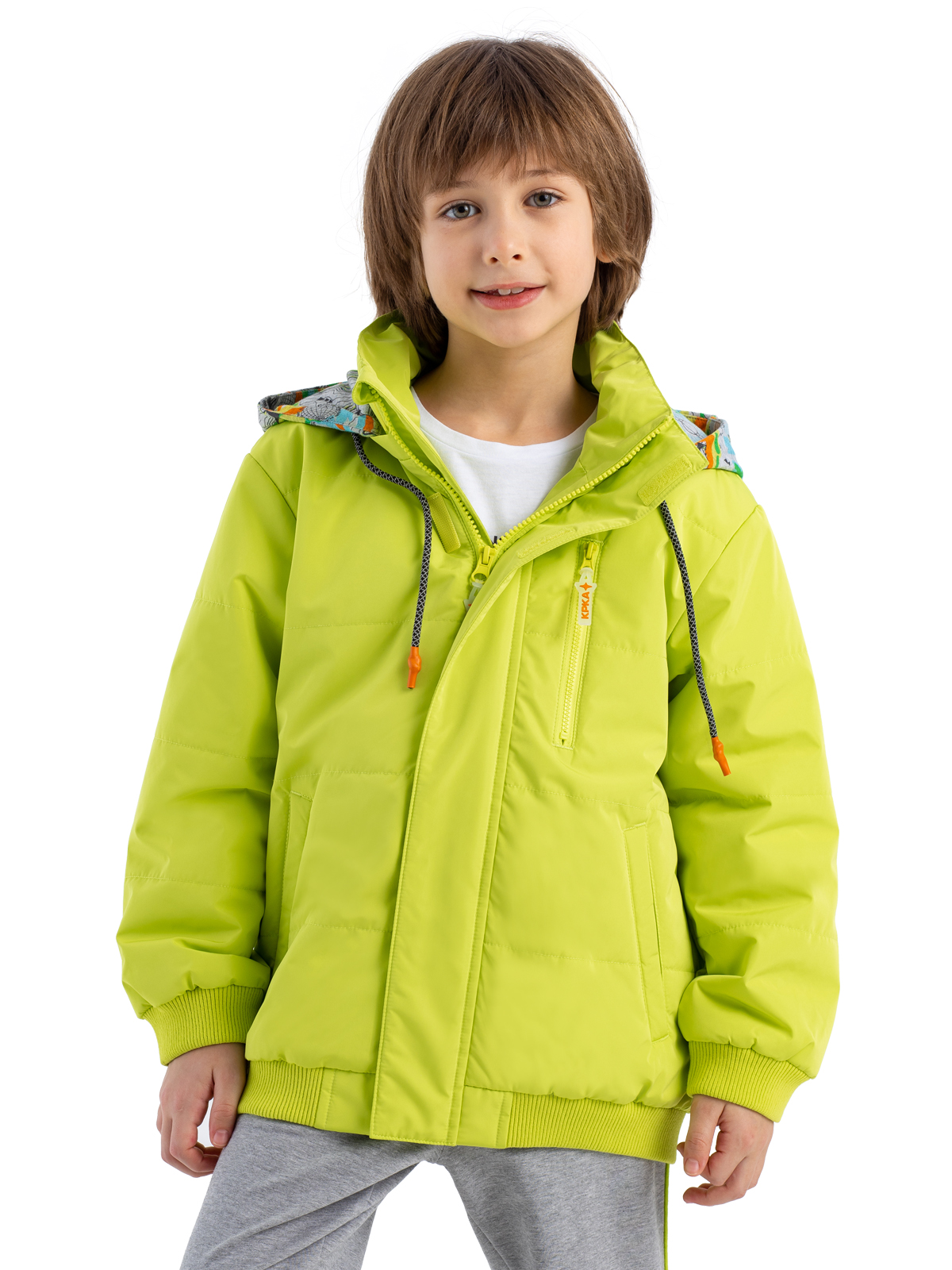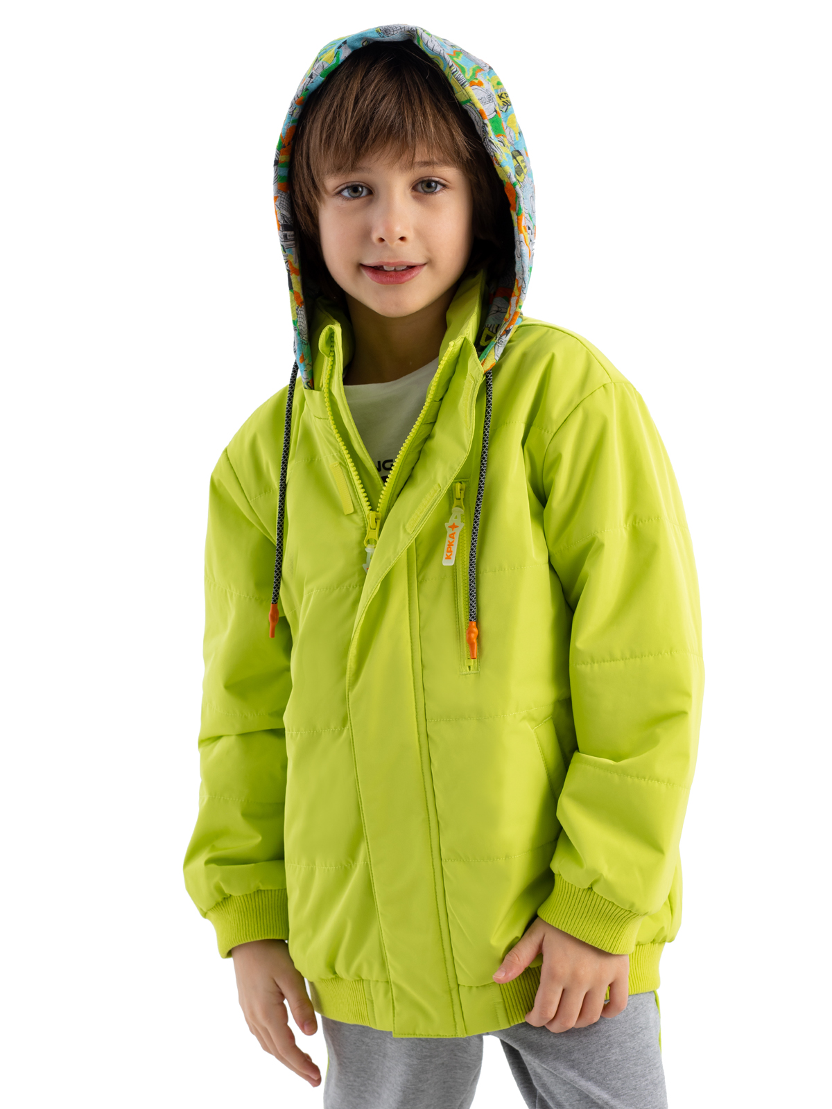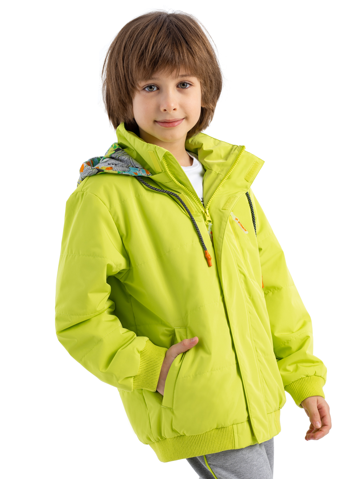 Стильная демисезонная куртка яркого цвета из влагозащитной, грязеотталкивающей, не продуваемой мембранной ткани 5000мм/5000г/м2/24ч имеет утеплитель 80г/м2. Центральная молния закрыта широкой внешней планкой на "липучках" для защиты от ветра. Куртка со съемным капюшоном из принтованного трикотажа-джерси с регулируемой кулисой дополнена светоотражающим шнурком. Карман на груди - закрывается на молни. Фигурный светоотражающий принт на спинке изделия защищает в темное время суток.
