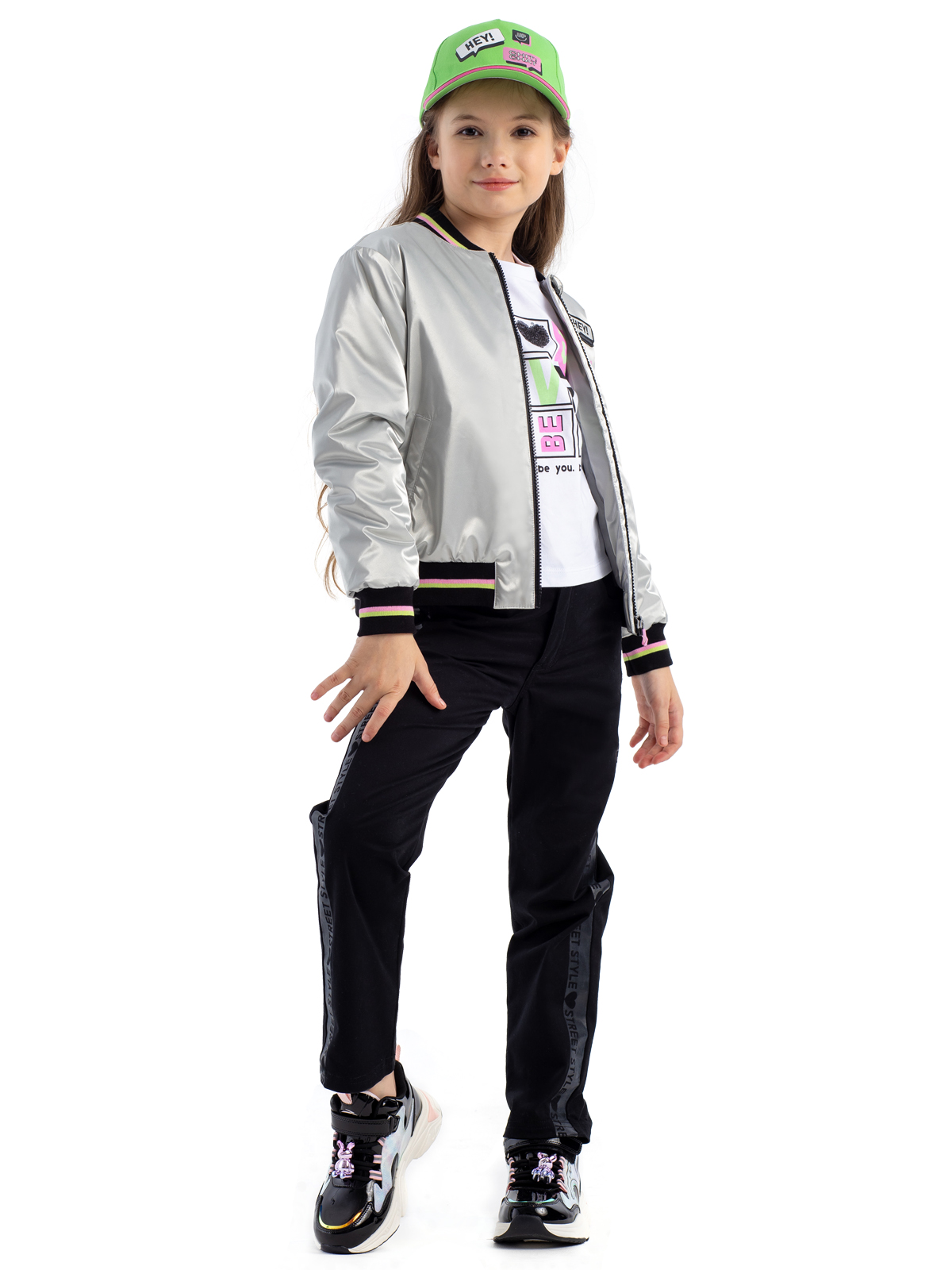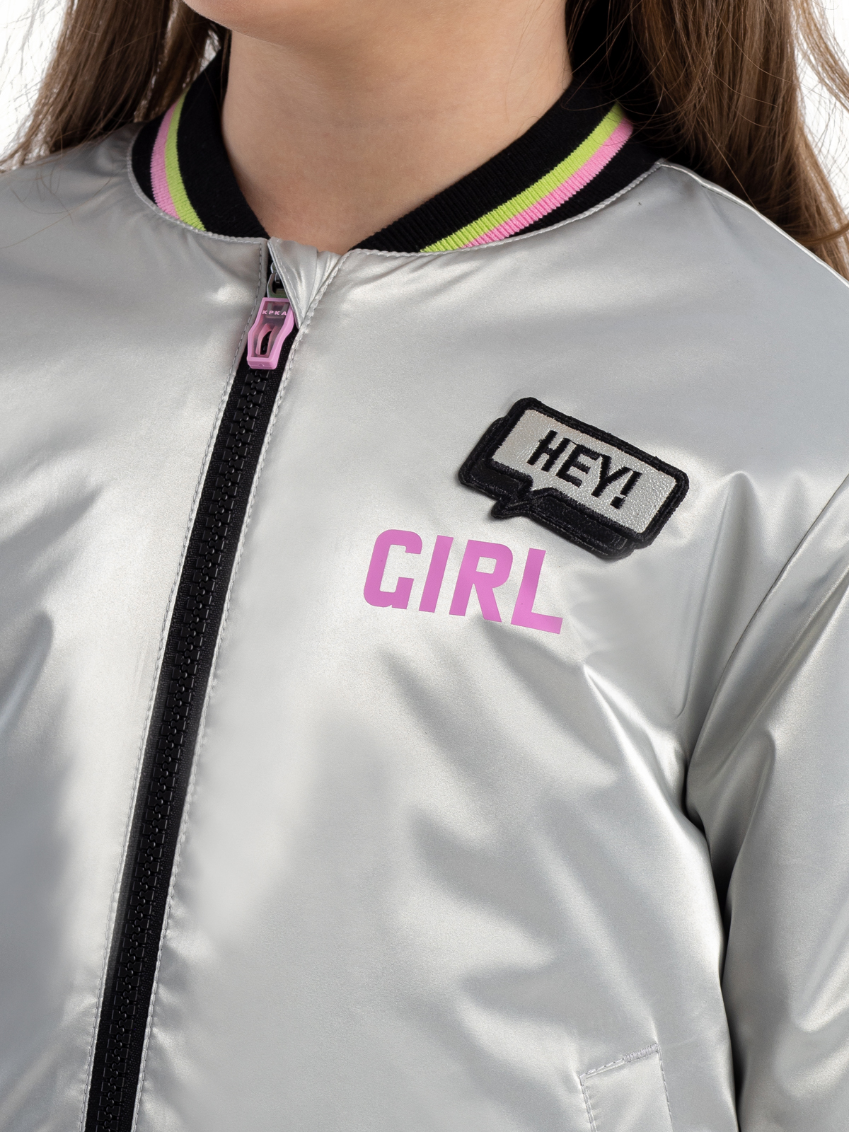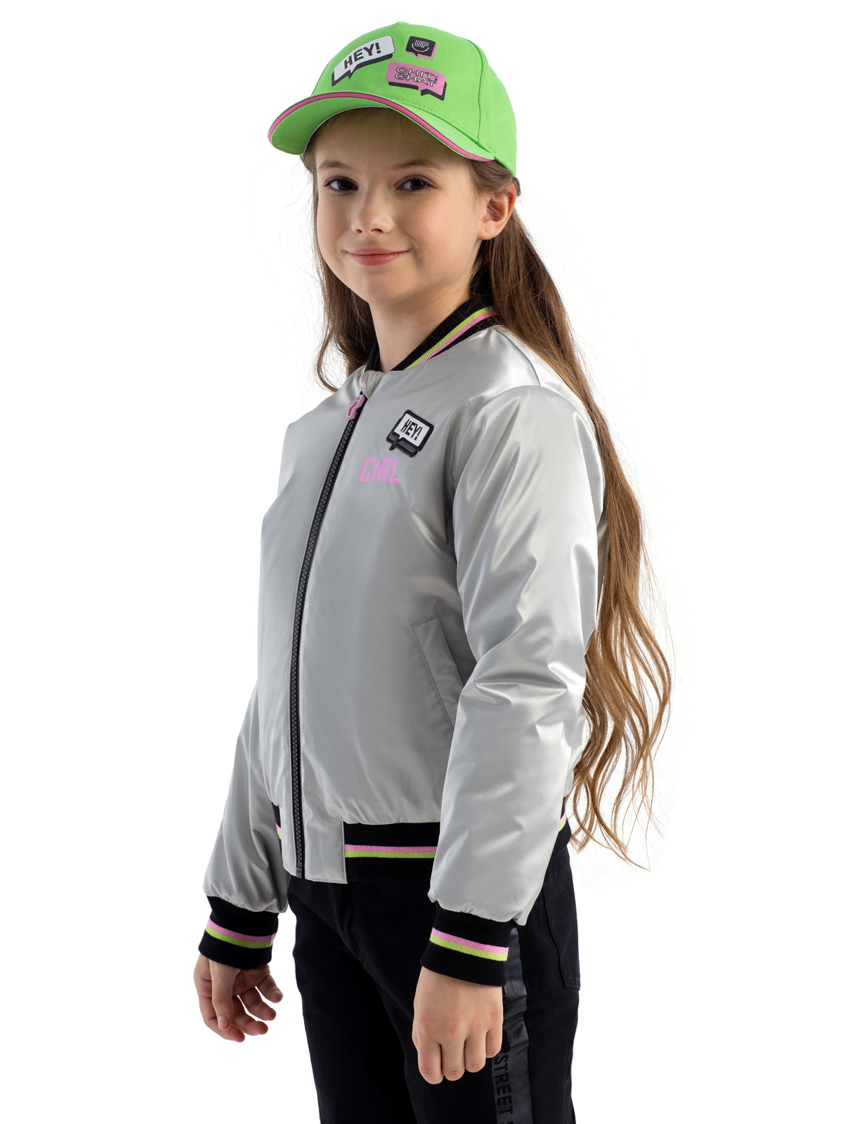 Бомбер для девочки выполнен из серебристой ткани с утеплителем 100 гр/м2. На груди расположены нашивки и принт, воротник, манжеты и низ оформлены полосатым рибом. Стильная фурнитура дополняет дизайн, а центральная молния с внутренней планкой надежно защищает от ветра.
