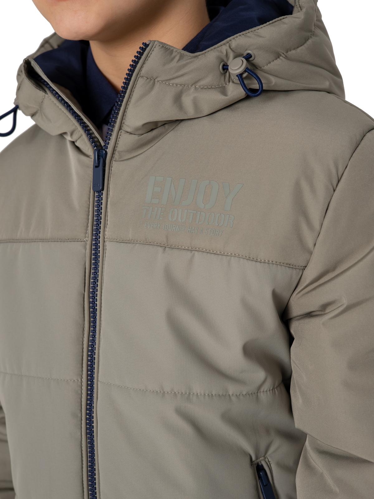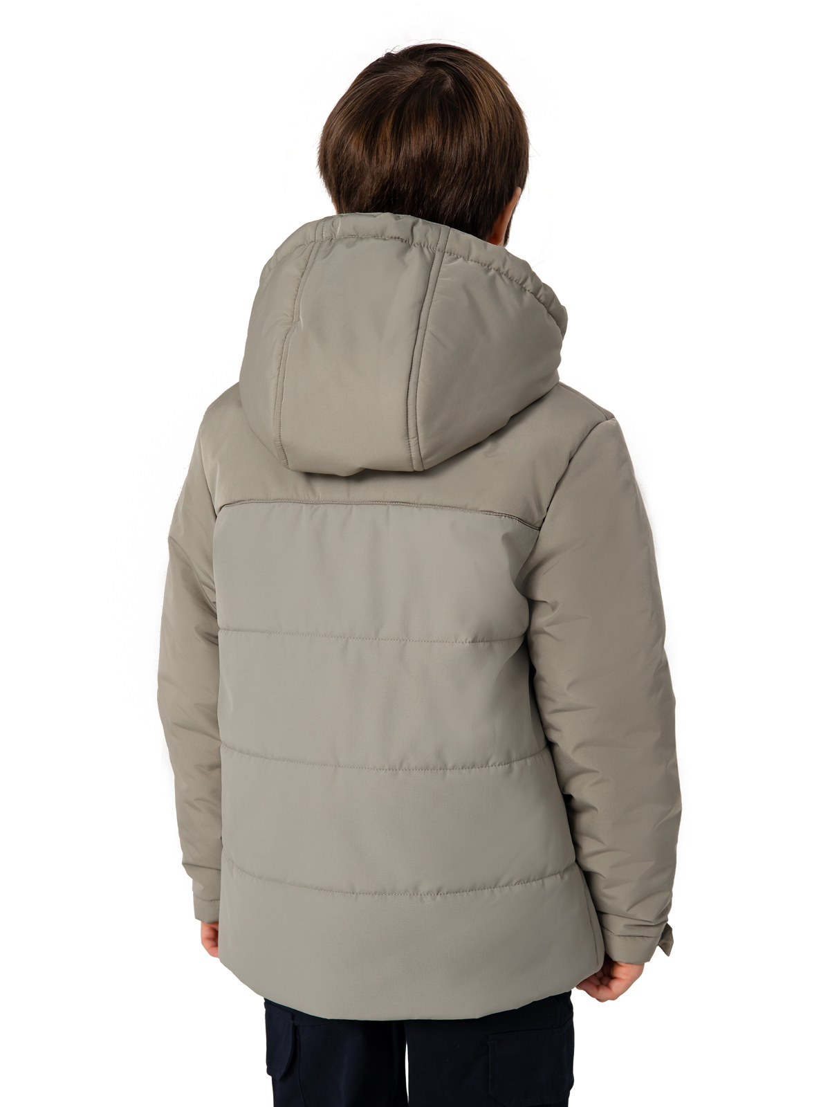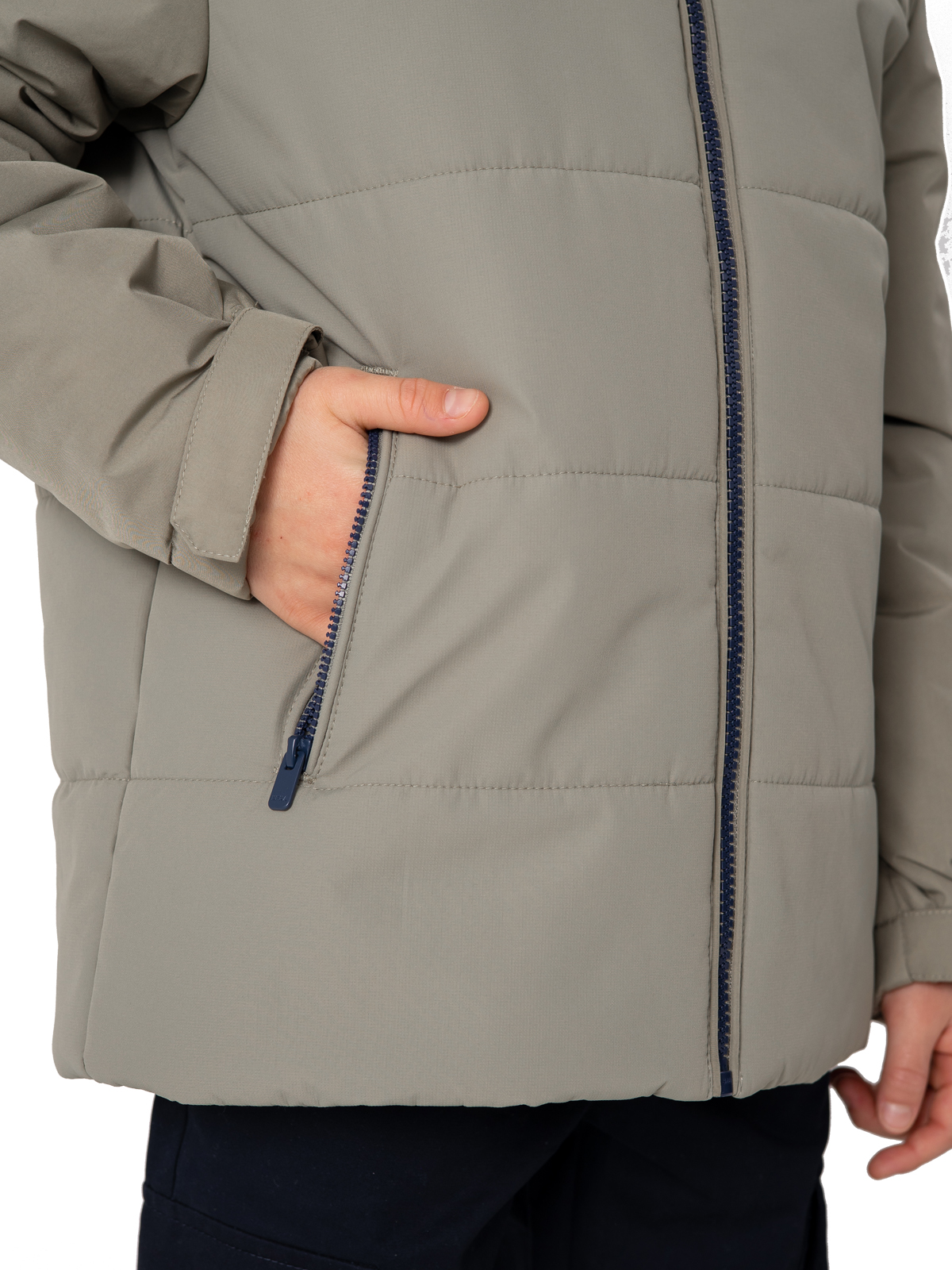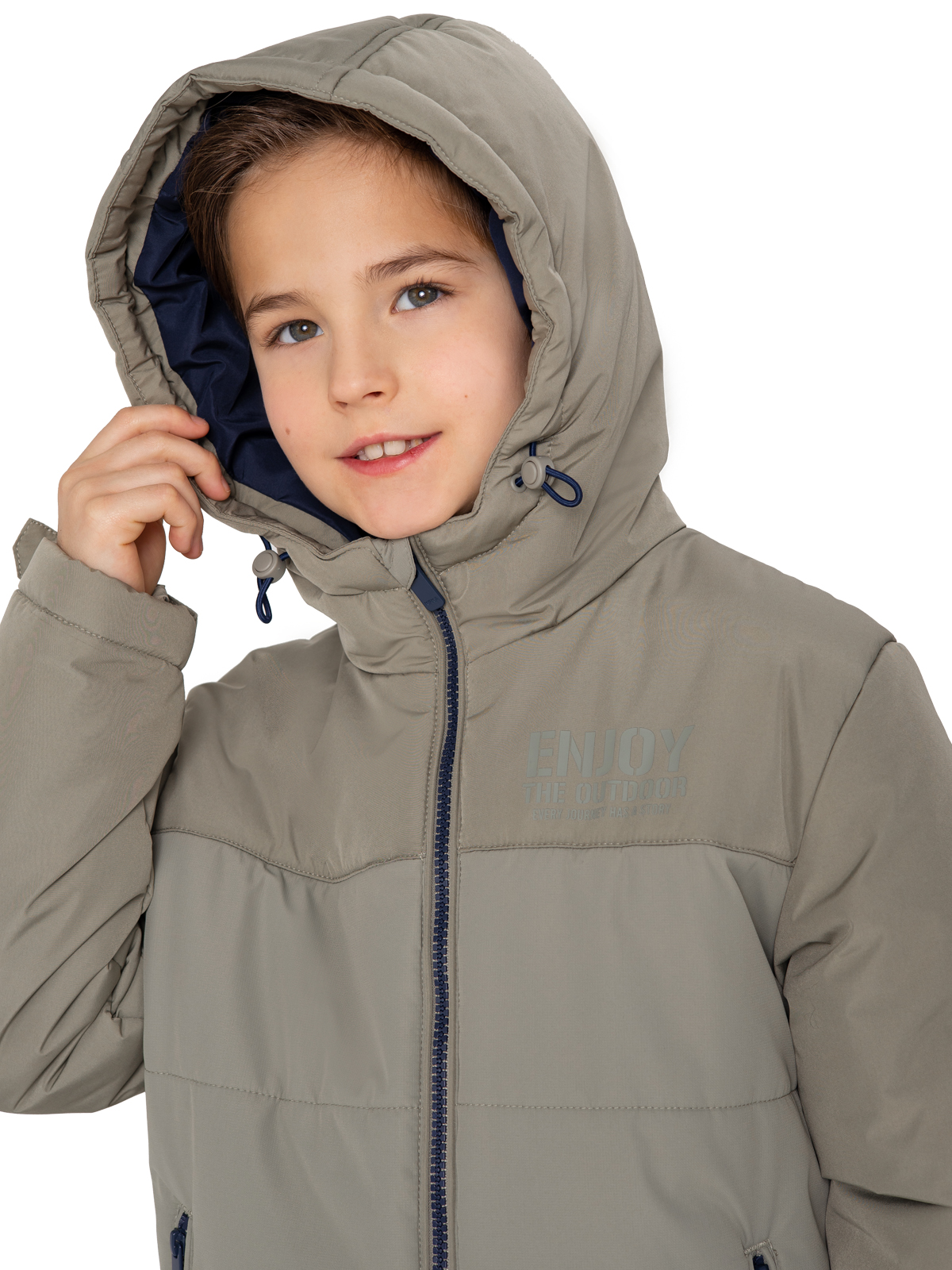 Стильная демисезонная куртка в благородном бежевом цвете станет отличным выбором для мальчика. Модель изготовлена из современного материала с мембраной 5000мм/5000г/м2/24ч, обеспечивающей надёжную защиту от влаги и отличную воздухопроницаемость. Утеплитель синтепон плотностью 160 г/м² гарантирует комфортную температуру в прохладную погоду. Дизайн дополнен контрастными элементами: тёмно-синей подкладкой и фурнитурой того же оттенка. Центральная молния, молнии в карманах и утяжка в регулируемом капюшоне выполнены в едином цветовом решении. Особую изюминку модели придаёт деликатный принт на груди, гармонично сочетающийся с основным цветом куртки. Практичная и стильная модель идеально подходит для повседневной носки.