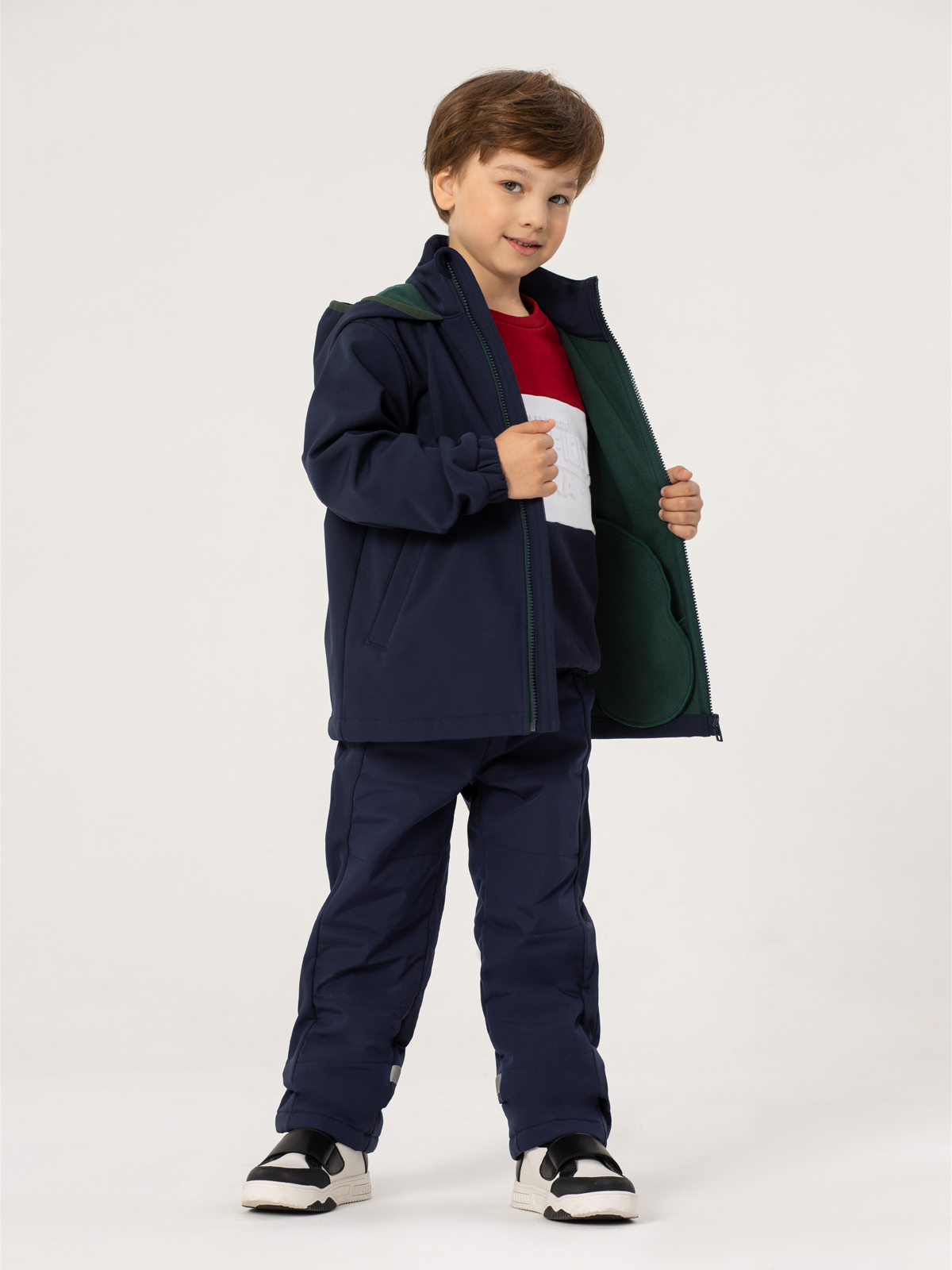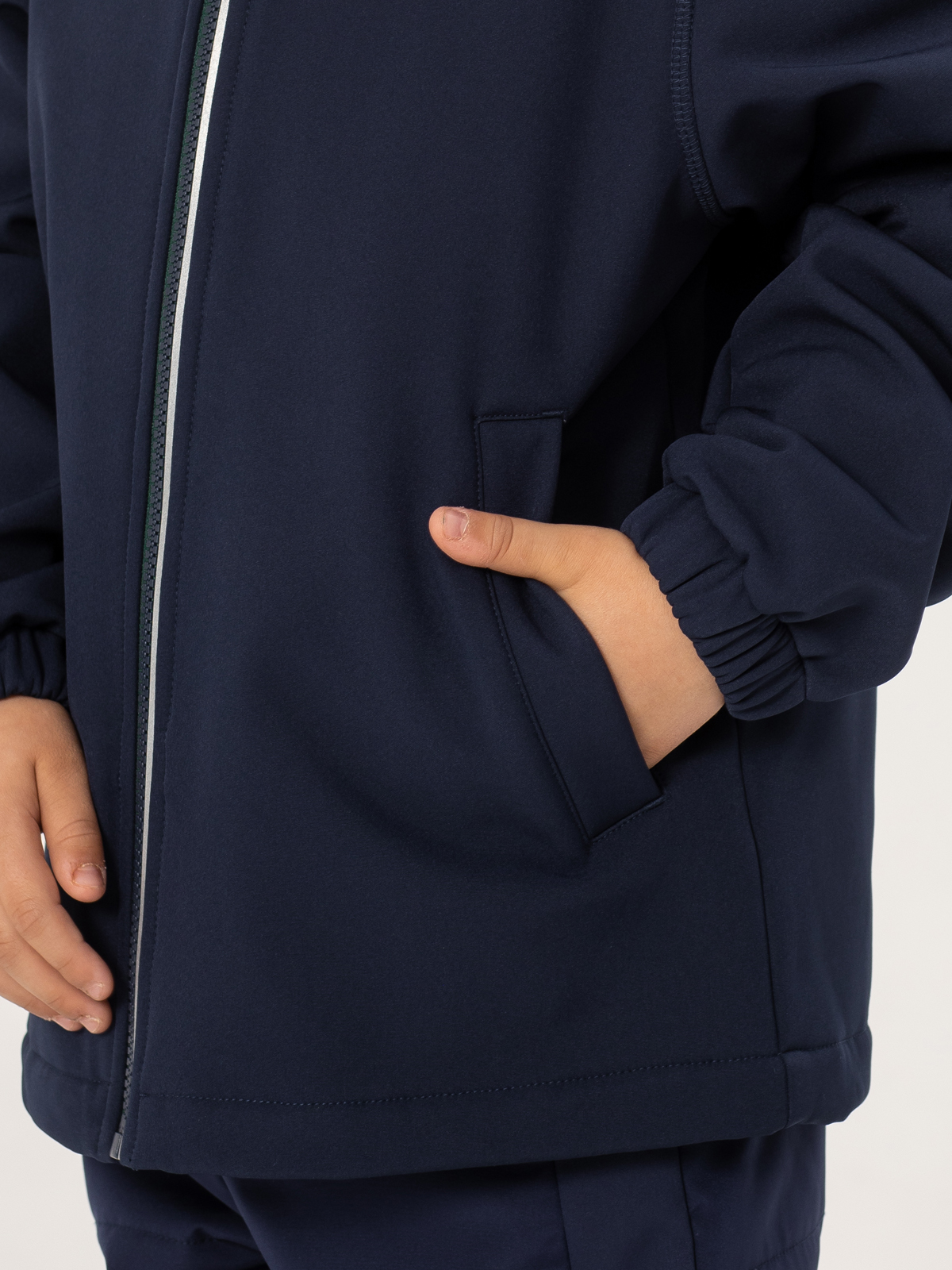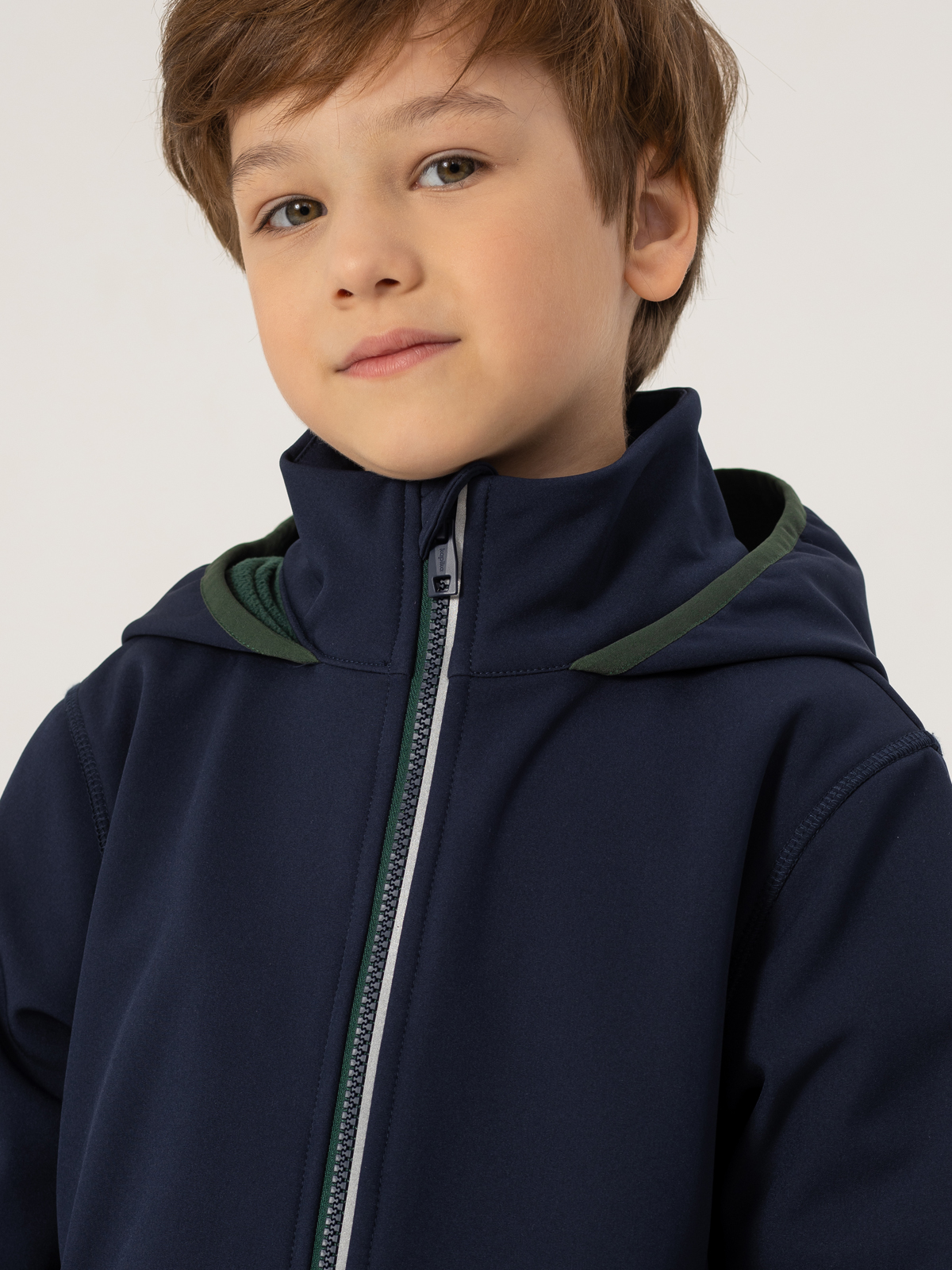 Тёмно-синяя куртка для мальчиков из материала софтшелл с водонеппроницаемой мембраной 5000мм/5000г/м2/24ч— идеальный выбор для активного зимнего сезона. Модель застегивается на центральную молнию. Воротник-стойка дополнительно защищает от холода. Практичный капюшон надёжно защищает от непогоды и ветра. Эластичные манжеты на рукавах с удобными резинками обеспечивают плотное прилегание и сохраняют тепло. Эта куртка сочетает в себе стиль, комфорт и функциональность, делая вашего ребёнка готовым к активным зимним приключениям.