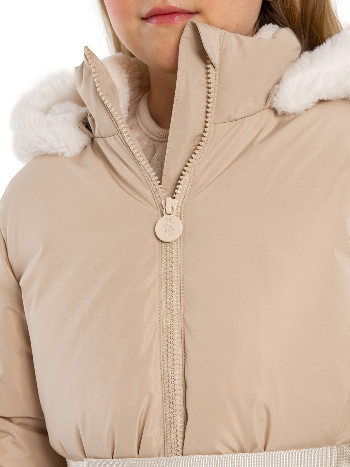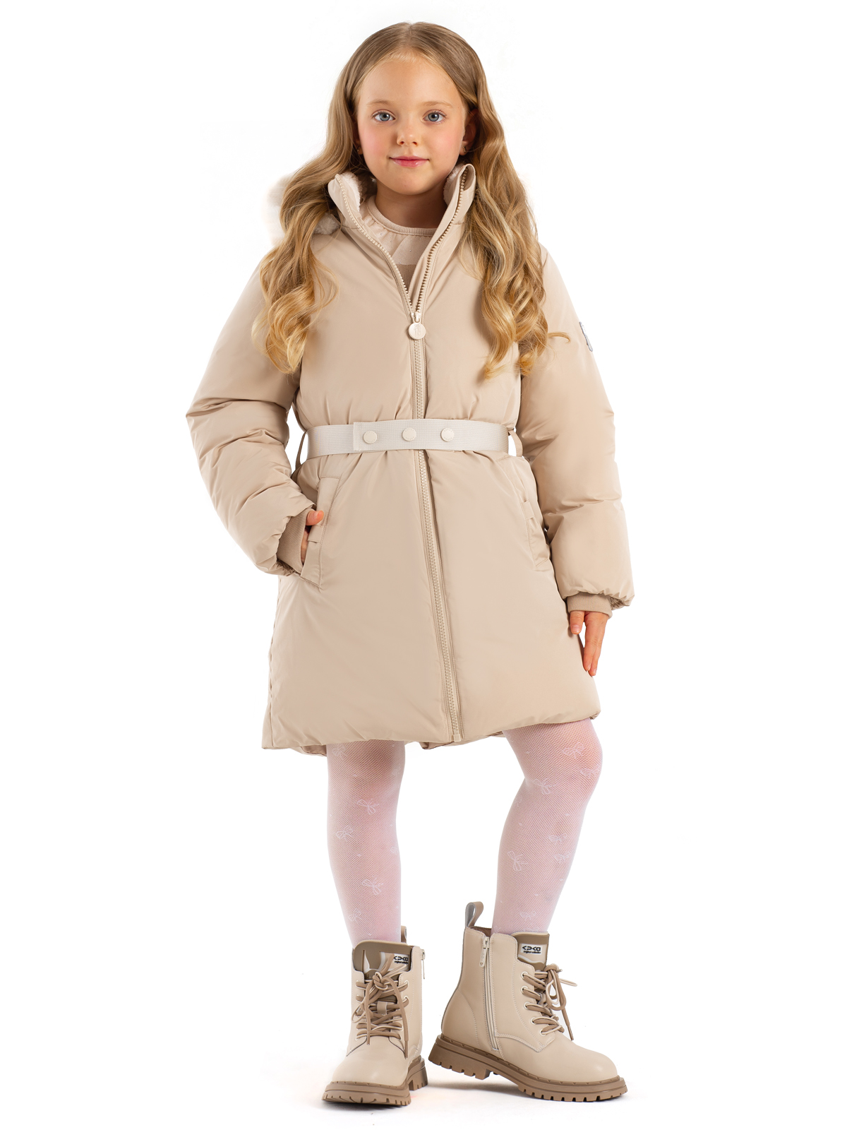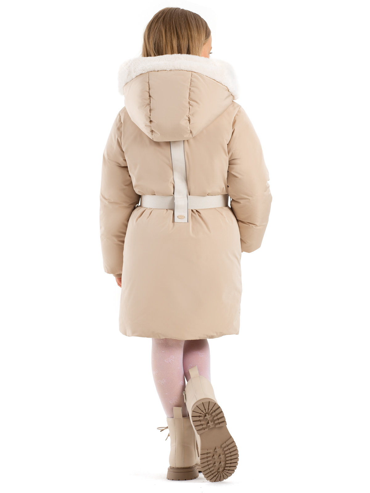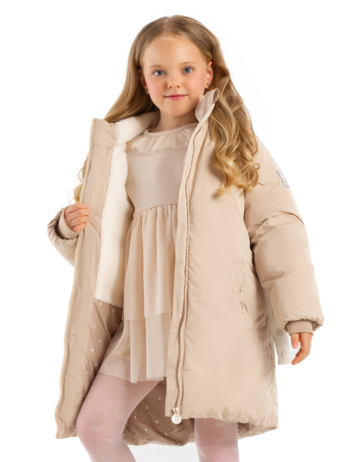 Элегантное удлинённое зимнее пальто в благородном бежевом цвете — идеальный выбор для девочки. Модель выполнена из премиального 100% полиэстера с современной мембраной 5000мм/5000г/м2/24ч, обеспечивающей надёжную защиту от влаги и отличную воздухопроницаемость. Тёплый искусственный пух плотностью 350 г/м² гарантирует комфорт даже в сильные морозы. Особую роскошь изделию придаёт внутренняя отделка: изысканный искусственный мех и элегантная подкладка в горох создают премиальный образ. Практичная застёжка-молния дополнена стильным поясом, который гармонично сочетается с декоративной тесьмой. Регулируемый капюшон с отделкой из белого искусственного меха обеспечивает дополнительную защиту от холода. Продуманный дизайн включает функциональные элементы: два удобных кармана с листочками для необходимых мелочей, мягкие рибовые манжеты для защиты от ветра и изящный патч-бантик на рукаве. Это пальто станет незаменимой частью гардероба юной модницы.