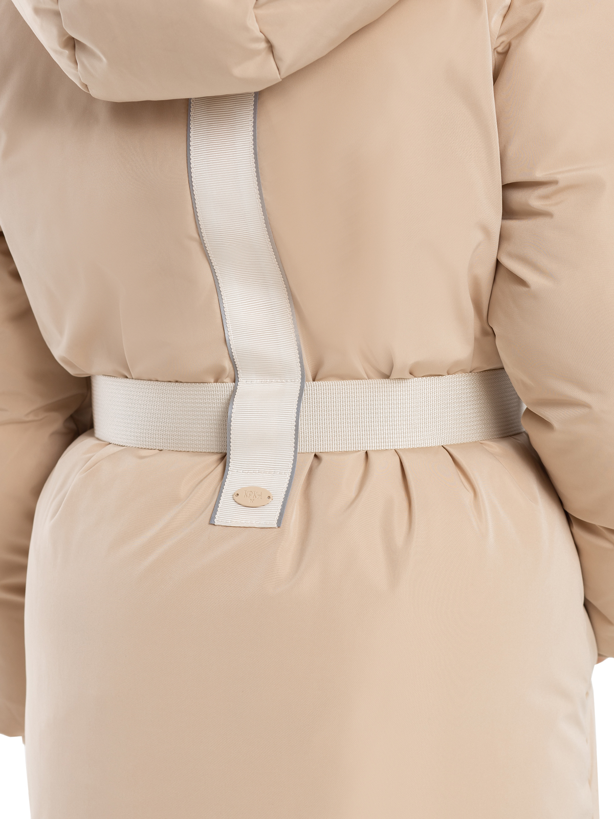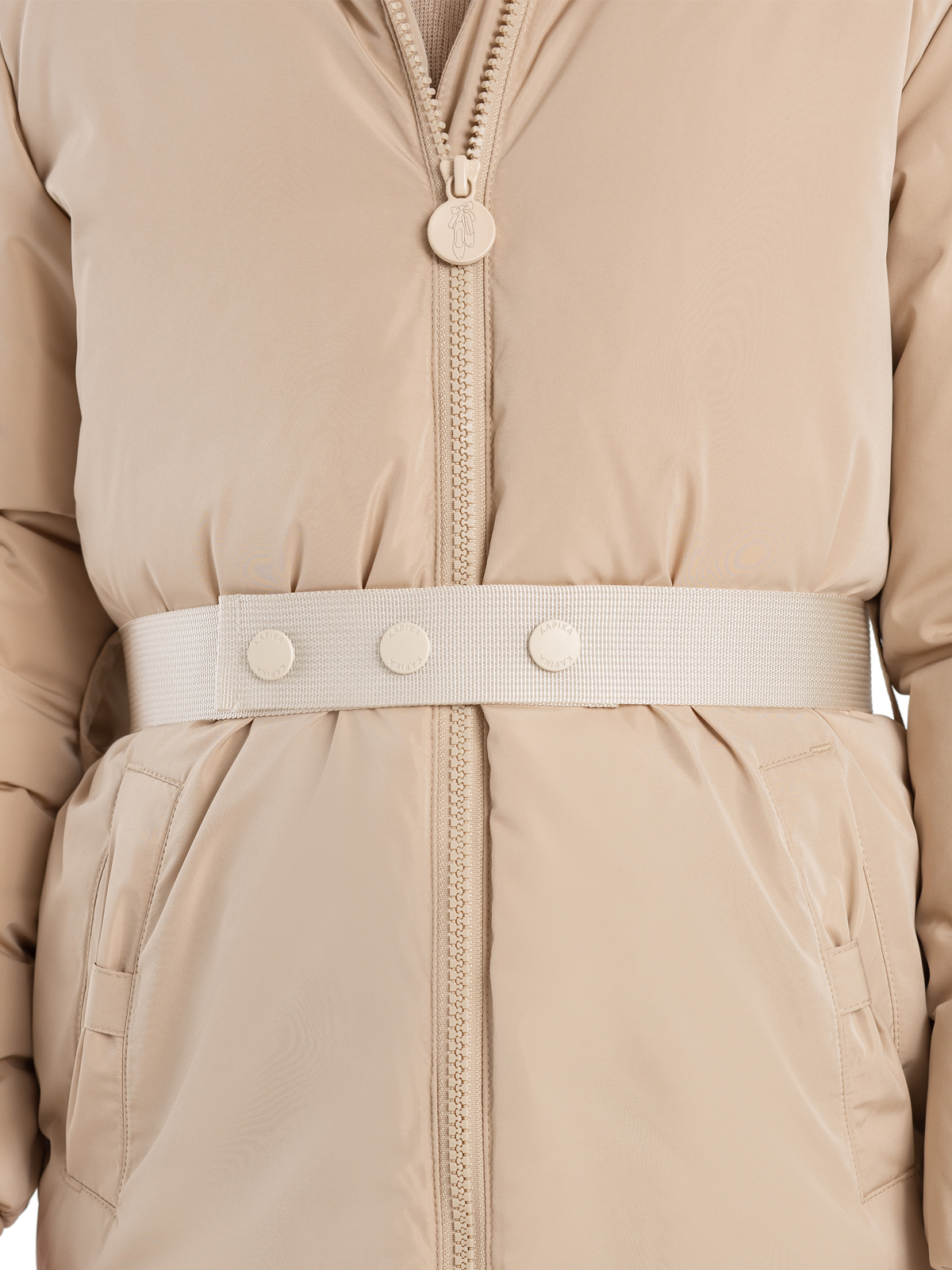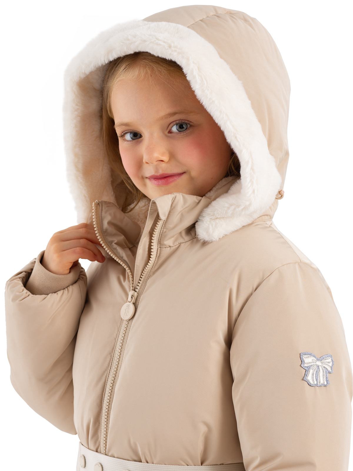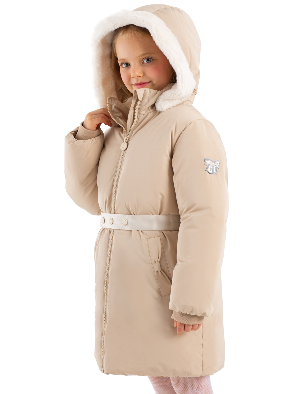 Элегантное удлинённое зимнее пальто в благородном бежевом цвете — идеальный выбор для девочки. Модель выполнена из премиального 100% полиэстера с современной мембраной 5000мм/5000г/м2/24ч, обеспечивающей надёжную защиту от влаги и отличную воздухопроницаемость. Тёплый искусственный пух плотностью 350 г/м² гарантирует комфорт даже в сильные морозы. Особую роскошь изделию придаёт внутренняя отделка: изысканный искусственный мех и элегантная подкладка в горох создают премиальный образ. Практичная застёжка-молния дополнена стильным поясом, который гармонично сочетается с декоративной тесьмой. Регулируемый капюшон с отделкой из белого искусственного меха обеспечивает дополнительную защиту от холода. Продуманный дизайн включает функциональные элементы: два удобных кармана с листочками для необходимых мелочей, мягкие рибовые манжеты для защиты от ветра и изящный патч-бантик на рукаве. Это пальто станет незаменимой частью гардероба юной модницы.