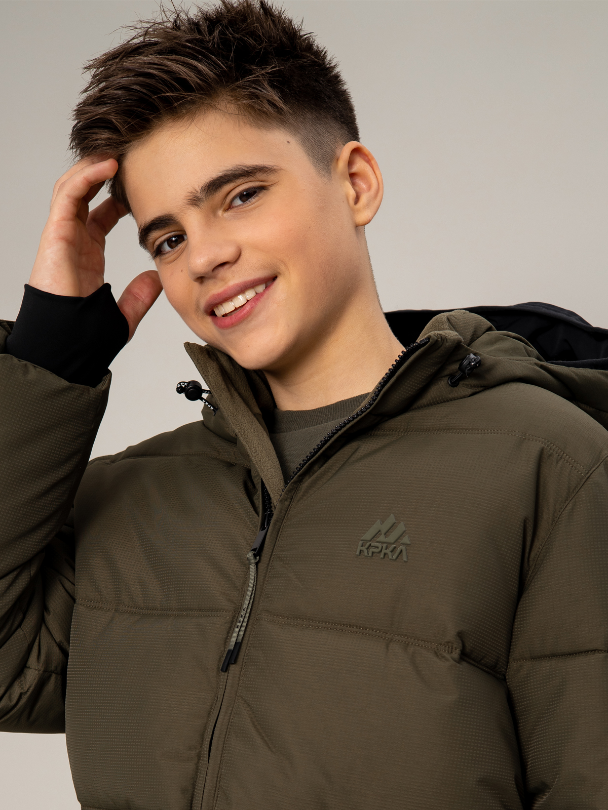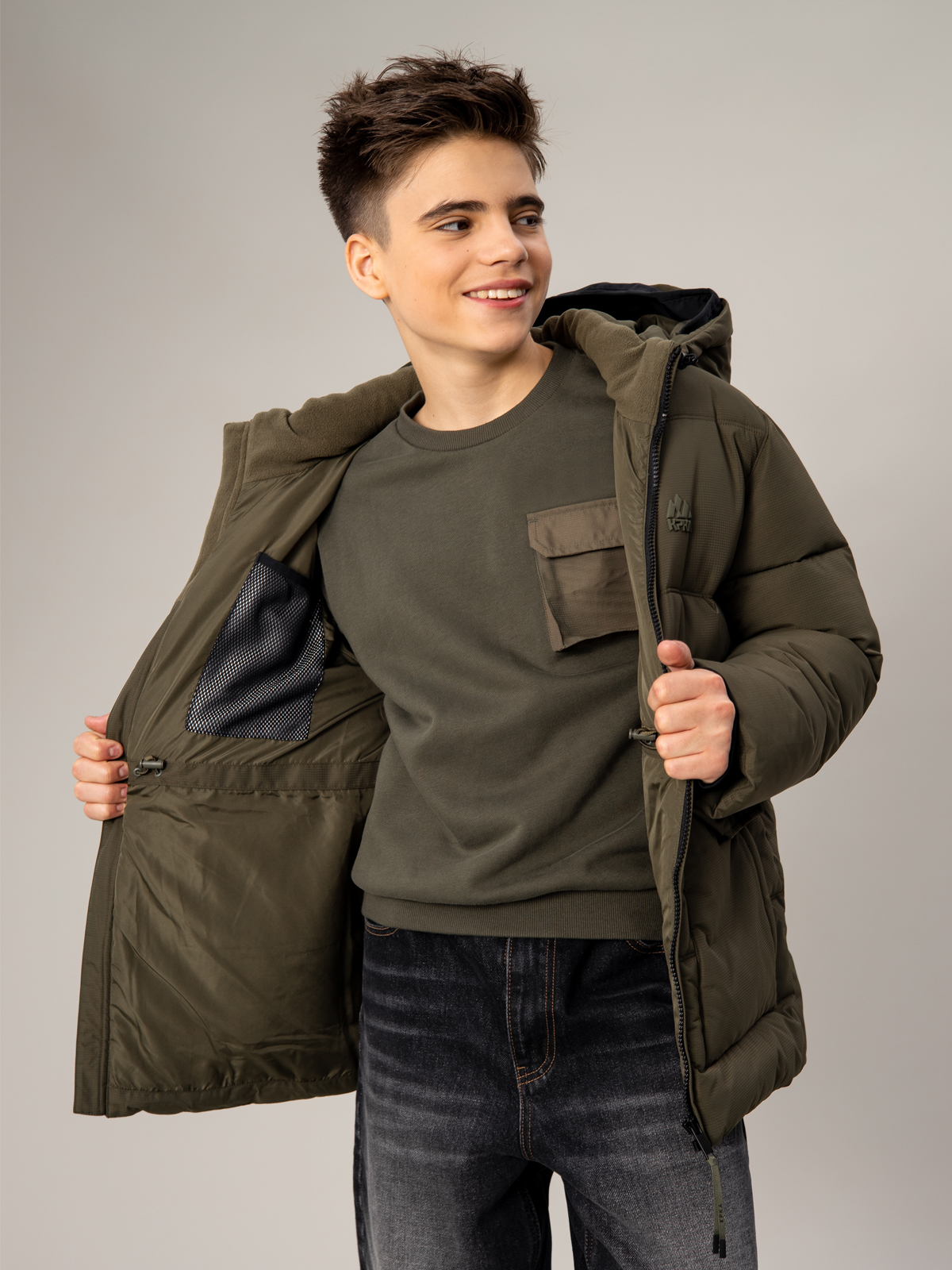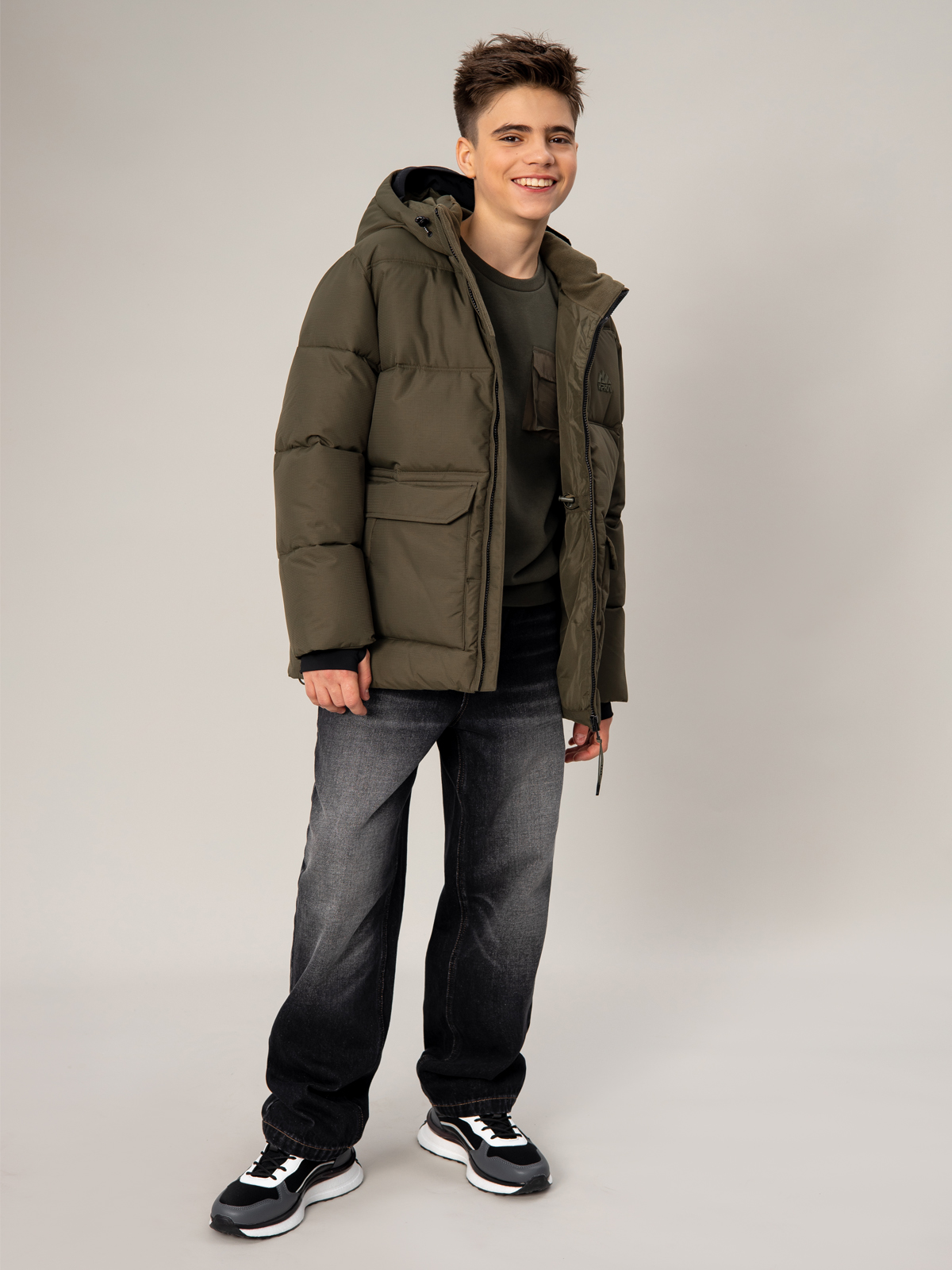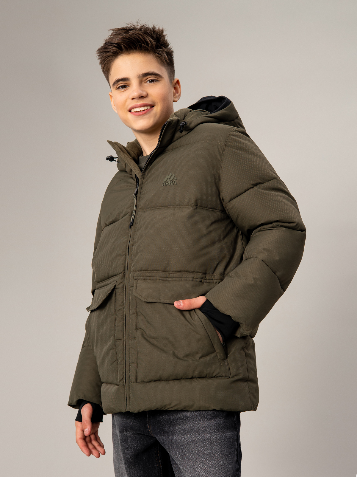 Тёплый зимний пуховик для мальчика в цвете хаки с мембранной тканью 5000 мм / 5000 г/м² и утеплителем из искусственного пуха плотностью 350 г/м². Модель отличается эффективной защитой от влаги и отличной воздухопроницаемостью. Горизонтальная стёжка придаёт стильный вид, а регулируемый капюшон обеспечивает комфортную посадку. Пуховик оснащён центральной молнией, функциональными накладными карманами с клапанами и молниями, эластичными манжетами на рукавах. Продуманная конструкция гарантирует тепло и комфорт в холодную погоду.