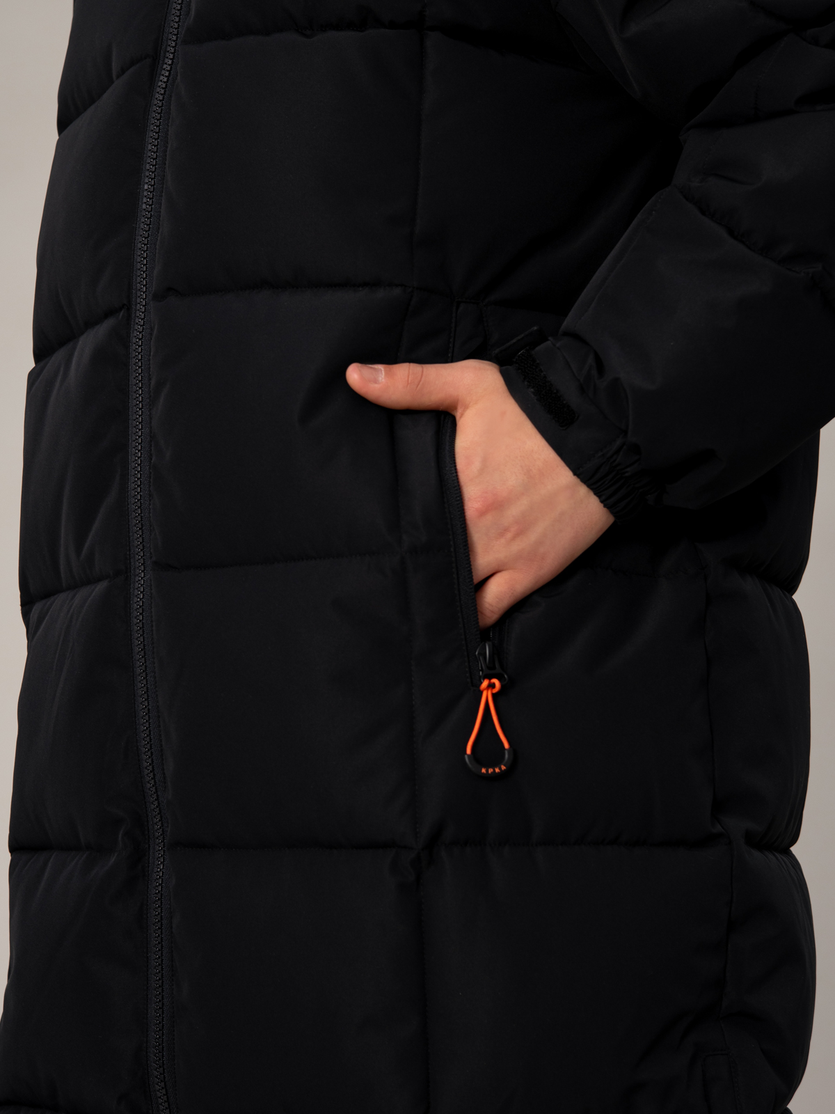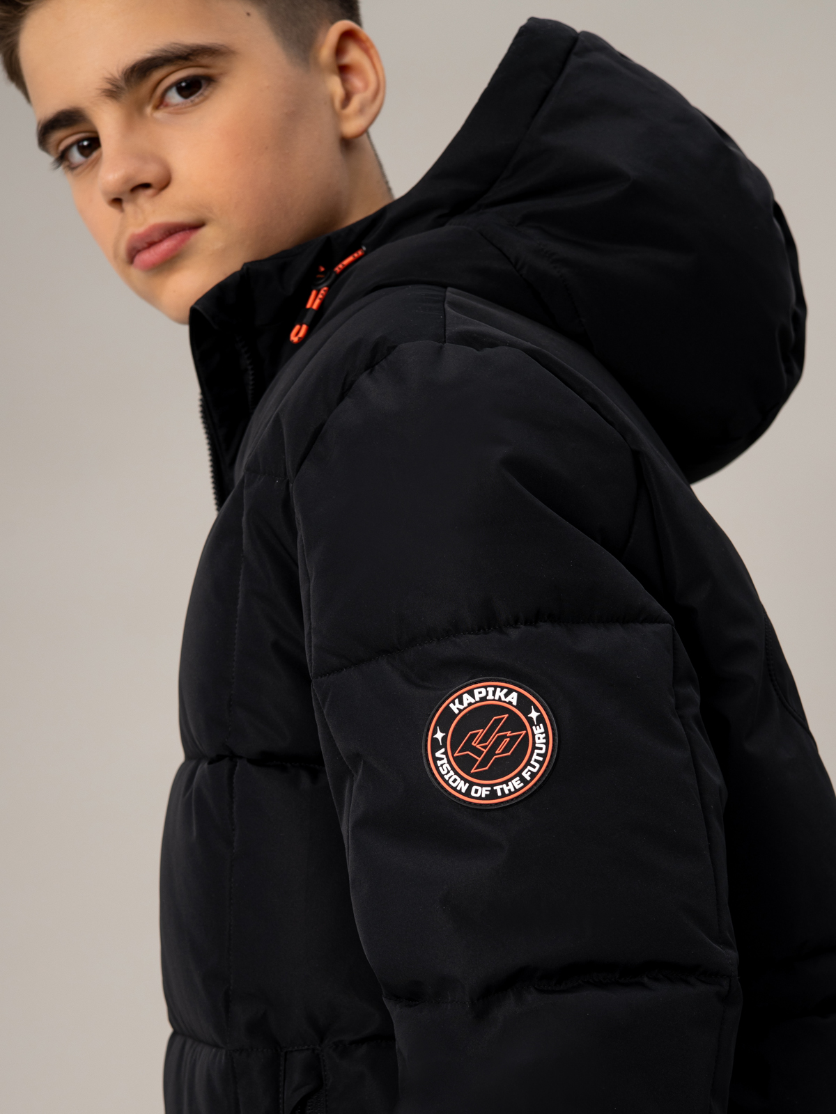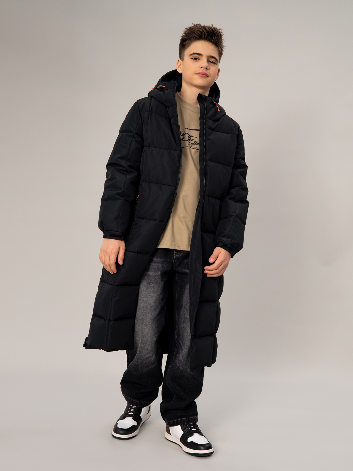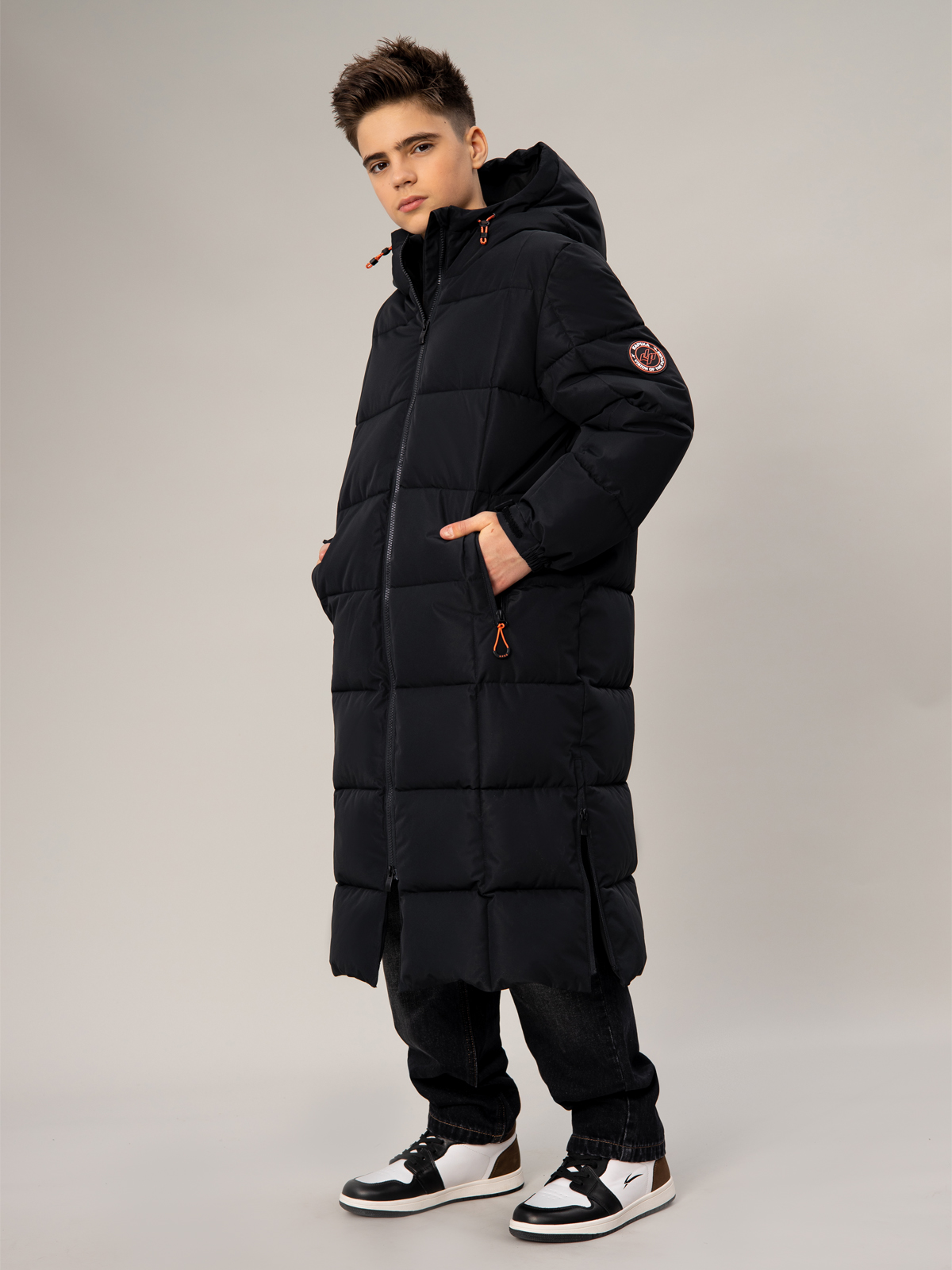 Стильный чёрный пуховик для мальчика с удлинённым силуэтом. Прочный материал с мембранными характеристиками 5000 мм / 5000 г/м² надёжно защищает от непогоды, а искусственный пух плотностью 350 г/м² создаёт комфортный микроклимат. В конструкции продумана каждая деталь: регулируемый капюшон, практичная молния, два вместительных кармана с застёжками и боковые молнии для свободы движений. Специальные паты на манжетах и внутренняя утяжка по талии обеспечивают идеальную посадку. Контрастные оранжевые акценты в фурнитуре придают модели спортивный характер, а фирменный патч на рукаве подчёркивает статусность. Универсальный дизайн делает эту модель незаменимой для активных зимних приключений.