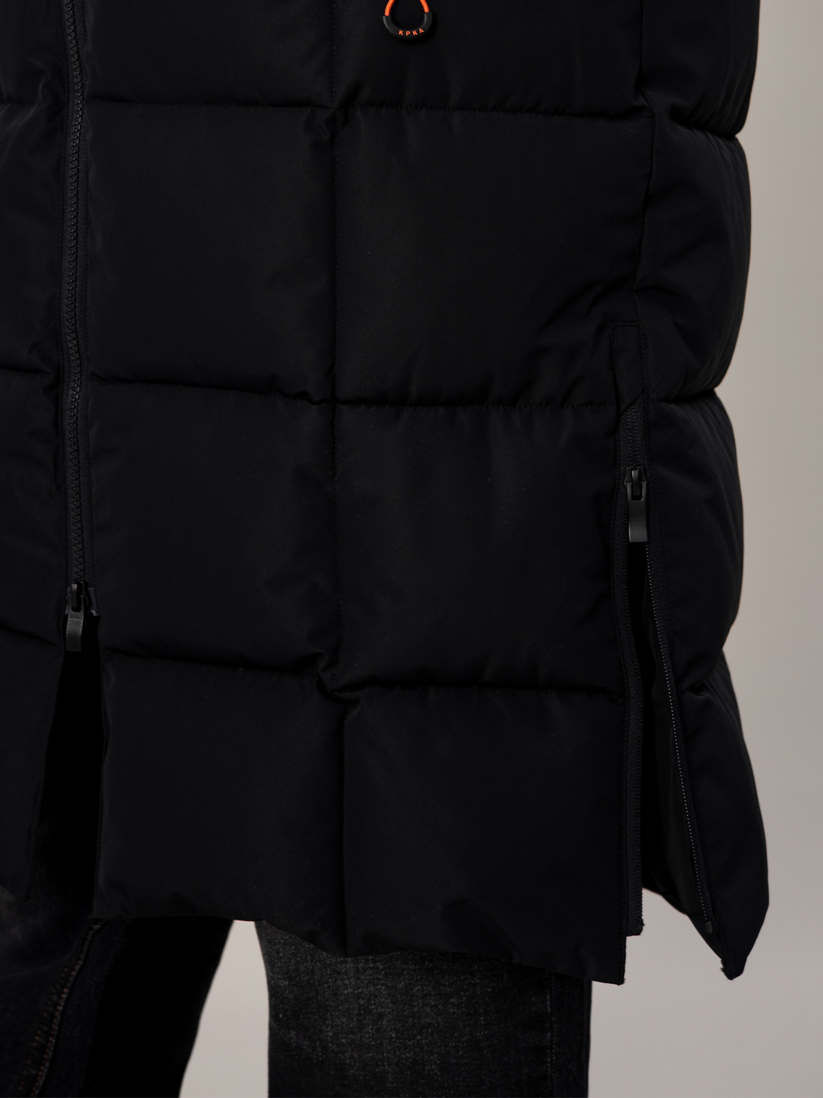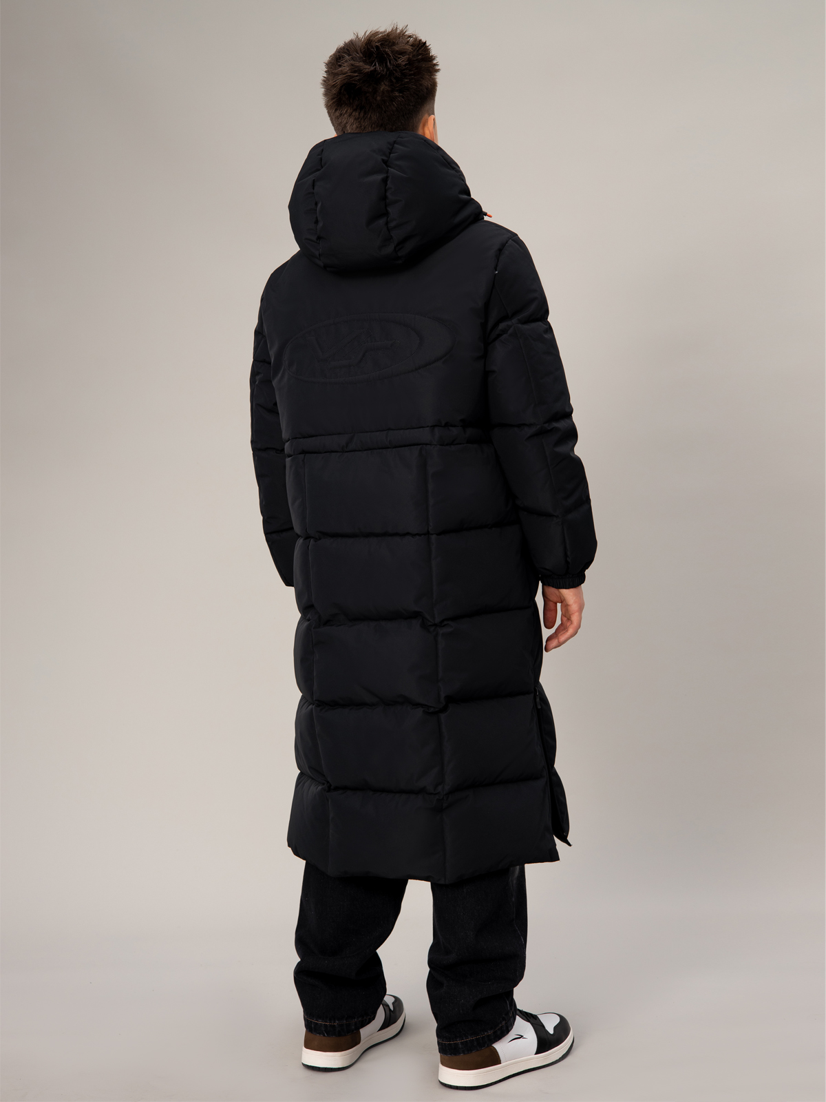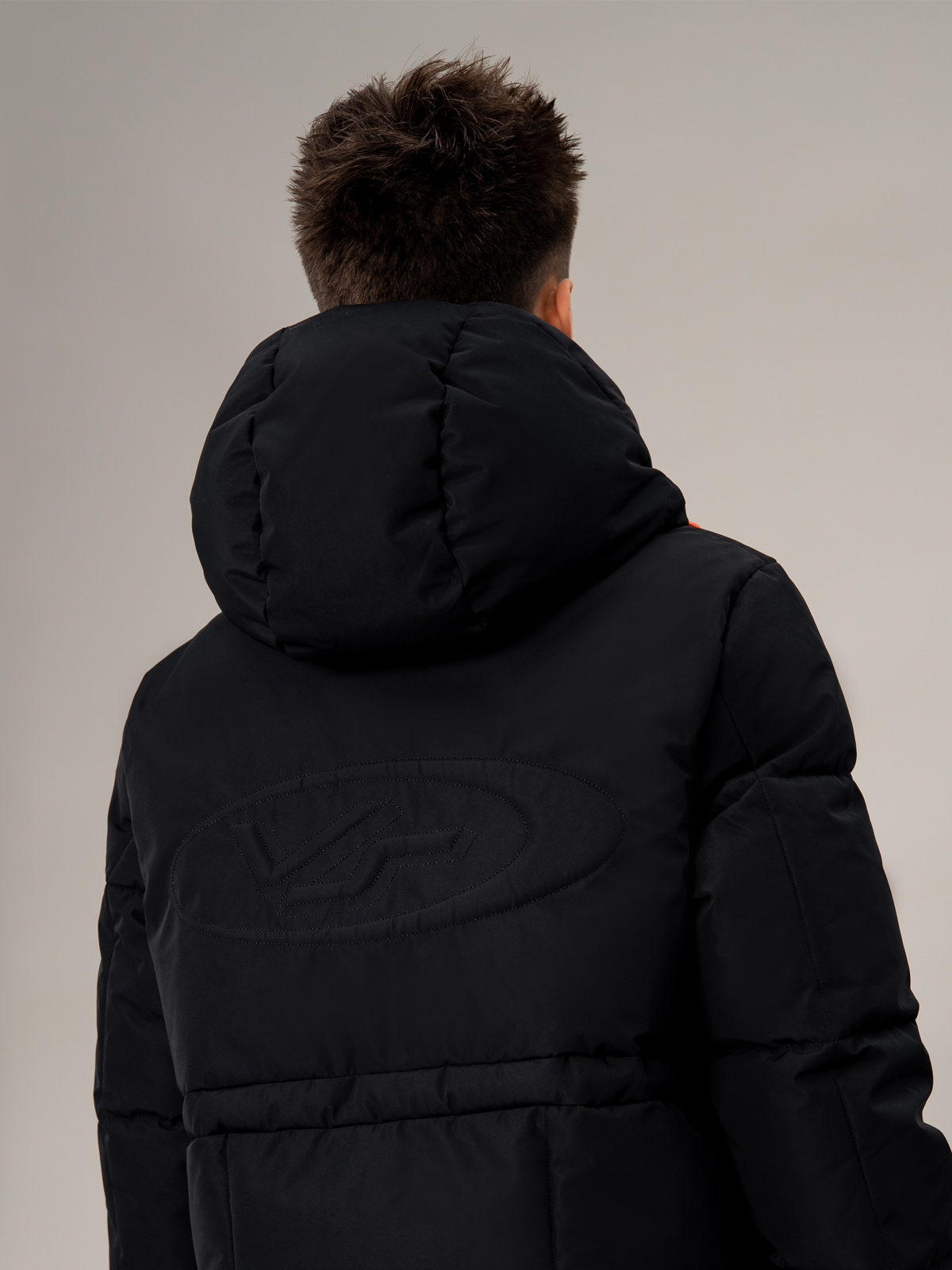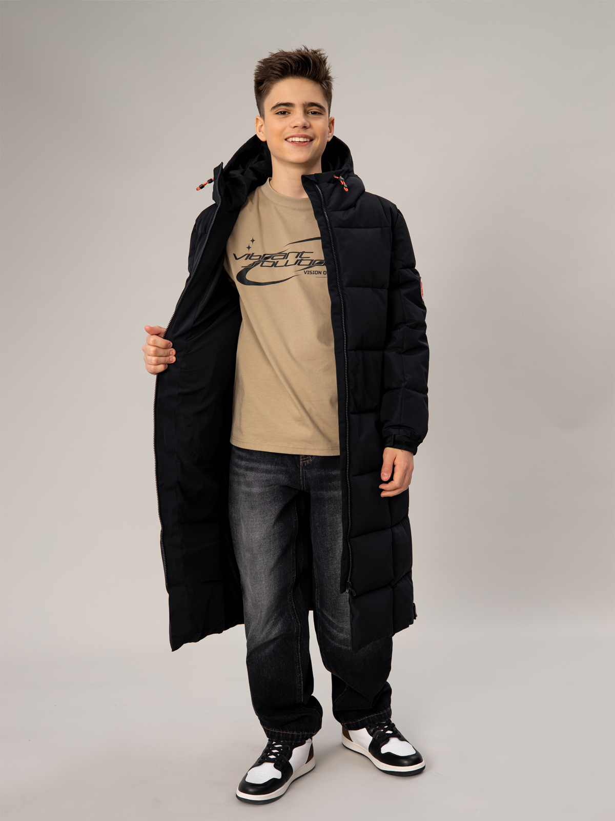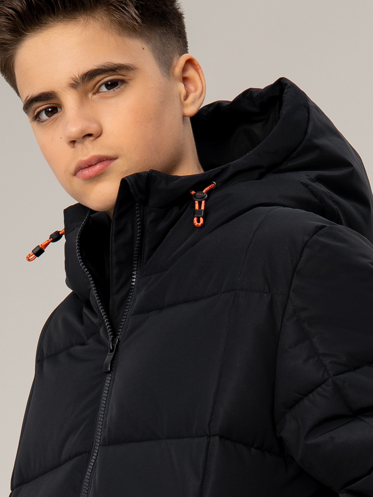 Стильный чёрный пуховик для мальчика с удлинённым силуэтом. Прочный материал с мембранными характеристиками 5000 мм / 5000 г/м² надёжно защищает от непогоды, а искусственный пух плотностью 350 г/м² создаёт комфортный микроклимат. В конструкции продумана каждая деталь: регулируемый капюшон, практичная молния, два вместительных кармана с застёжками и боковые молнии для свободы движений. Специальные паты на манжетах и внутренняя утяжка по талии обеспечивают идеальную посадку. Контрастные оранжевые акценты в фурнитуре придают модели спортивный характер, а фирменный патч на рукаве подчёркивает статусность. Универсальный дизайн делает эту модель незаменимой для активных зимних приключений.