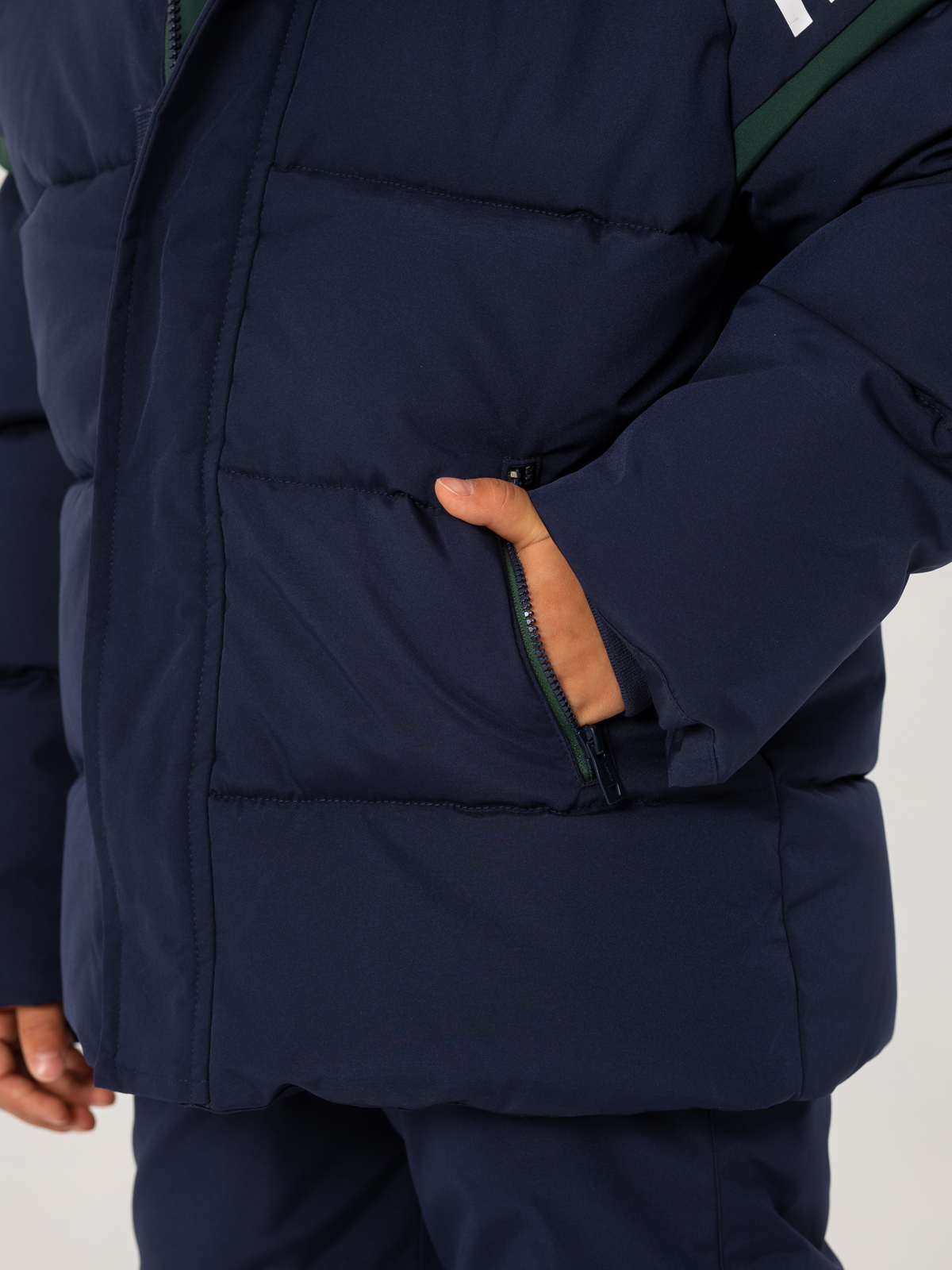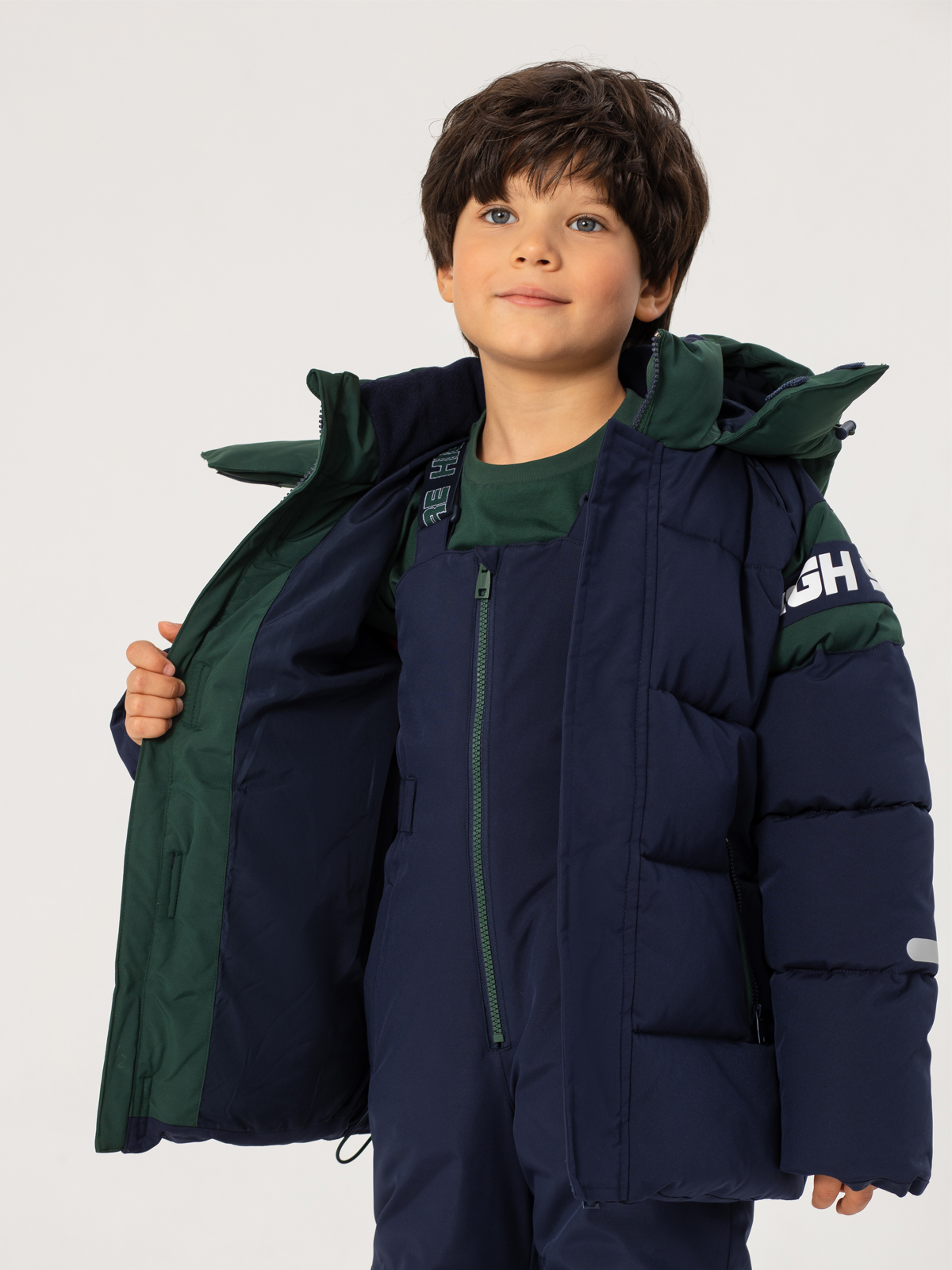 Стеганая зимняя куртка для мальчиков в сочетании тёмно-синего и зелёного цветов в технике колор-блок - оригинальный и практичный выбор для вашего ребенка. Практичность этой модели обеспечивается качественным утеплителем из искусственного пуха с плотностью 350 г/м², который эффективно сохраняет тепло даже в сильные морозы, ткань с мембраной 5000мм/5000г/м2/24ч защищает от влаги. Куртка оснащена удобной молнией и ветрозащитной планкой, что позволяет надёжно защитить ребёнка от холода и неприятных погодных условий. Регулируемый капюшон добавляет комфорт и защиту от непогоды, а также позволяет адаптировать куртку под различные погодные условия. Светоотражающие элементы делают ребёнка более заметным на дороге и в темное время суток. Эта куртка станет отличным выбором для зимних прогулок, сочетая в себе стиль, комфорт и функциональность.