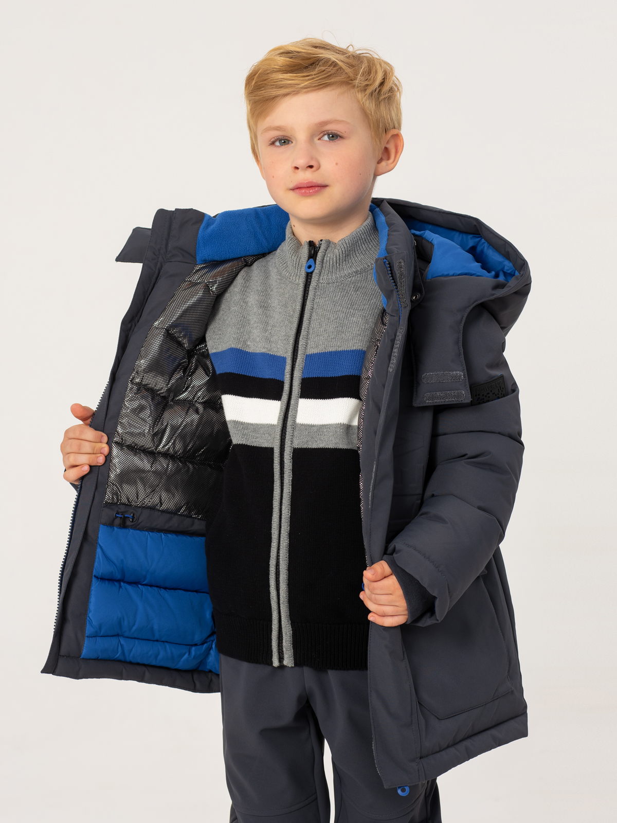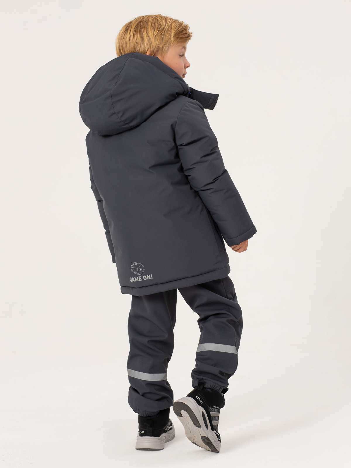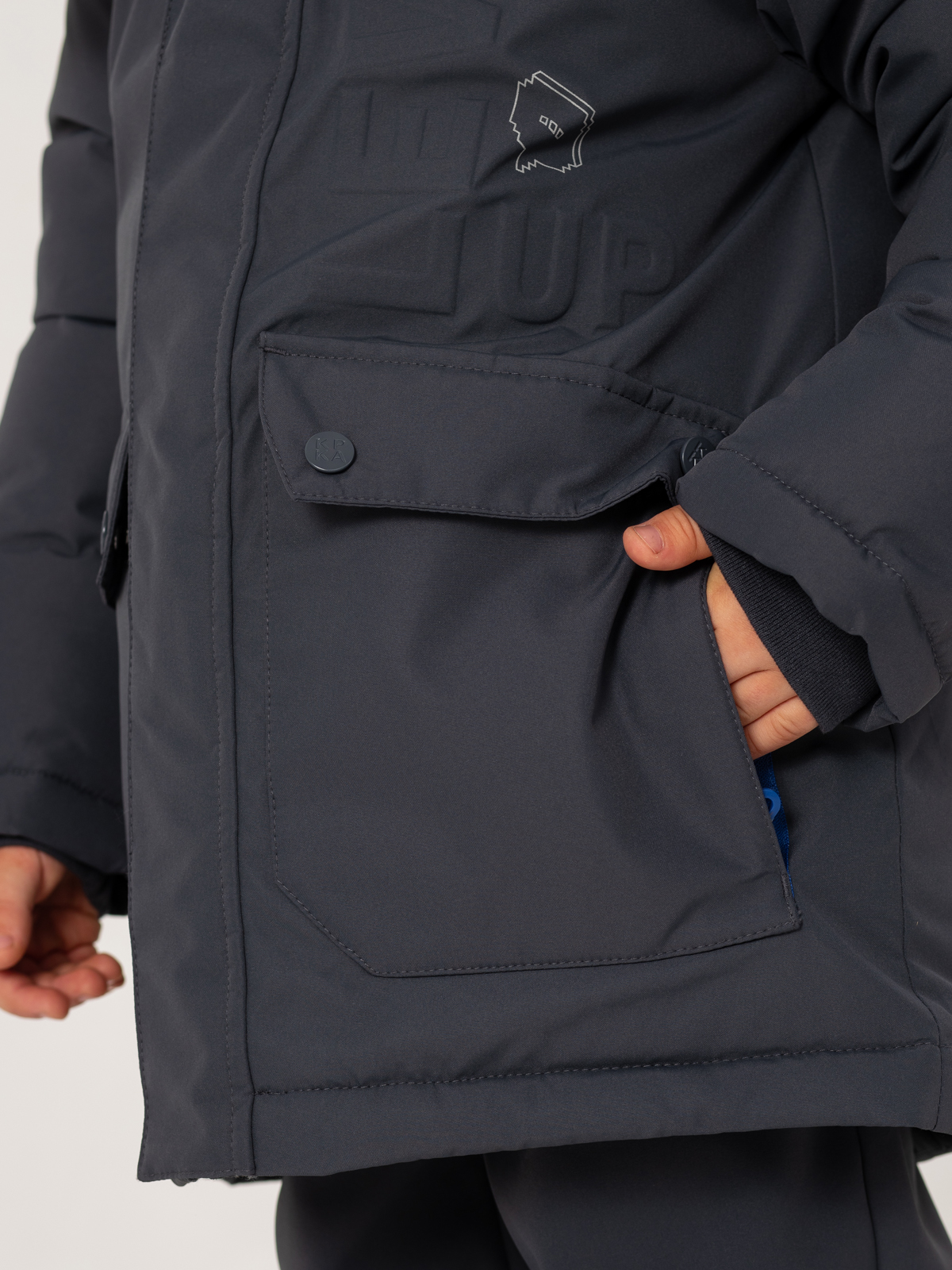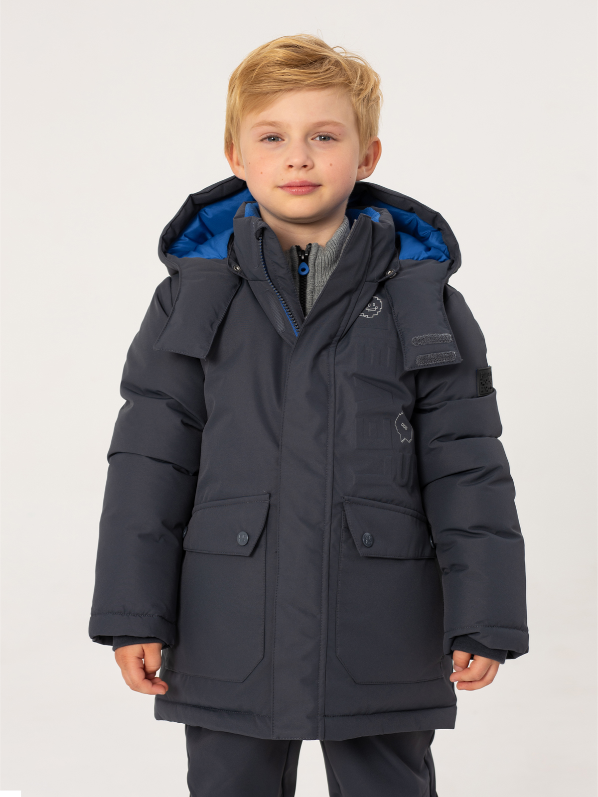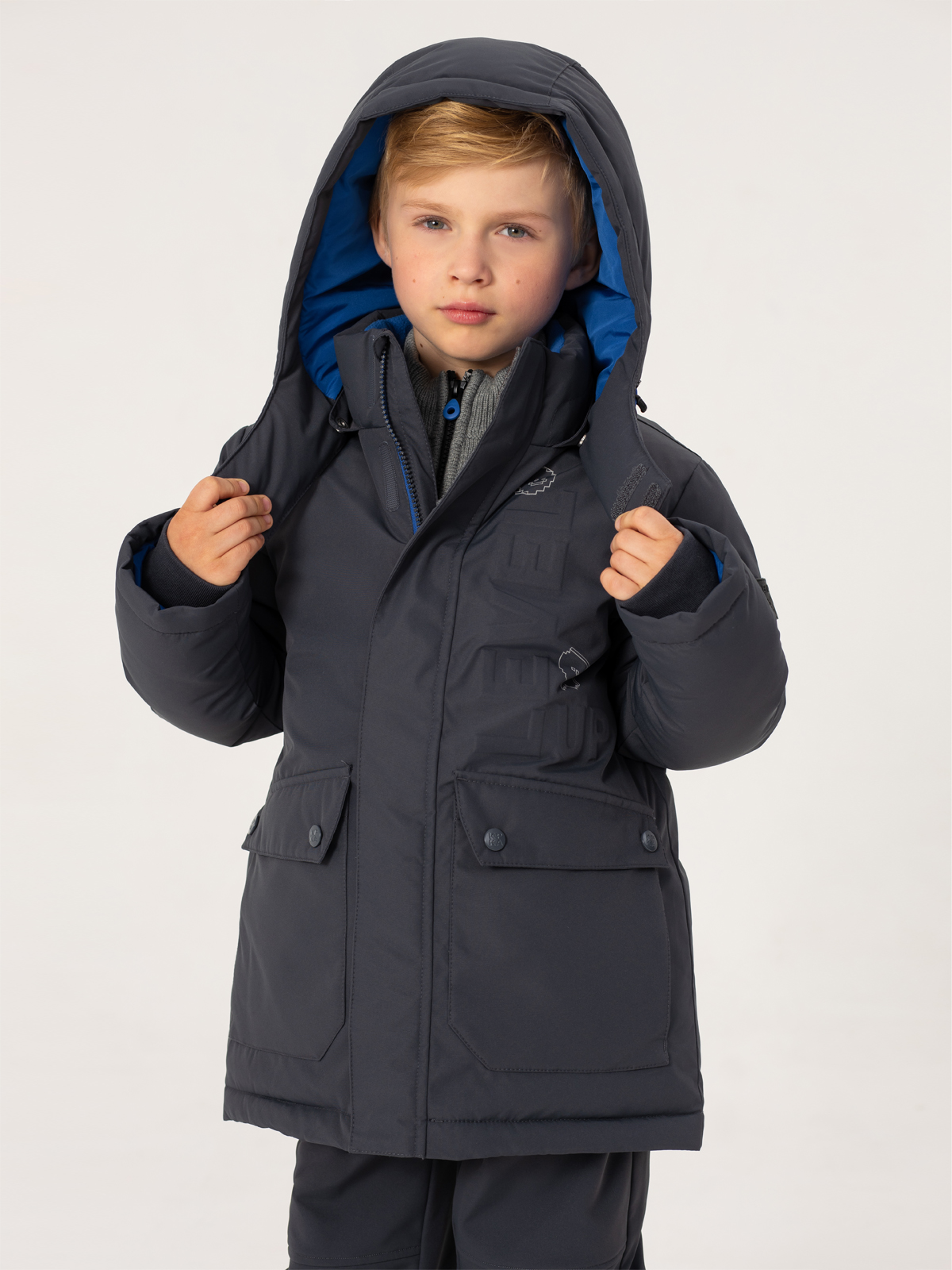 Теплая зимняя куртка серого цвета для активного мальчика станет надежным защитником от холода. Утепленная модель с искусственным пухом плотностью 350 г/м² обеспечит комфорт даже в морозную погоду. Материал с мембраной 5000/5000 гарантирует превосходную водостойкость и отличную воздухопроницаемость.Стильный дизайн дополняют яркие акценты — контрастная подкладка капюшона. Практичные накладные карманы с клапанами на кнопках помогут сохранить важные мелочи, а регулируемый капюшон и воротник на липучках защитят от ветра. Удобная конструкция позволит ребенку свободно двигаться во время игр и прогулок.