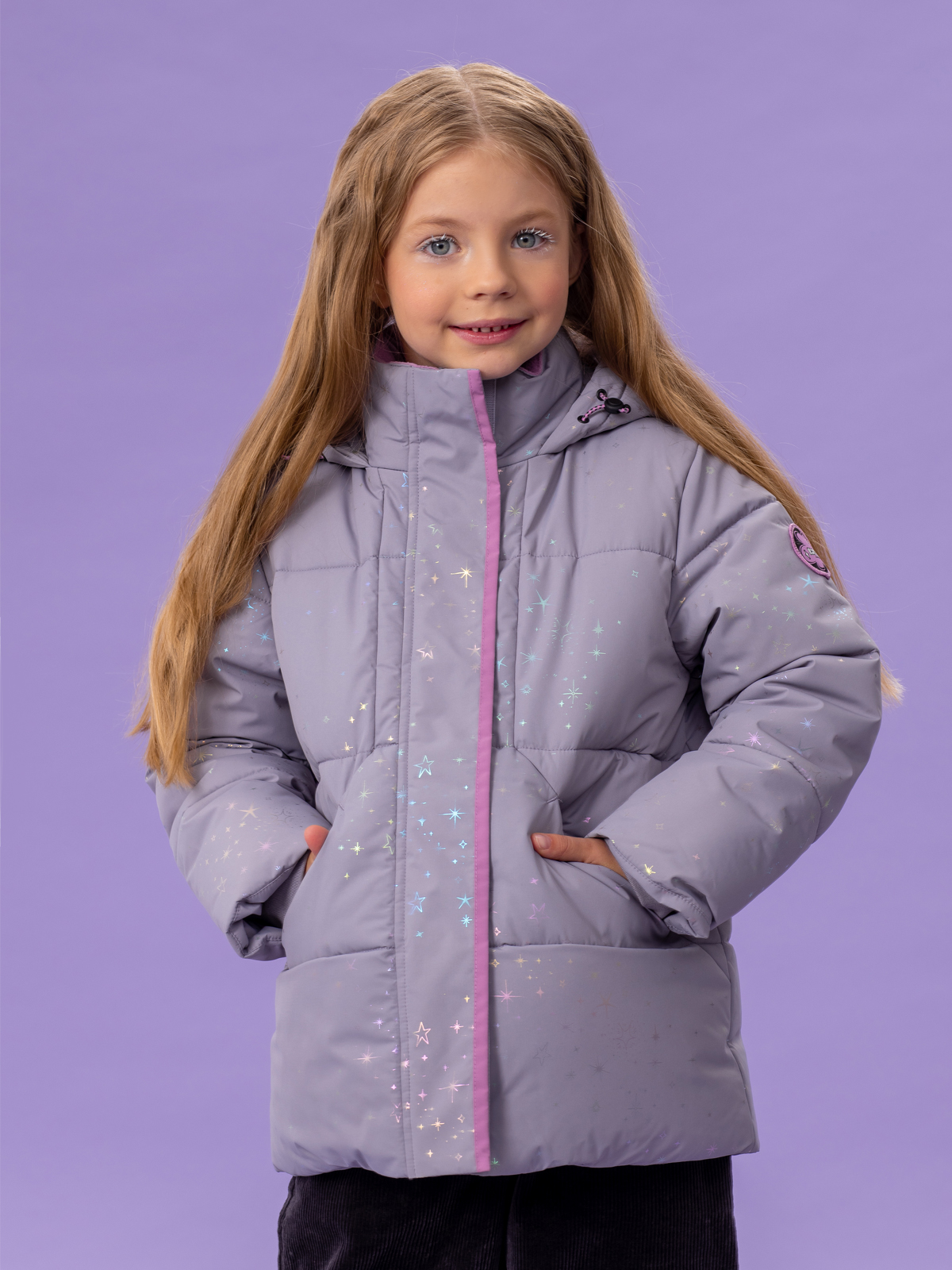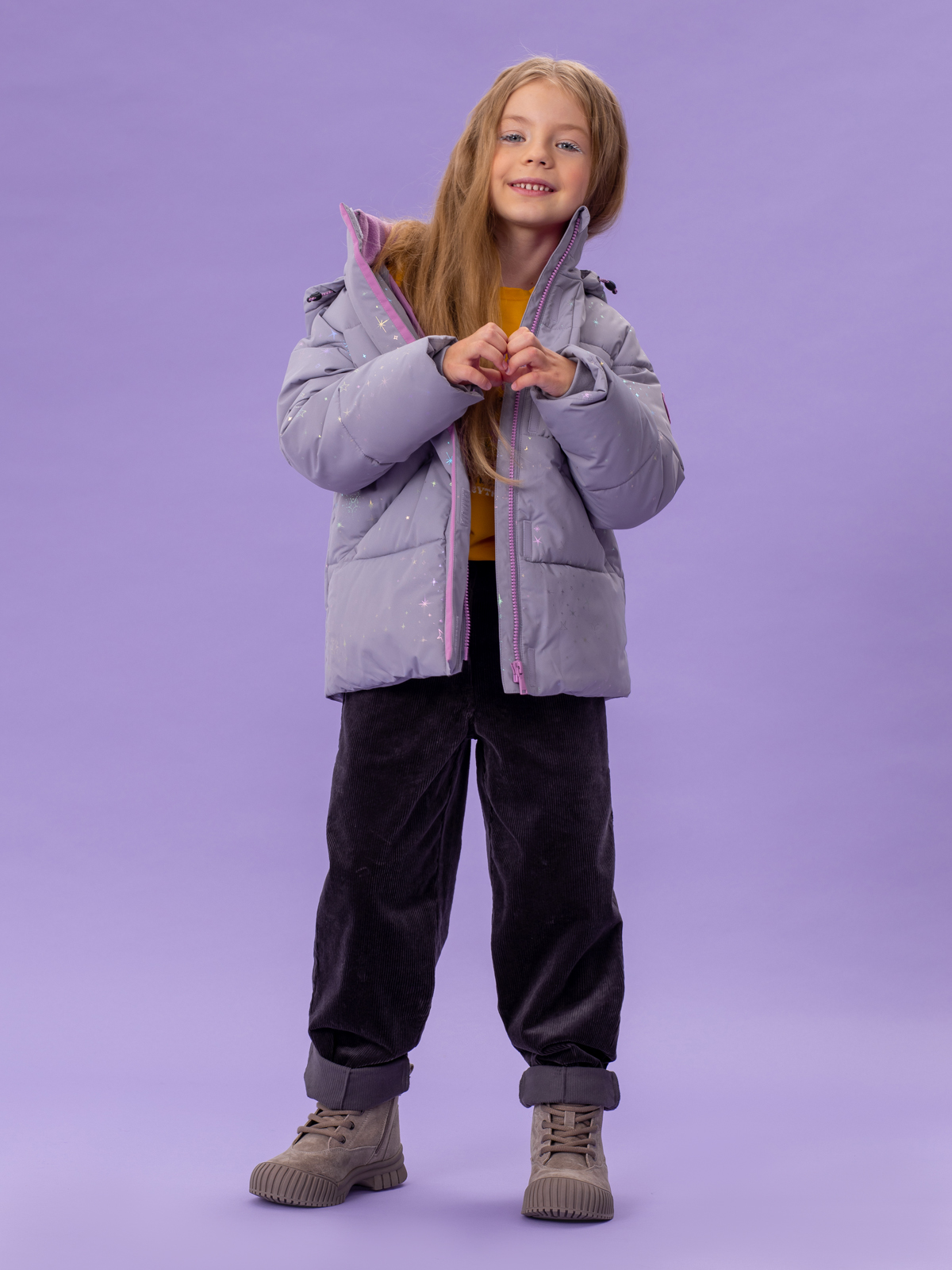 Стильная зимняя куртка для девочек сочетает в себе комфорт и модный дизайн. Серый цвет с нежным голографическим принтом создает неповторимый образ, а контрастная розовая окантовка по планке добавляет яркости. Модель выполнена из современной мембранной ткани с показателями 5000/5000, обеспечивающей надежную защиту от влаги и ветра. Утеплена качественным искусственным пухом плотностью 350 г/м², что гарантирует тепло в холодную погоду. Практичные детали включают два удобных кармана, регулируемый капюшон и надежную молнию с ветрозащитной планкой. Внутренняя подкладка из мягкого микрофлиса в розовом цвете обеспечивает дополнительный комфорт, а эластичные манжеты из риба защищают от проникновения холодного воздуха.
