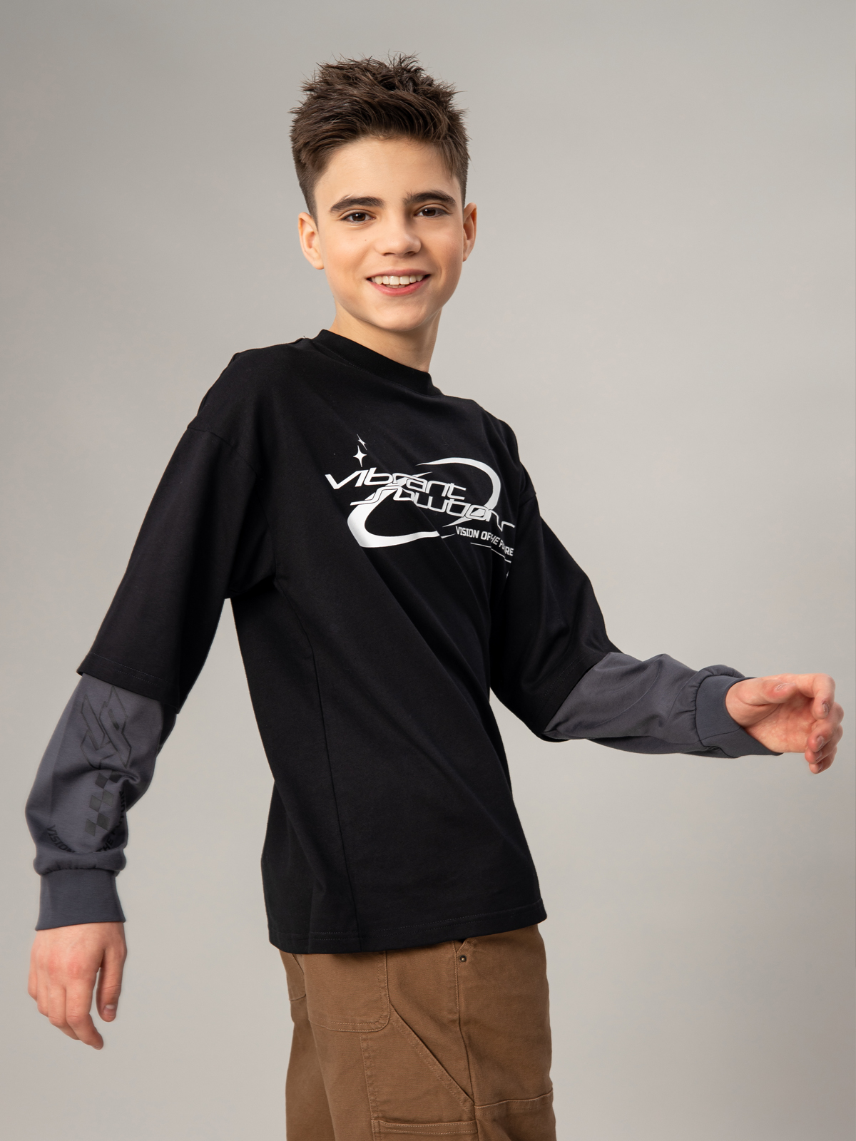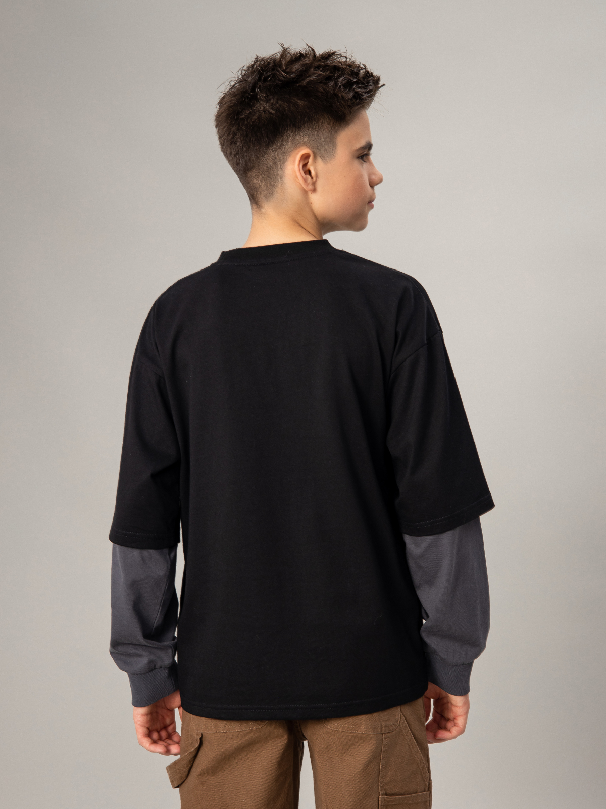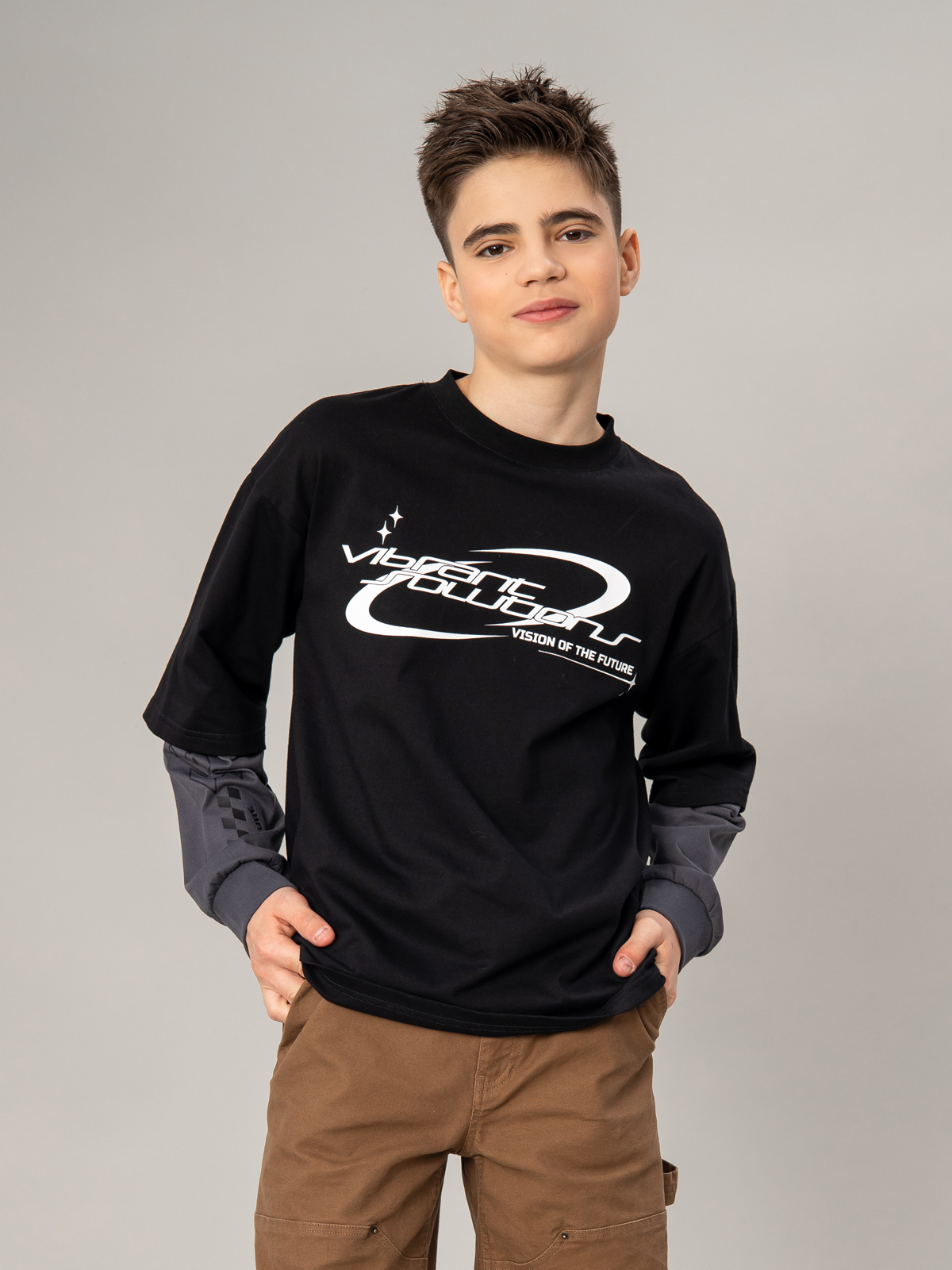 Черный лонгслив для мальчика отличается свободным силуэтом и стильным дизайном. Модель украшена выразительными принтами на груди и рукаве, которые придают изделию индивидуальность. Комфортную посадку обеспечивают эластичные рибы по горловине и низу рукавов. Хлопковая ткань отлично пропускает воздух, не вызывает аллергии и проста в уходе. Лонгслив идеально подходит для повседневной носки и активного отдыха, легко комбинируется с другой одеждой.