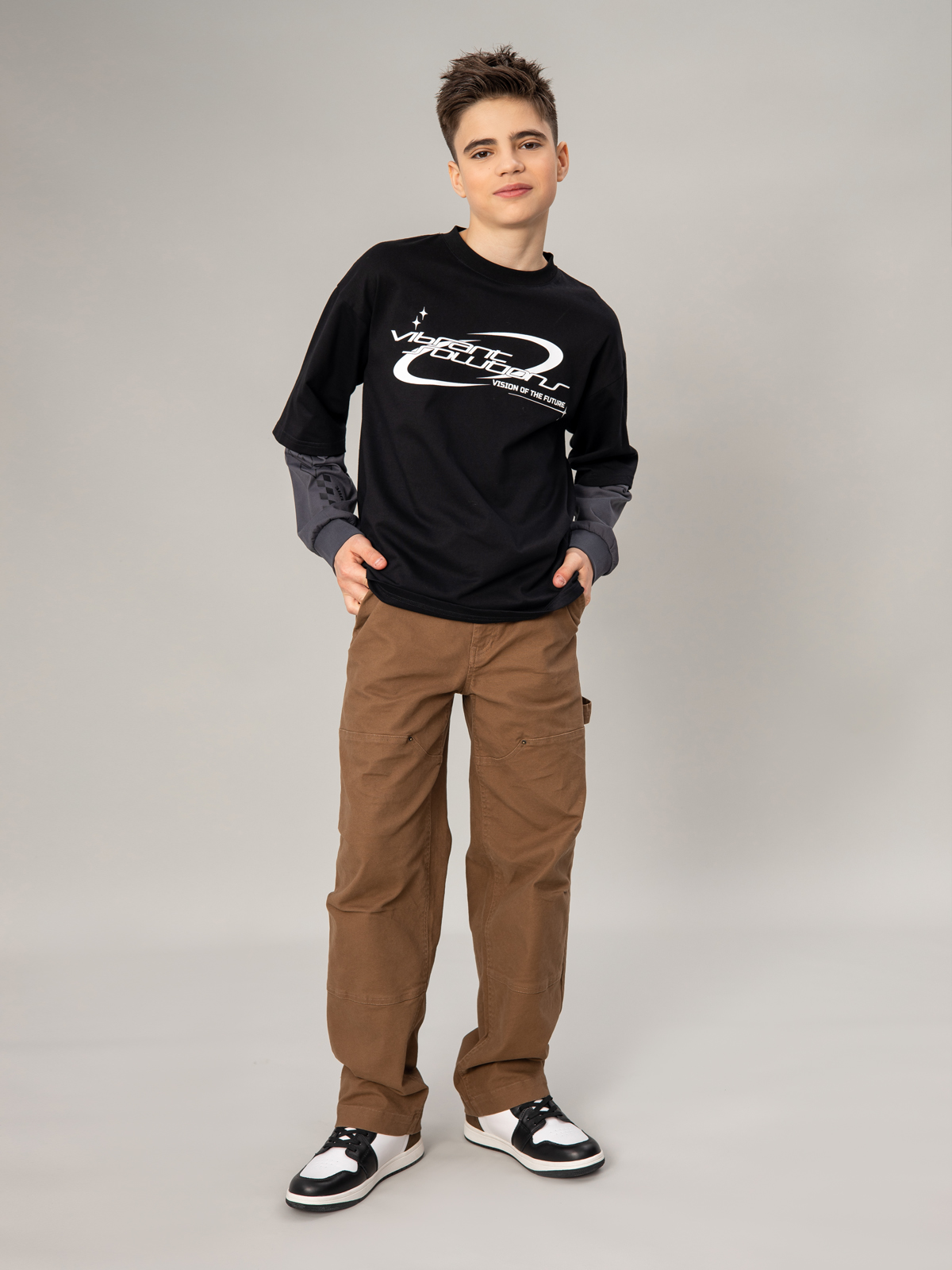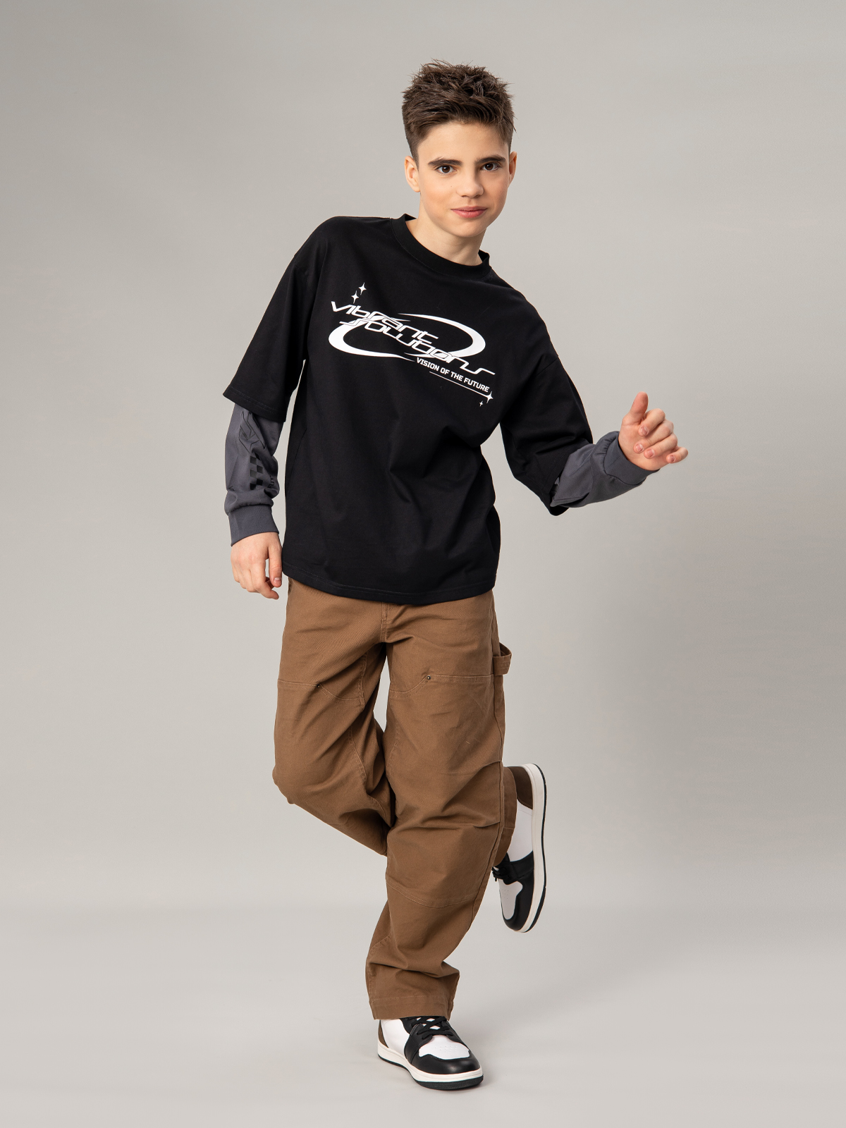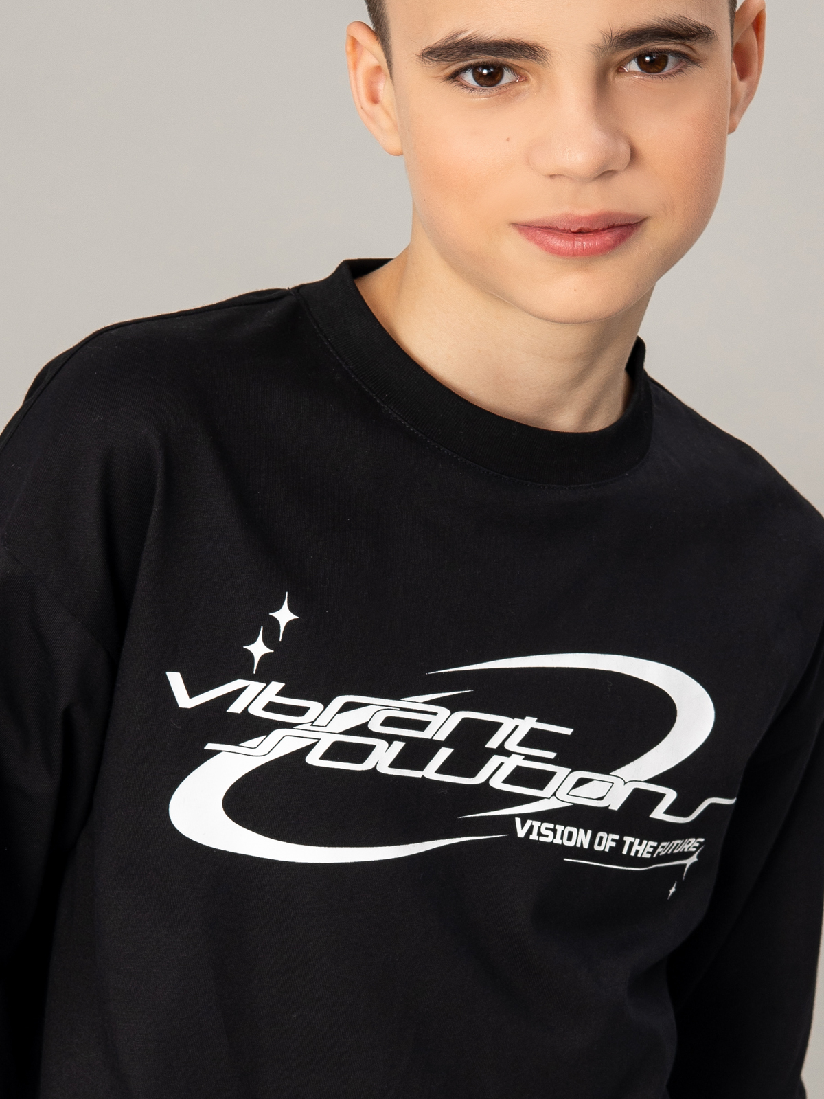Черный лонгслив для мальчика отличается свободным силуэтом и стильным дизайном. Модель украшена выразительными принтами на груди и рукаве, которые придают изделию индивидуальность. Комфортную посадку обеспечивают эластичные рибы по горловине и низу рукавов. Хлопковая ткань отлично пропускает воздух, не вызывает аллергии и проста в уходе. Лонгслив идеально подходит для повседневной носки и активного отдыха, легко комбинируется с другой одеждой.