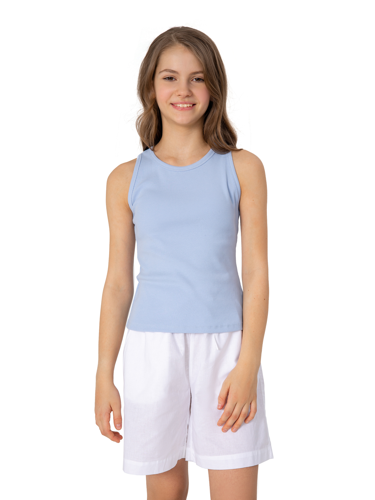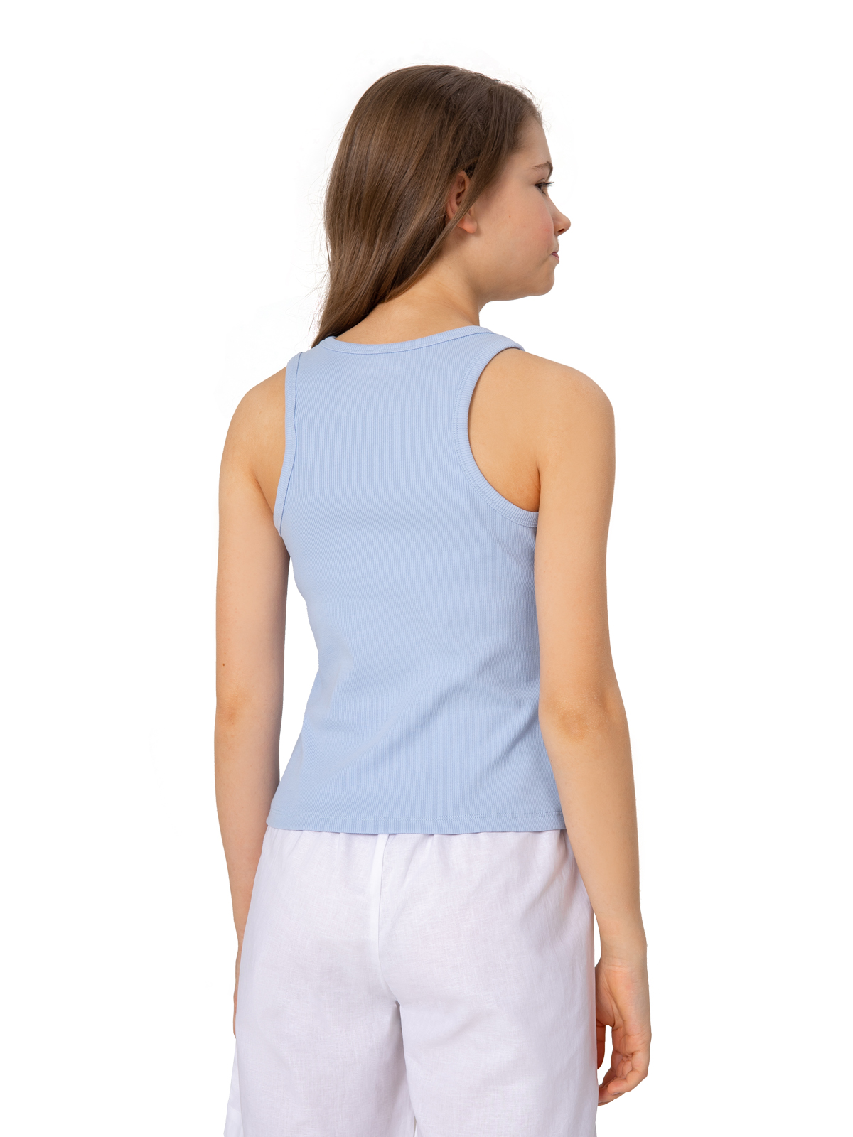 Базовый топ небесного цвета является основой для создания любого летнего образа. Простая, но стильная вещь выполнена из трикотажного материала рибана, который приятен к телу, обеспечивает хорошую растяжимость и сохраняет свою форму после стирки.