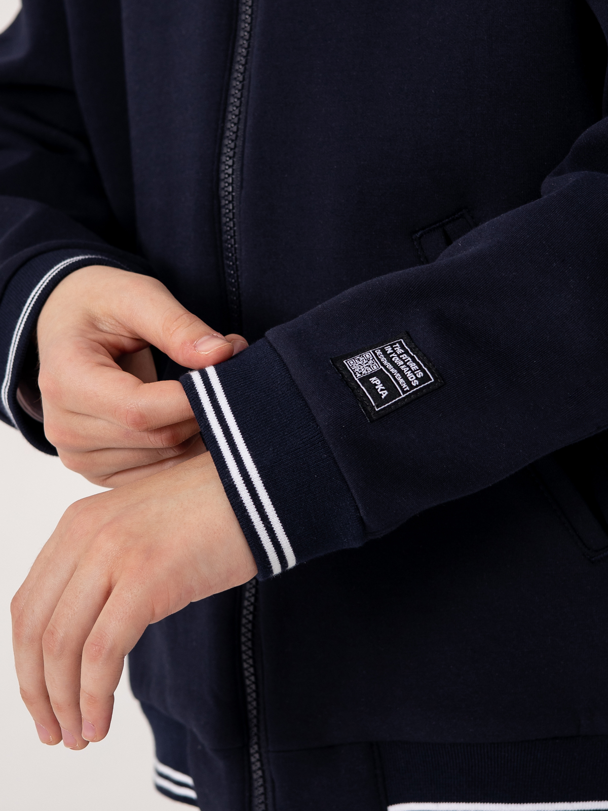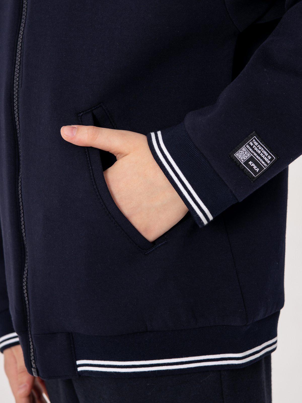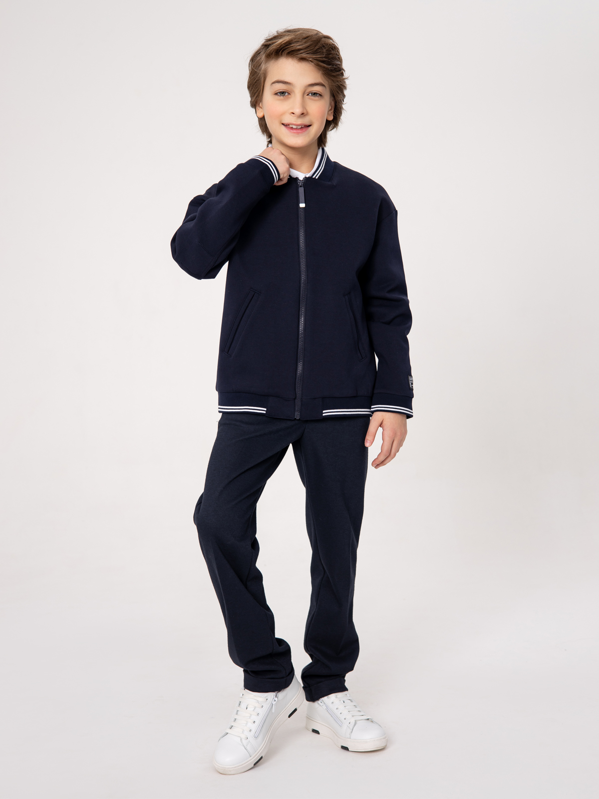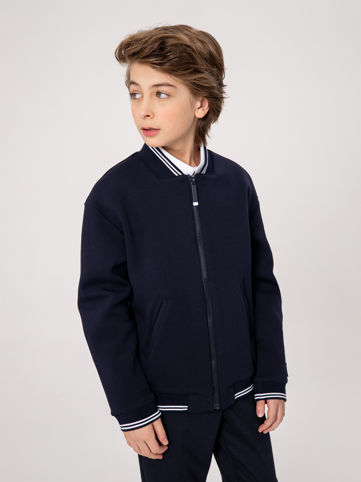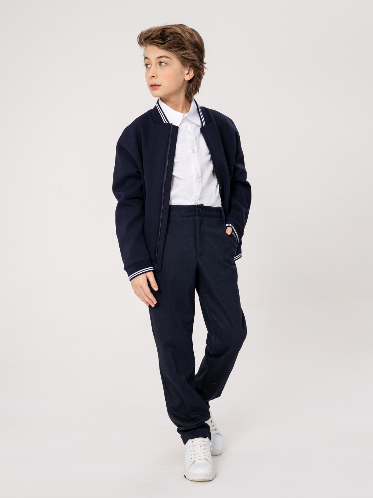 Школьн560ый пиджак-бомбер выполнен из высококачественного плотного хлопка, темно-синего цвета. Низ, воротник и манжеты пиджака для школы дополнены жаккардовой рибаной. Пиджак для школы дополнен функциональными карманами и застегивается на молнию по переду изделия. Плотный хлопок не линяет, не теряет форму, не скатывается, практически не мнется, позволяет свободно двигаться и выглядеть стильно.