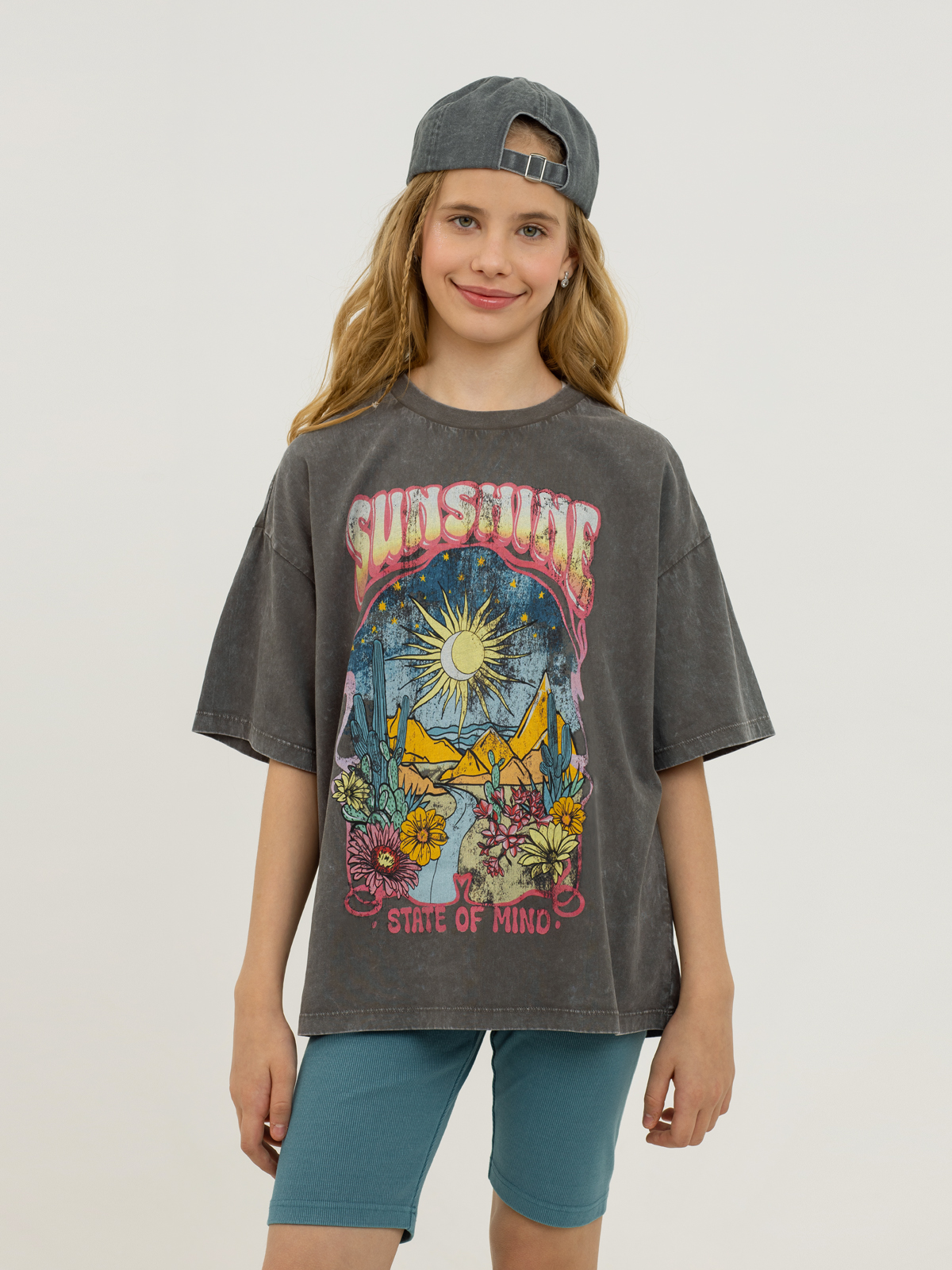 Футболка с принтом - универсальная вещь в гардеробе. Свободный прямой крой со спущенной линией плеча обеспечивает легкость движений и естественный силуэт. Круглый вырез горловины и короткие рукава добавляют изделию практичности.