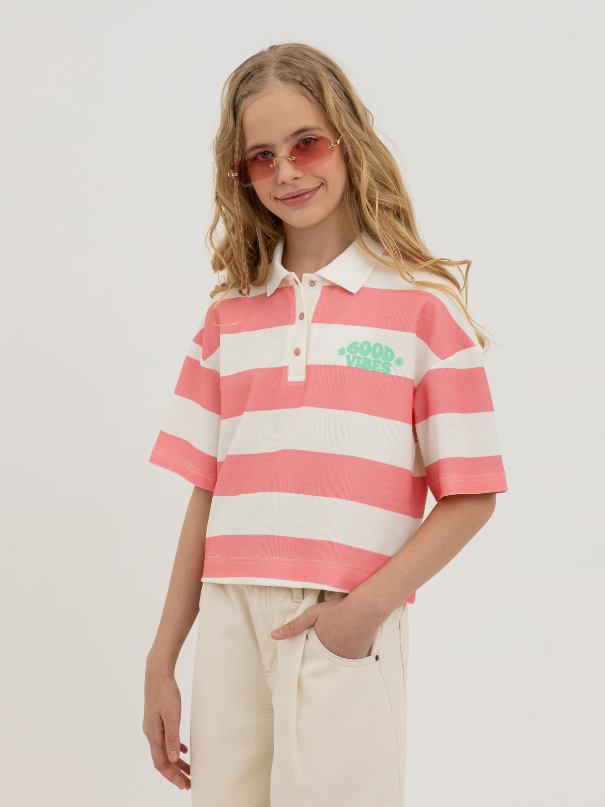Поло в полоску для девочек - универсальная вещь для любого образа. Мягкое полотно обеспечивает непревзойденный комфорт, воздухопроницаемость и нежность при взаимодействии с кожей. Свободный прямой крой гарантирует свободу движений, отложной воротник добавляет стильного акцента, а короткий рукав и планка на кнопках упрощают надевание и регулировку.