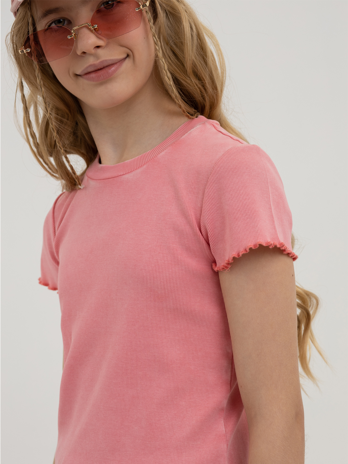 Футболка с фигурной окантовкой для девочек - универсальная модель, подходящая для повседневных и праздничных образов. Мягкий эластичный трикотаж на основе хлопка в мелкий рубчик обеспечивает комфорт. Прилегающий крой, круглый вырез, короткий рукав добавляют изделию практичности. Фигурная окантовка рукавов и подола усиливает визуальную привлекательность.