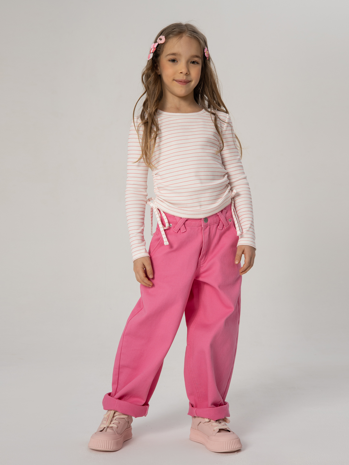 Джинсы Baggy для девочек - практичный и стильный выбор для детского гардероба. Расслабленный крой с комфортной средней посадкой и свободными брючинами полной длины не стесняют движений. Пояс со шлевками для ремня, застежка на молнию и пуговицу гарантируют удобство во время надевания и носки. Карманы идельно подходят для хранения гаджетов и полезных мелочей.