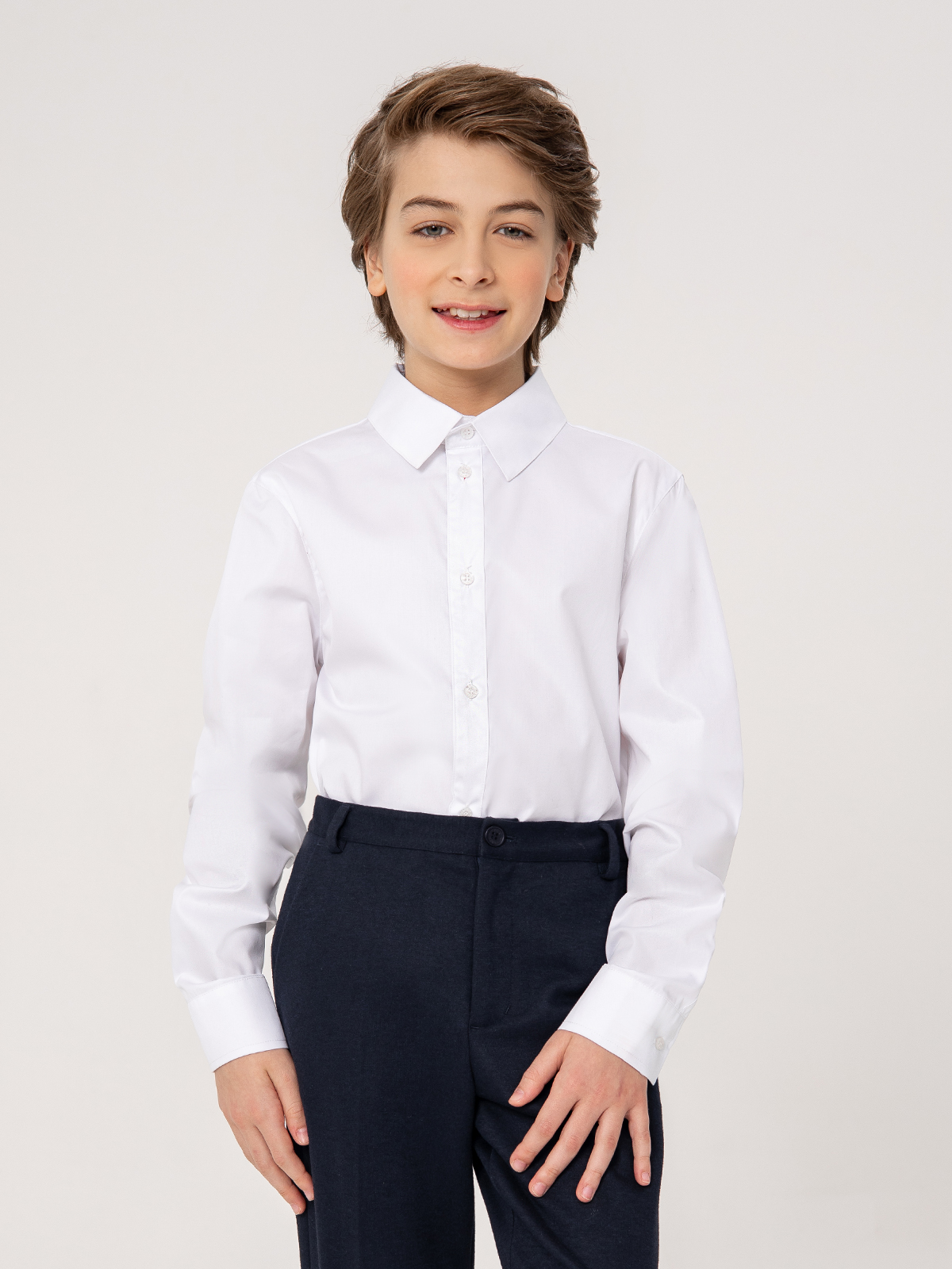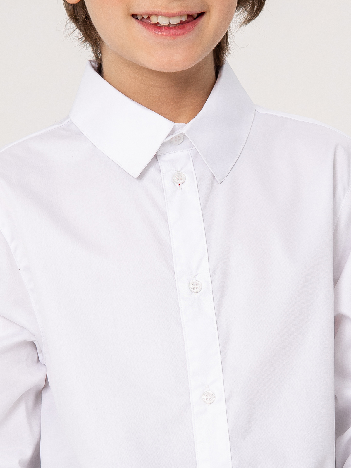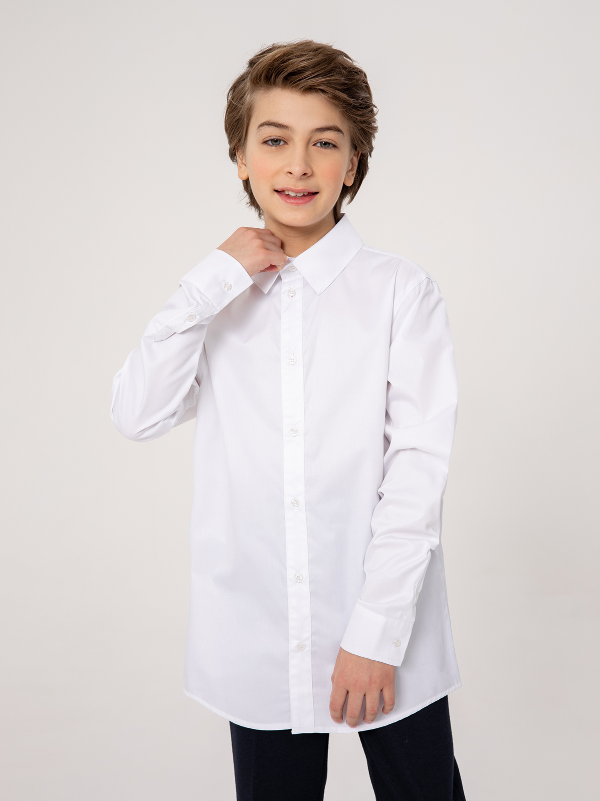 Классическая рубашка с длинным рукавом выполнена из плотного хлопка. Ткань отлично держит форму, позволяет коже дышать, небольшое добавление полиэстра уменьшает сминаемость ткани и облегчает глажку. Застегивается на пуговицы.