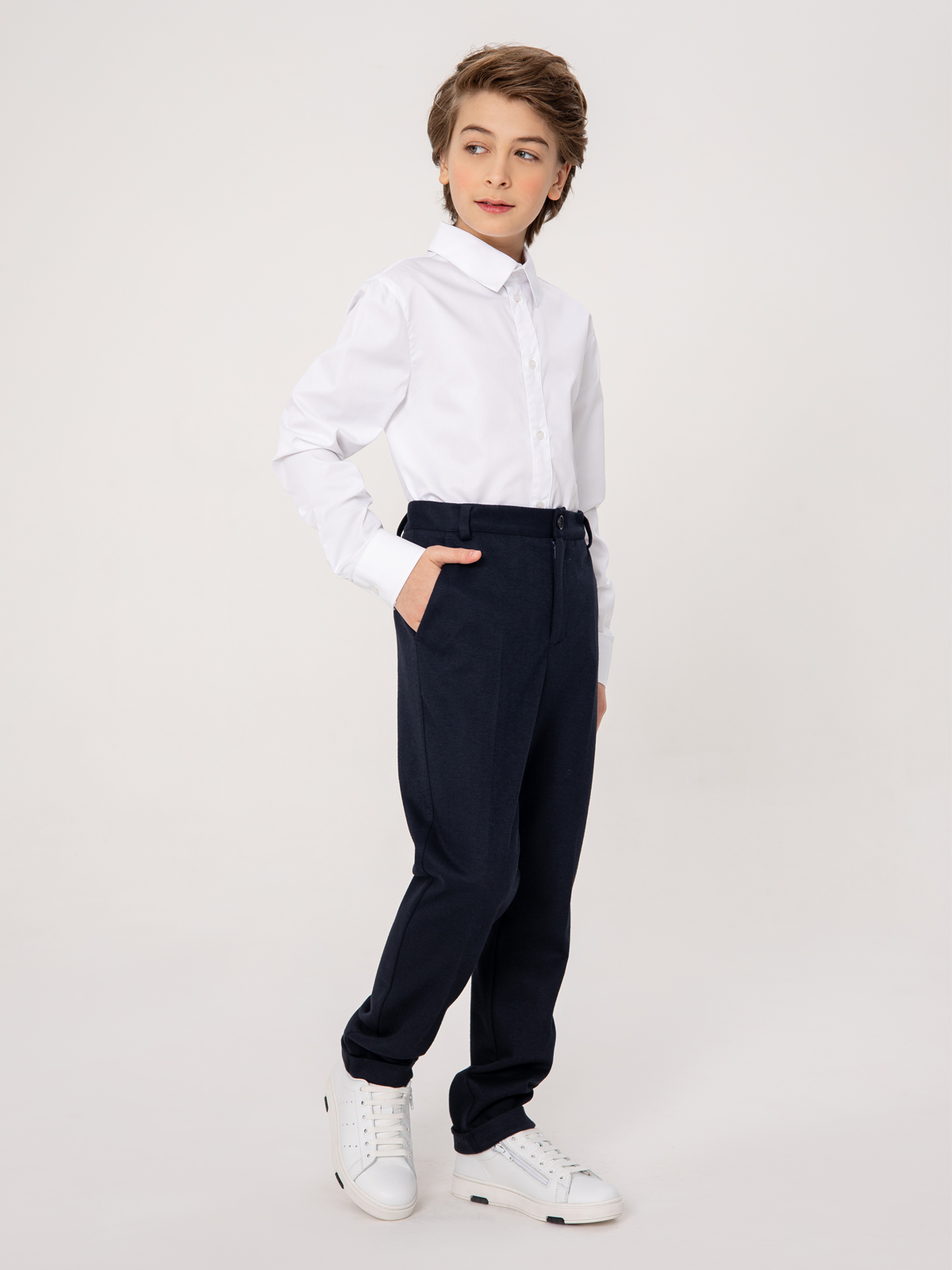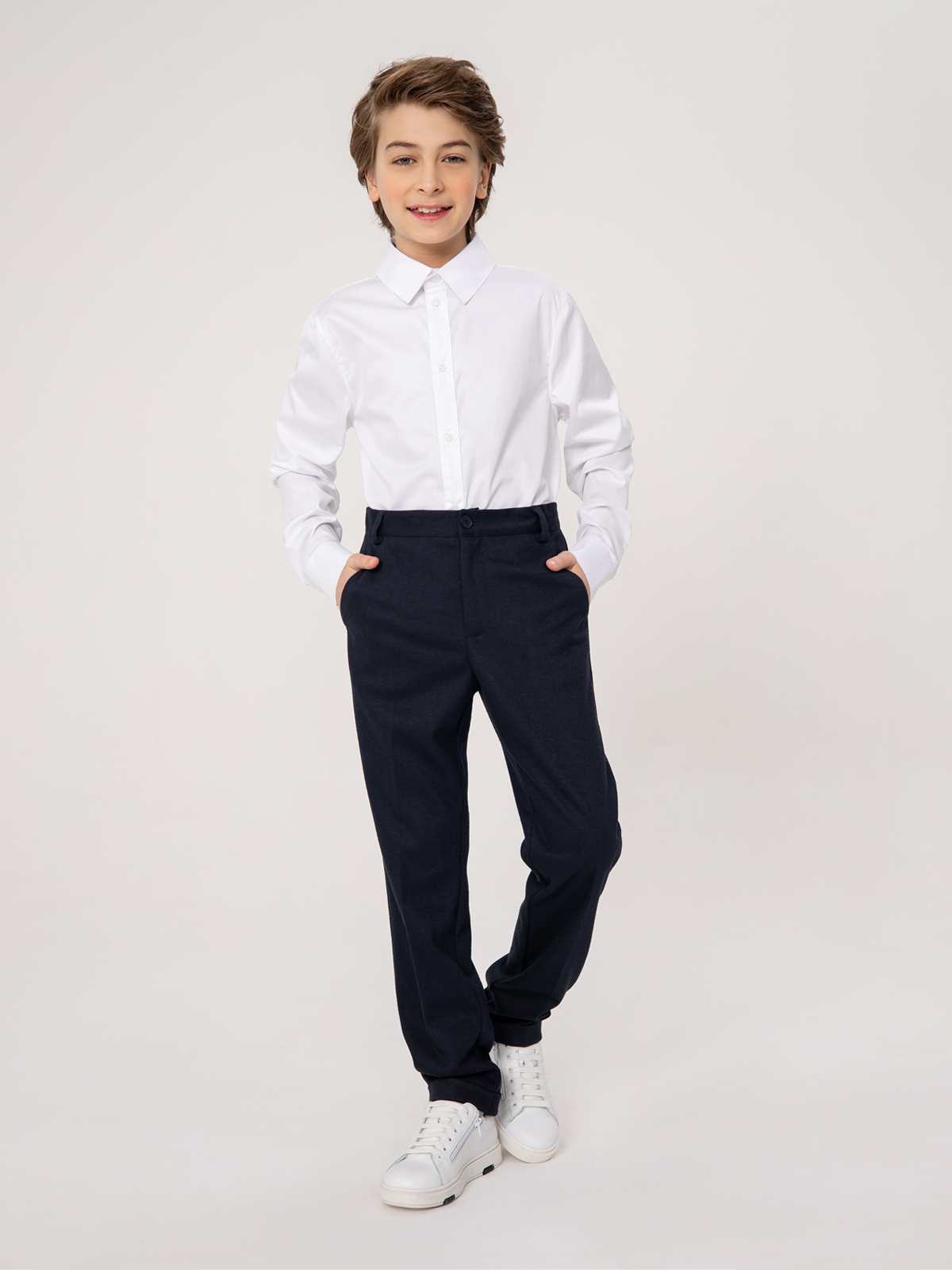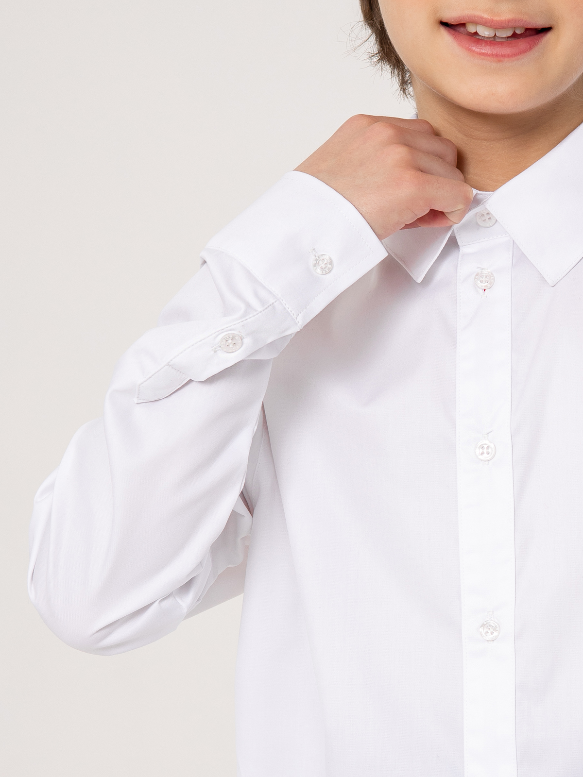 Классическая рубашка с длинным рукавом выполнена из плотного хлопка. Ткань отлично держит форму, позволяет коже дышать, небольшое добавление полиэстра уменьшает сминаемость ткани и облегчает глажку. Застегивается на пуговицы.