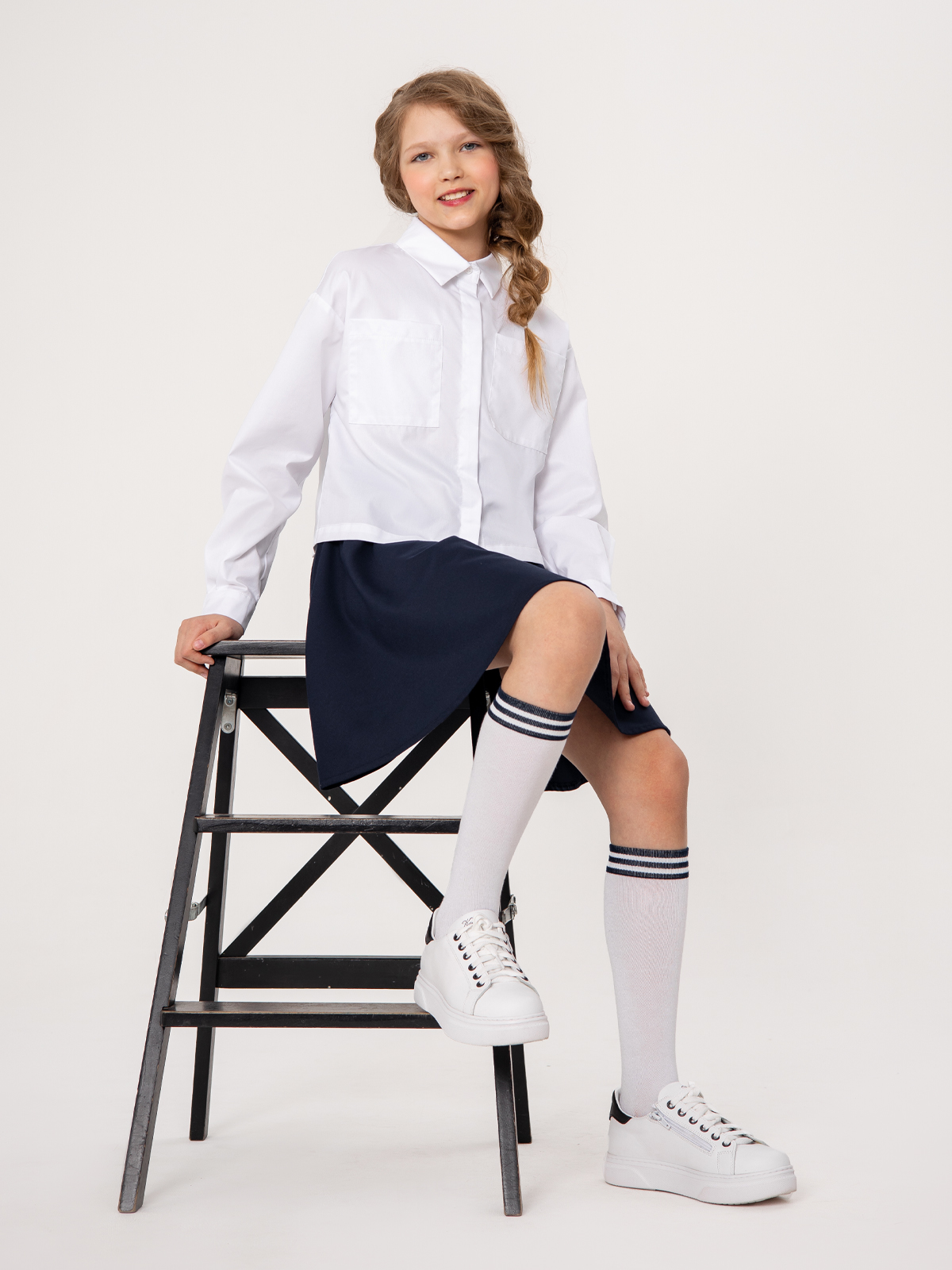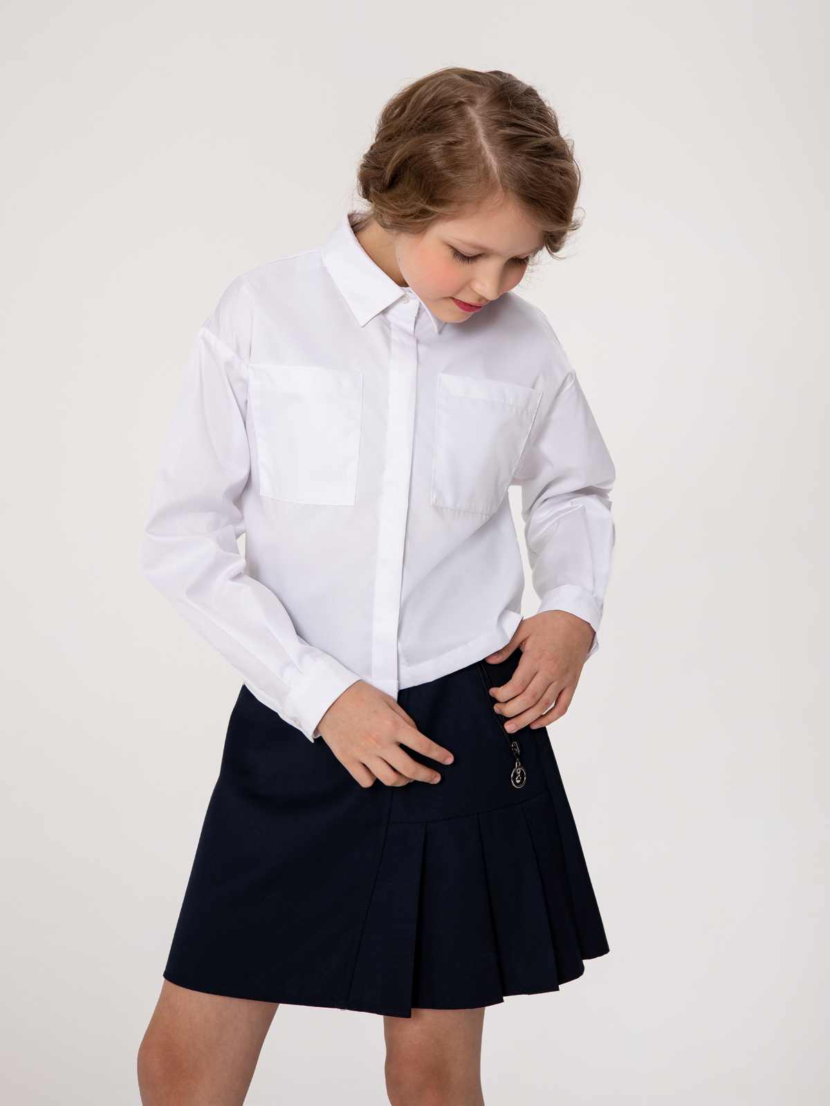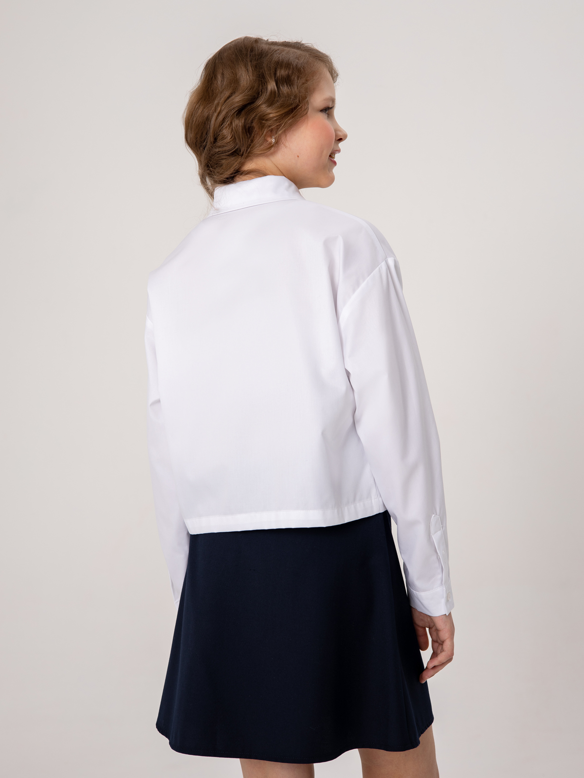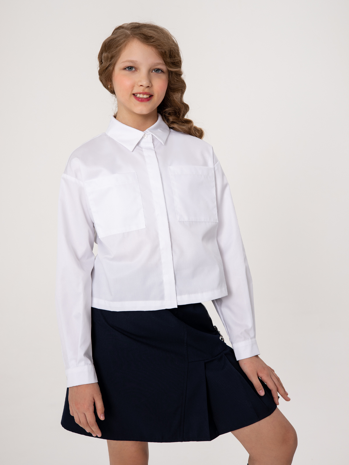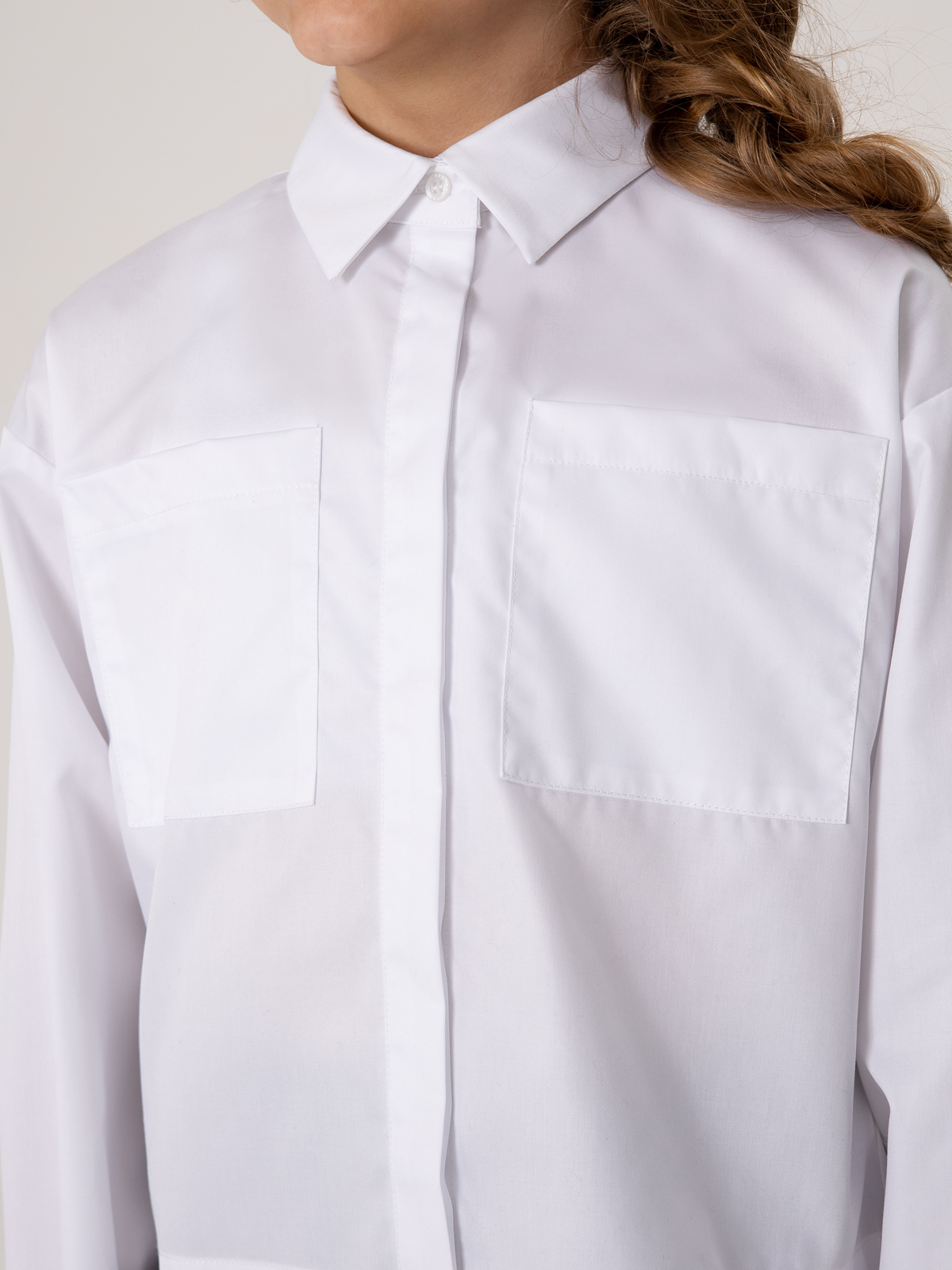 Белая школьная рубашка с длинным рукавом укороченного силуэта. Рубашка умеренный оверсайз выполнена из легкого хлопкового текстиля, комфортного в эксплуатации и уходе. Форма модели обеспечивает свободу движений, создает современные пропорции в образе. Крупные накладные карманы подчеркивают минималистичность дизайна и устраняют просвечивание.