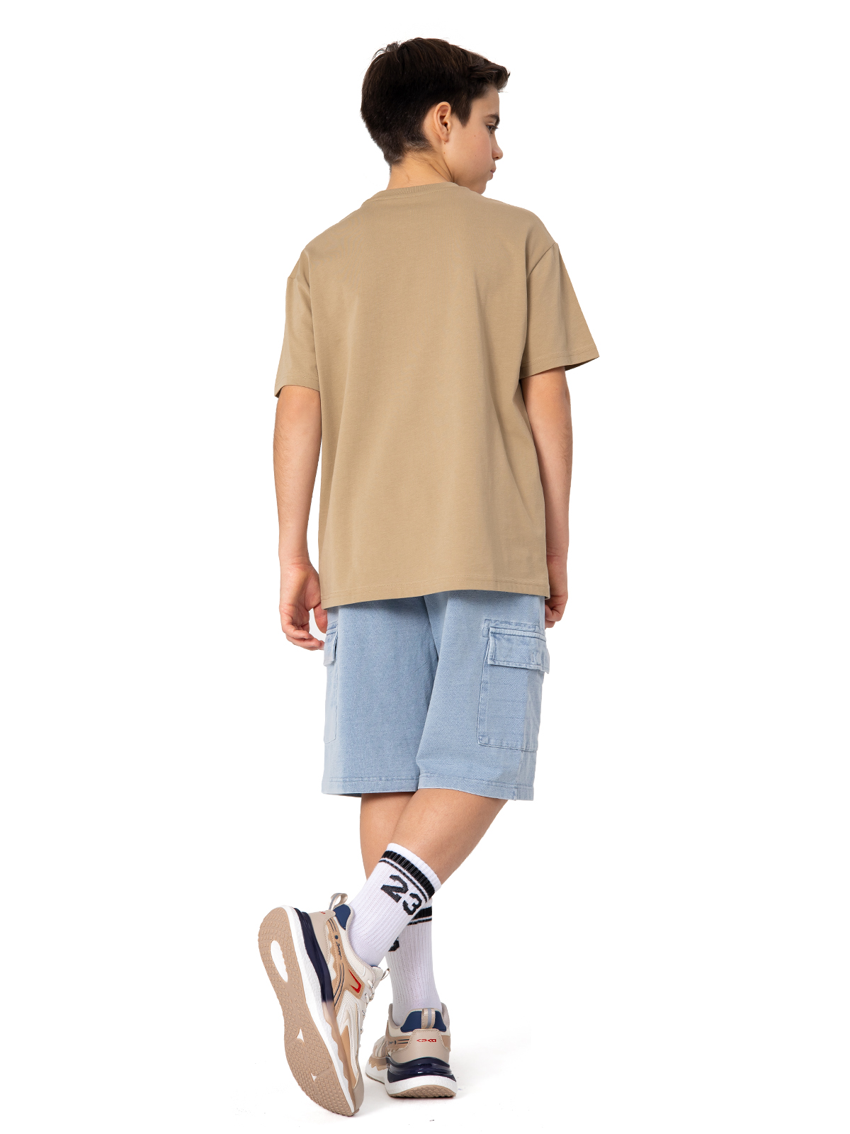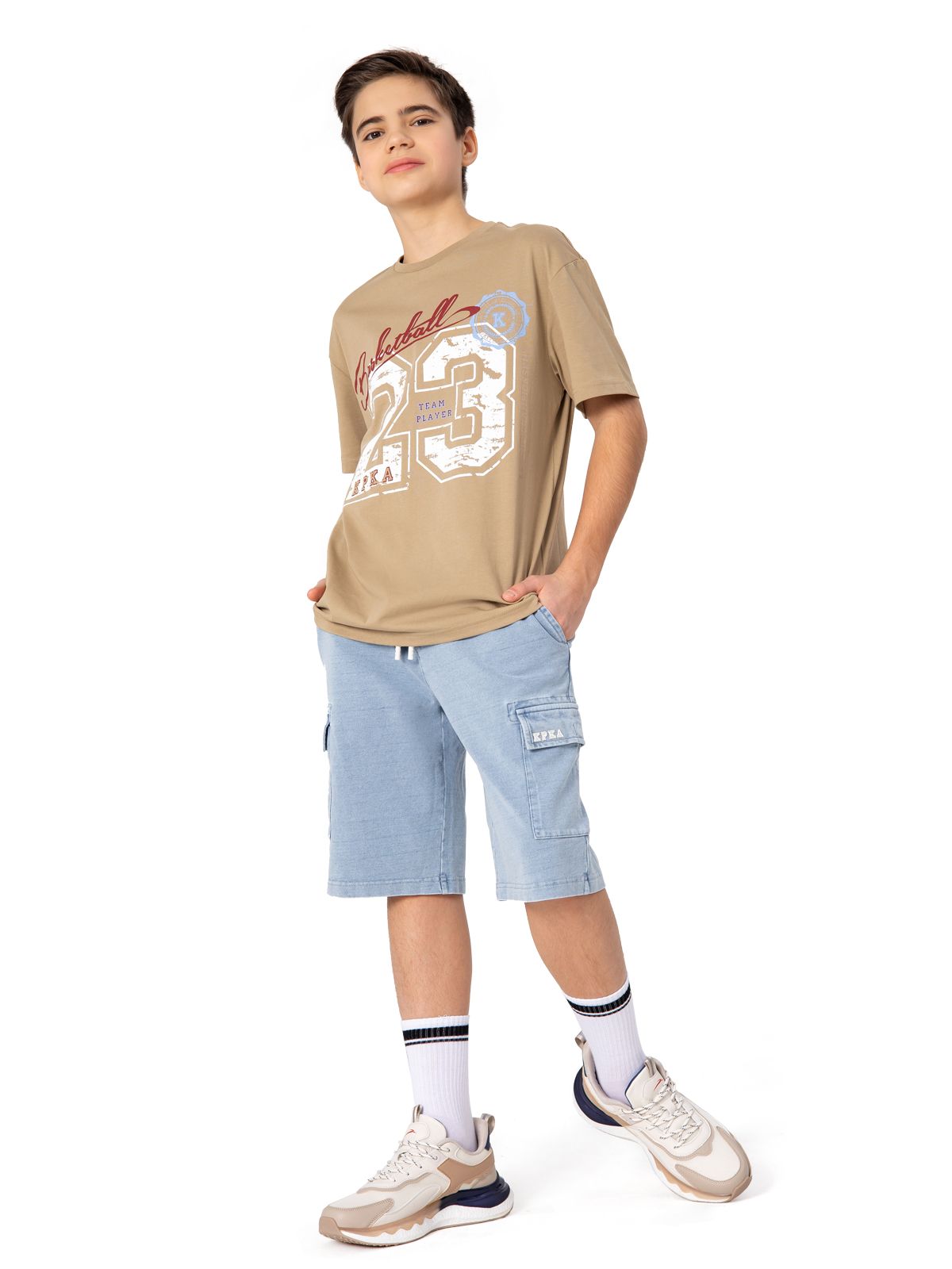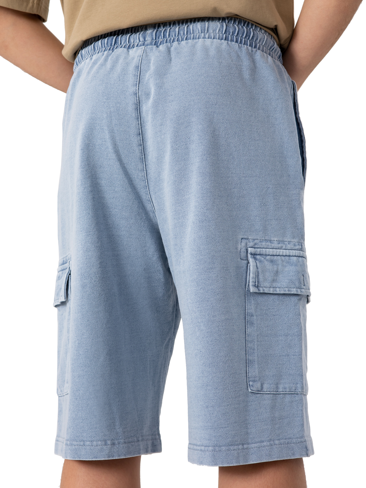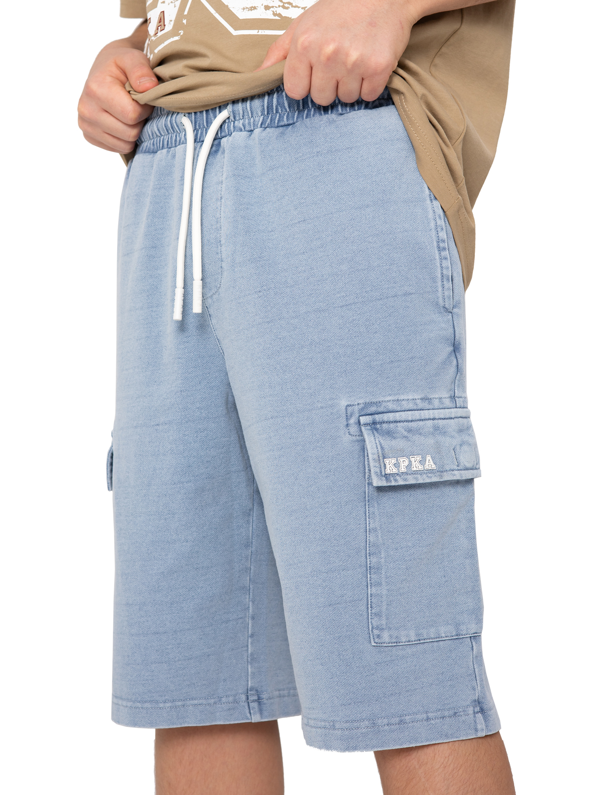 Трикотажные шорты-карго, имитирующие деним, - идеальный вариант для прогулок и активного отдыха на природе. Свободный крой не сковывает движений. Голубые шорты выполнены из трикотажной ткани футер, которая делает их идеальными для летних дней. Отлично тянутся и сохраняют форму даже после частых стирок. Мягкий шнурок помогает регулировать посадку, а эластичная резинка в поясе нежно прилегает к телу и не сдавливает кожу. По бокам расположены вместительные накладные карманы. Комбинируется с футболкой арт. NJBCT20-Z2 и толстовкой арт. NJBCJ04-Z2